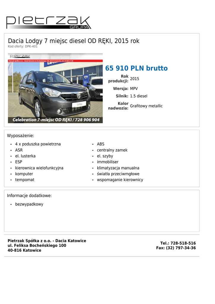 Dacia Lodgy 7 miejsc diesel OD RĘKI, 2015 rok Kod oferty: DPK-401 65 910 PLN brutto Rok 2015 produkcji: Wersja: MPV Silnik: 1.5 diesel Kolor Grafitowy metallic nadwozia: Wyposażenie: - 4 x poduszka powietrzna ASR el. lusterka ESP kierownica wielofunkcyjna komputer tempomat - ABS centralny zamek el. szyby immobiliser klimatyzacja manualna światła przeciwmgłowe wspomaganie kierownicy Informacje dodatkowe: - bezwypadkowy Pietrzak Spółka z o.o. - Dacia Katowice ul. Feliksa Bocheńskiego 100 40-816 Katowice Tel.: 728-518-516 Fax: (32) 797-34-36