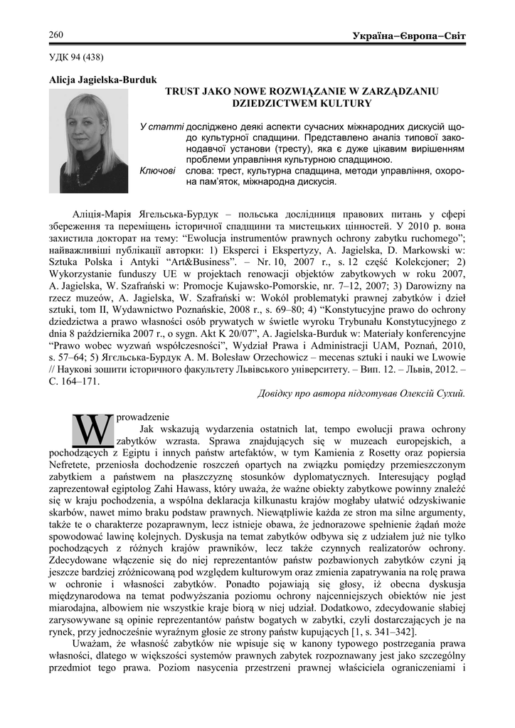 260 Україна–Європа–Світ УДК 94 (438) Alicja Jagielska-Burduk TRUST JAKO NOWE ROZWIĄZANIE W ZARZĄDZANIU DZIEDZICTWEM KULTURY У статті досліджено деякі аспекти сучасних міжнародних дискусій щодо культурної спадщини. Представлено аналіз типової законодавчої установи (тресту), яка є дуже цікавим вирішенням проблеми управління культурною спадщиною. Ключові слова: трест, культурна спадщина, методи управління, охорона пам’яток, міжнародна дискусія. Аліція-Марія Ягельська-Бурдук – польська дослідниця правових питань у сфері збереження та переміщень історичної спадщини та мистецьких цінностей. У 2010 р. вона захистила докторат на тему: “Ewolucja instrumentów prawnych ochrony zabytku ruchomego”; найважливіші публікації авторки: 1) Eksperci i Ekspertyzy, A. Jagielska, D. Markowski w: Sztuka Polska i Antyki “Art&Business”. – Nr. 10, 2007 r., s. 12 część Kolekcjoner; 2) Wykorzystanie funduszy UE w projektach renowacji objektów zabytkowych w roku 2007, A. Jagielska, W. Szafrański w: Promocje Kujawsko-Pomorskie, nr. 7–12, 2007; 3) Darowizny na rzecz muzeów, A. Jagielska, W. Szafrański w: Wokól problematyki prawnej zabytków i dzieł sztuki, tom II, Wydawnictwo Poznańskie, 2008 r., s. 69–80; 4) “Konstytucyjne prawo do ochrony dziedzictwa a prawo własności osób prywatych w świetle wyroku Trybunału Konstytucyjnego z dnia 8 października 2007 r., o sygn. Akt K 20/07”, A. Jagielska-Burduk w: Materiały konferencyjne “Prawo wobec wyzwań współczesności”, Wydział Prawa i Administracji UAM, Poznań, 2010, s. 57–64; 5) Ягєльська-Бурдук А. М. Bolesław Orzechowicz – mеcenas sztuki i nauki we Lwowie // Наукові зошити історичного факультету Львівського університету. – Вип. 12. – Львів, 2012. – С. 164–171. Довідку про автора підготував Олексій Сухий. W prowadzenie Jak wskazują wydarzenia ostatnich lat, tempo ewolucji prawa ochrony zabytków wzrasta. Sprawa znajdujących się w muzeach europejskich, a pochodzących z Egiptu i innych państw artefaktów, w tym Kamienia z Rosetty oraz popiersia Nefretete, przeniosła dochodzenie roszczeń opartych na związku pomiędzy przemieszczonym zabytkiem a państwem na płaszczyznę stosunków dyplomatycznych. Interesujący pogląd zaprezentował egiptolog Zahi Hawass, który uważa, że ważne obiekty zabytkowe powinny znaleźć się w kraju pochodzenia, a wspólna deklaracja kilkunastu krajów mogłaby ułatwić odzyskiwanie skarbów, nawet mimo braku podstaw prawnych. Niewątpliwie każda ze stron ma silne argumenty, także te o charakterze pozaprawnym, lecz istnieje obawa, że jednorazowe spełnienie żądań może spowodować lawinę kolejnych. Dyskusja na temat zabytków odbywa się z udziałem już nie tylko pochodzących z różnych krajów prawników, lecz także czynnych realizatorów ochrony. Zdecydowane włączenie się do niej reprezentantów państw pozbawionych zabytków czyni ją jeszcze bardziej zróżnicowaną pod względem kulturowym oraz zmienia zapatrywania na rolę prawa w ochronie i własności zabytków. Ponadto pojawiają się głosy, iż obecna dyskusja międzynarodowa na temat podwyższania poziomu ochrony najcenniejszych obiektów nie jest miarodajna, albowiem nie wszystkie kraje biorą w niej udział. Dodatkowo, zdecydowanie słabiej zarysowywane są opinie reprezentantów państw bogatych w zabytki, czyli dostarczających je na rynek, przy jednocześnie wyraźnym głosie ze strony państw kupujących [1, s. 341–342]. Uważam, że własność zabytków nie wpisuje się w kanony typowego postrzegania prawa własności, dlatego w większości systemów prawnych zabytek rozpoznawany jest jako szczególny przedmiot tego prawa. Poziom nasycenia przestrzeni prawnej właściciela ograniczeniami i Збірник наукових праць 261 kilkakrotnie wyrażone w literaturze głosy o możliwości przekształcenia dotychczasowego prawa w inne otwierają nowy etap rozważań na temat własności zabytków w prawie polskim. Własność oraz dochodzenie przysługujących właścicielowi praw w stosunku do przedmiotu mogą okazać się negatywne w skutkach dla zabytku na równi z brakiem aktywności ze strony państwa. Trwały charakter ograniczeń pozwala sądzić, że to przedmiot powinien determinować prawo istniejące na nim, a nie odwrotnie. W takim stanie rzeczy zasadne wydaje się podjęcie analizy instytucji prawnych, które mogłyby pogodzić prawa dysponenta ze skuteczną ochroną zabytku. Ze względu na internacjonalizację dyskusji o własności zabytków, w moim przekonaniu, uzasadnione jest poszerzenie kręgu badanych pod kątem wykorzystania w prawie zabytków instytucji prawnych o instytucje pochodzące z systemu common law. W niniejszym opracowaniu zostanie ukazana instytucja powiernictwa (zamiennie trust), którą można postrzegać nie tylko jako anglosaski odpowiednik polskiej fundacji, ale też ze względu na fakt wyodrębnienia majątku oraz możność rozporządzania nim bez szkody dla jego składników jako instytucję, której potencjalne zastosowanie w ochronie zabytków zasługuje na rozważenie. Wykorzystanie powiernictwa w ochronie zabytków Powiernictwo jako sformułowanie oderwane od ścisłej instytucji prawnej systemu common law, pojawiło się w dyskusjach o ochronie zabytków w połowie XX w. James T. Bodet, Sekretarz Generalny UNESCO, w 1950 r. stwierdził, że “istni
