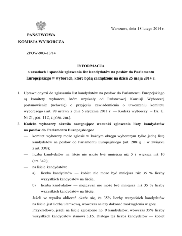 Warszawa, dnia 18 lutego 2014 r. PAŃSTWOWA KOMISJA WYBORCZA ZPOW-903-13/14 INFORMACJA o zasadach i sposobie zgłaszania list kandydatów na posłów do Parlamentu Europejskiego w wyborach, które będą zarządzone na dzień 25 maja 2014 r. 1. Uprawnionymi do zgłaszania list kandydatów na posłów do Parlamentu Europejskiego są komitety wyborcze, które uzyskały od Państwowej Komisji Wyborczej postanowienie (uchwałę) o przyjęciu zawiadomienia o utworzeniu komitetu wyborczego (art. 98 ustawy z dnia 5 stycznia 2011 r. — Kodeks wyborczy – Dz. U. Nr 21, poz. 112, z późn. zm.). 2. Kodeks wyborczy określa następujące warunki zgłoszenia listy kandydatów na posłów do Parlamentu Europejskiego: — komitet wyborczy może zgłosić w każdym okręgu wyborczym tylko jedną listę kandydatów na posłów do Parlamentu Europejskiego (art. 208 § 1 w związku z art. 338); — liczba kandydatów na liście nie może być mniejsza niż 5 i większa niż 10 (art. 342); — na liście kandydatów: a) liczba kandydatów — kobiet nie może być mniejsza niż 35 % liczby wszystkich kandydatów na liście, b) liczba kandydatów — mężczyzn nie może być mniejsza niż 35 % liczby wszystkich kandydatów na liście. Jeżeli w wyniku obliczeń okaże się, że 35% liczby wszystkich kandydatów na liście jest liczbą ułamkową, wówczas należy dokonać zaokrąglenia w górę. Przykładowo, jeżeli na liście zgłoszono np. 9 kandydatów, wówczas 35% liczby wszystkich kandydatów stanowi 3,15. Dlatego też liczba kandydatów — kobiet —2— zgłaszanych na takiej liście nie może być mniejsza niż 4 i liczba kandydatów — mężczyzn nie może być mniejsza niż 4 (art. 211 § 3 w związku z art. 338); — kandydat na posła do Parlamentu Europejskiego może być zgłoszony tylko w jednym okręgu i tylko z jednej listy kandydatów na posłów do Parlamentu Europejskiego (art. 208 § 2 w związku z art. 338); — kandydatem na posła w wyborach do Parlamentu Europejskiego może być osoba (obywatel polski i obywatel Unii Europejskiej niebędący obywatelem polskim) mająca prawo wybierania w tych wyborach i która: a) najpóźniej w dniu głosowania kończy 21 lat, b) od co najmniej 5 lat stale zamieszkuje w Rzeczypospolitej Polskiej lub na terytorium innego państwa członkowskiego Unii Europejskiej (art. 11 § 1 pkt 4). — Nie może być kandydatem na posła do Parlamentu Europejskiego osoba: a) pozbawiona praw publicznych prawomocnym orzeczeniem sądu, b) pozbawiona praw wyborczych prawomocnym orzeczeniem Trybunału Stanu, c) ubezwłasnowolniona prawomocnym orzeczeniem sądu, d) skazana prawomocnym wyrokiem na karę pozbawienia wolności za przestępstwo umyślne ścigane z oskarżenia publicznego lub umyślne przestępstwo skarbowe, e) wobec której wydano prawomocne orzeczenie sądu stwierdzające utratę prawa wybieralności, o którym mowa w art. 21a ust. 2a ustawy z dnia 18 października 2006 r. o ujawnianiu informacji o dokumentach organów bezpieczeństwa państwa z lat 1944-1990 oraz treści tych dokumentów (Dz. U. z 2013 r. poz. 1388). Kandydatem na posła do Parlamentu Europejskiego nie może być również obywatel Unii Europejskiej niebędący obywatelem polskim, pozbawiony prawa wybieralności w państwie członkowskim Unii Europejskiej, którego jest obywatelem; — lista kandydatów na posłów do Parlamentu Europejskiego powinna być poparta podpisami co najmniej 10 000 wyborców stale zamieszkałych w danym okręgu wyborczym (art. 343), wymóg ten nie obowiązuje gdy do zgłoszenia dołączono zaświadczenie Państwowej Komisji Wyborczej o uprawnieniu danego komitetu —3— do zgłaszania list bez poparcia podpisami wyborców (art. 210 § 2 i 3 w związku z art. 338). Listę kandydatów na posłów do Parlamentu Europejskiego w danym okręgu wyborczym zgłasza się do właściwej okręgowej komisji wyborczej nie później niż do godz. 24.00 w dniu 15 kwietnia 2014 r. 3. Uprawnionym do zgłoszenia listy kandydatów w imieniu komitetu wyborczego jest pełnomocnik wyborczy komitetu wyborczego (zwany dalej pełnomocnikiem wyborczym) lub osoba imiennie przez niego upoważniona (art. 211 § 4 w związku z art. 338). Upoważnienie powinno zawierać pełną nazwę komitetu wyborczego oraz nazwisko i imię pełnomocnika wyborczego udzielającego upoważnienia, wskazanie zakresu udzielonego upoważnienia oraz dane osoby upoważnionej. Treść upoważnienia powinna zawierać wyraźne stwierdzenie, iż osoba wymieniona w upoważnieniu — z podaniem jej nazwiska, imion, adresu zamieszkania i numeru ewidencyjnego PESEL (w przypadku obywatela Unii Europejskiej niebędącego obywatelem polskim — numeru paszportu lub innego dokumentu stwierdzającego tożsamość) — została upoważniona przez pełnomocnika wyborczego do zgłoszenia listy kandydatów (lub list) w imieniu wymienionego z nazwy komitetu wyborczego w okręgu wyborczym nr ........ (lub okręgach wyborczych nr ...................). Zakres upoważnienia może obejmować również wyznaczanie mężów zaufania do obwodowych komisji wyborczych (wystawianie im stosownych zaświadczeń), a także pełnienie funkcji męża zaufania przy wskazanej okręgowej komisji wyborczej lub rejonowej komisji wyborczej. Upoważnienie powinno być opatrzone datą wystawienia i własnoręcznym podpisem pełnomocnika wyborczego. Listę kandydatów zgłasza osobiście, na piśmie, pełnomocnik wyborczy lub osoba przez niego upoważniona (art. 211 § 4 w związku z art. 338). 4. W zgłoszeniu należy wskazać: — nazwisko i imię osoby zgłaszającej listę kandydatów ze wskazaniem, czy zgłoszenia dokonuje pełnomocnik wyborczy czy upoważniona przez niego osoba; — nazwę komitetu wyborczego, w którego imieniu dokonywane jest zgłoszenie listy kandydatów ze wskazaniem adresu jego siedziby; —4— — oznaczenie numeru okręgu wyborczego, w którym zgłaszana jest lista kandydatów; — nazwisko, imię (wszystkie imiona zgo