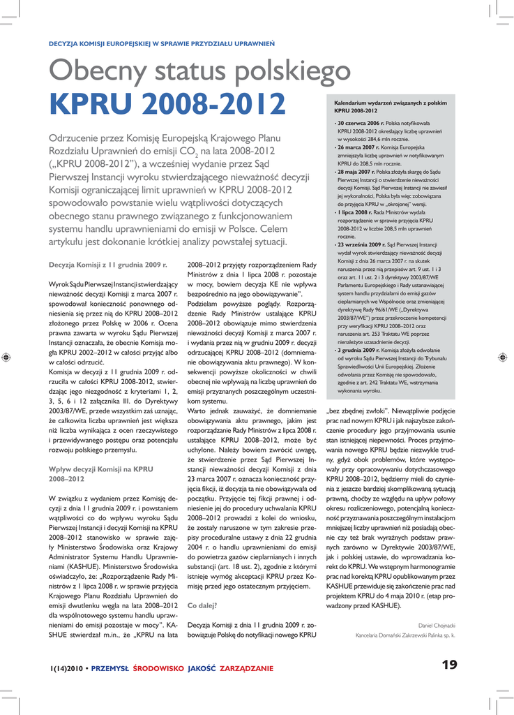 DECYZJA KOMISJI EUROPEJSKIEJ W SPRAWIE PRZYDZIAŁU UPRAWNIEŃ Obecny status polskiego KPRU 2008-2012 Kalendarium wydarzeń związanych z polskim KPRU 2008-2012 • 30 Odrzucenie przez Komisję Europejską Krajowego Planu Rozdziału Uprawnień do emisji CO2 na lata 2008-2012 („KPRU 2008-2012”), a wcześniej wydanie przez Sąd Pierwszej Instancji wyroku stwierdzającego nieważność decyzji Komisji ograniczającej limit uprawnień w KPRU 2008-2012 spowodowało powstanie wielu wątpliwości dotyczących obecnego stanu prawnego związanego z funkcjonowaniem systemu handlu uprawnieniami do emisji w Polsce. Celem artykułu jest dokonanie krótkiej analizy powstałej sytuacji. Decyzja Komisji z 11 grudnia 2009 r. Wyrok Sądu Pierwszej Instancji stwierdzający nieważność decyzji Komisji z marca 2007 r. spowodował konieczność ponownego odniesienia się przez nią do KPRU 2008–2012 złożonego przez Polskę w 2006 r. Ocena prawna zawarta w wyroku Sądu Pierwszej Instancji oznaczała, że obecnie Komisja mogła KPRU 2002–2012 w całości przyjąć albo w całości odrzucić. Komisja w decyzji z 11 grudnia 2009 r. odrzuciła w całości KPRU 2008-2012, stwierdzając jego niezgodność z kryteriami 1, 2, 3, 5, 6 i 12 załącznika III. do Dyrektywy 2003/87/WE, przede wszystkim zaś uznając, że całkowita liczba uprawnień jest większa niż liczba wynikająca z ocen rzeczywistego i przewidywanego postępu oraz potencjału rozwoju polskiego przemysłu. Wpływ decyzji Komisji na KPRU 2008–2012 W związku z wydaniem przez Komisję decyzji z dnia 11 grudnia 2009 r. i powstaniem wątpliwości co do wpływu wyroku Sądu Pierwszej Instancji i decyzji Komisji na KPRU 2008–2012 stanowisko w sprawie zajęły Ministerstwo Środowiska oraz Krajowy Administrator Systemu Handlu Uprawnieniami (KASHUE). Ministerstwo Środowiska oświadczyło, że: „Rozporządzenie Rady Ministrów z 1 lipca 2008 r. w sprawie przyjęcia Krajowego Planu Rozdziału Uprawnień do emisji dwutlenku węgla na lata 2008–2012 dla wspólnotowego systemu handlu uprawnieniami do emisji pozostaje w mocy”. KASHUE stwierdzał m.in., że „KPRU na lata 2008–2012 przyjęty rozporządzeniem Rady Ministrów z dnia 1 lipca 2008 r. pozostaje w mocy, bowiem decyzja KE nie wpływa bezpośrednio na jego obowiązywanie”. Podzielam powyższe poglądy. Rozporządzenie Rady Ministrów ustalające KPRU 2008–2012 obowiązuje mimo stwierdzenia nieważności decyzji Komisji z marca 2007 r. i wydania przez nią w grudniu 2009 r. decyzji odrzucającej KPRU 2008–2012 (domniemanie obowiązywania aktu prawnego). W konsekwencji powyższe okoliczności w chwili obecnej nie wpływają na liczbę uprawnień do emisji przyznanych poszczególnym uczestnikom systemu. Warto jednak zauważyć, że domniemanie obowiązywania aktu prawnego, jakim jest rozporządzanie Rady Ministrów z lipca 2008 r. ustalające KPRU 2008–2012, może być uchylone. Należy bowiem zwrócić uwagę, że stwierdzenie przez Sąd Pierwszej Instancji nieważności decyzji Komisji z dnia 23 marca 2007 r. oznacza konieczność przyjęcia fikcji, iż decyzja ta nie obowiązywała od początku. Przyjęcie tej fikcji prawnej i odniesienie jej do procedury uchwalania KPRU 2008–2012 prowadzi z kolei do wniosku, że zostały naruszone w tym zakresie przepisy proceduralne ustawy z dnia 22 grudnia 2004 r. o handlu uprawnieniami do emisji do powietrza gazów cieplarnianych i innych substancji (art. 18 ust. 2), zgodnie z którymi istnieje wymóg akceptacji KPRU przez Komisję przed jego ostatecznym przyjęciem. Co dalej? Decyzja Komisji z dnia 11 grudnia 2009 r. zobowiązuje Polskę do notyfikacji nowego KPRU 1(14)2010 • PRZEMYSŁ ŚRODOWISKO JAKOŚĆ ZARZĄDZANIE czerwca 2006 r. Polska notyfikowała KPRU 2008-2012 określający liczbę uprawnień w wysokości 284,6 mln rocznie. • 26 marca 2007 r. Komisja Europejska zmniejszyła liczbę uprawnień w notyfikowanym KPRU do 208,5 mln rocznie. • 28 maja 2007 r. Polska złożyła skargę do Sądu Pierwszej Instancji o stwierdzenie nieważności decyzji Komisji. Sąd Pierwszej Instancji nie zawiesił jej wykonalności, Polska była więc zobowiązana do przyjęcia KPRU w „okrojonej” wersji. • 1 lipca 2008 r. Rada Ministrów wydała rozporządzenie w sprawie przyjęcia KPRU 2008-2012 w liczbie 208,5 mln uprawnień rocznie. • 23 września 2009 r. Sąd Pierwszej Instancji wydał wyrok stwierdzający nieważność decyzji Komisji z dnia 26 marca 2007 r. na skutek naruszenia przez nią przepisów art. 9 ust. 1 i 3 oraz art. 11 ust. 2 i 3 dyrektywy 2003/87/WE Parlamentu Europejskiego i Rady ustanawiającej system handlu przydziałami do emisji gazów cieplarnianych we Wspólnocie oraz zmieniającej dyrektywę Rady 96/61/WE („Dyrektywa 2003/87/WE”) przez przekroczenie kompetencji przy weryfikacji KPRU 2008–2012 oraz naruszenia art. 253 Traktatu WE poprzez nienależyte uzasadnienie decyzji. • 3 grudnia 2009 r. Komisja złożyła odwołanie od wyroku Sądu Pierwszej Instancji do Trybunału Sprawiedliwości Unii Europejskiej. Złożenie odwołania przez Komisję nie spowodowało, zgodnie z art. 242 Traktatu WE, wstrzymania wykonania wyroku. „bez zbędnej zwłoki”. Niewątpliwie podjęcie prac nad nowym KPRU i jak najszybsze zakończenie procedury jego przyjmowania usunie stan istniejącej niepewności. Proces przyjmowania nowego KPRU będzie niezwykle trudny, gdyż obok problemów, które występowały przy opracowywaniu dotychczasowego KPRU 2008–2012, będziemy mieli do czynienia z jeszcze bardziej skomplikowaną sytuacją prawną, choćby ze względu na upływ połowy okresu rozliczeniowego, potencjalną konieczność przyznawania poszczególnym instalacjom mniejszej liczby uprawnień niż posiadają obecnie czy też brak wyraźnych podstaw prawnych zarówno w Dyrektywie 2003/87/WE, jak i polskiej ustawie, do wprowadzania korekt do KPRU. We wstępnym harmonogramie prac nad korektą KPRU opublikowanym przez KASHUE p