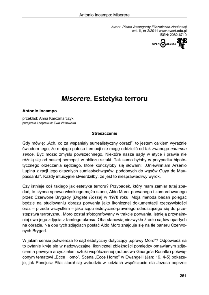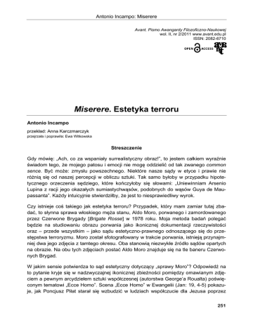 Antonio Incampo: Miserere Avant. Pismo Awangardy Filozoficzno-Naukowej Filozoficzno wol. II, nr 2/2011 www.avant.edu.pl ISSN: 2082-6710 2082 Miserere. Estetyka terroru Miserere. Antonio Incampo przekład: Anna Karczmarczyk przejrzała i poprawiła: poprawiła: Ewa Witkowska Streszczenie Gdy mówię: „Ach, co za wspaniały surrealistyczny obraz!”, to jestem całkiem wyraźnie świadom tego, Ŝe mojego patosu i emocji nie mogę oddzielić od tak zwanego common sence.. Być moŜe: zmysłu powszechnego. Niektóre nasze sądy sądy w etyce i prawie nie róŜnią się od naszej percepcji w obliczu sztuki. Tak samo byłoby w przypadku hipotehipot tycznego orzeczenia sędziego, które kończyłoby się słowami: „Uniewinniam Arsenio Lupina z racji jego okazałych sumiastychwąsów, podobnych do wąsów Gu Guya ya de MauMa passanta”. KaŜdy intuicyjnie stwierdziłby, Ŝe jest to niesprawiedliwy wyrok. Czy istnieje coś takiego jak estetyka terroru? Przypadek, który mam zamiar tutaj zbazb dać, to słynna sprawa włoskiego męŜa stanu, Aldo Moro, porwanego i zamordowanego przezz Czerwone Brygady [Brigate [Brigate Rosse] Rosse] w 1978 roku. Moja metoda badań polegać będzie na studiowaniu obrazu porwania jako ikonicznej dokumentacji rzeczywistości oraz – przede wszystkim – jako sądu estetyczno-prawnego estetyczno prawnego odnoszącego się do przeprz stępstwa terroryzmu. Moro został sfotografowany w trakcie porwania, istnieją przynajmprzynaj niej dwa jego zdjęcia z tamtego okresu. Oba stanowią niezwykłe źródło sądów opartych na obrazie. Na obu tych zdjęciach postać Aldo Moro znajduje się na tle baneru CzerwoCzerw nych Brygad. W jakim sensie sensie potwierdza to sąd estetyczny dotyczący „sprawy Moro”? Odpowiedź na to pytanie kryje się w nadzwyczajnej ikonicznej zbieŜności pomiędzy omawianym zdjęzdj ciem a pewnym arcydziełem sztuki współczesnej (autorstwa George’a Roualta) poświępoświ conym tematowi „Ecce Homo”. Scena „Ecce Homo” w Ewangelii (Jan: 19, 4 4-5) 5) pokazupokaz je, jak Poncjusz Piłat starał się wzbudzić w ludziach współczucie dla Jezusa poprzez 251 AVANT Volume II, Number 2/2011 www.avant.edu.pl biczowanie go i wystawianie przed tłum. Omawiana przeze mnie rycina zatytułowana jest “Qui ne se grime pas?” („KtóŜ nie ma zamalowanej twarzy?”) i stanowi kluczową pracę z cyklu rycin Miserere, pochodzących z 1923 roku. 1. 1.1. 1.2. Prawo i páthos. Sądy estetyczne w sztuce. Sądy estetyczne w naukach prawnych. 2. 2.1. 2.2. 2.2.1. 2.2.2. Estetyka terroru. Dwa zdjęcia Moro. Miserere według Rouaulta. Artystyczna inspiracja “Qui ne se grime pas?” 1. Prawo i páthos Sąd estetyczny opiera się na bezpośredniej subiektywnej intuicji: emocji lub swobodnym uczuciu konkretnego podmiotu względem przedmiotu. Gdy mówię: „Ach, co za wspaniały surrealistyczny obraz!”, to jestem całkiem wyraźnie świadomy, Ŝe mojego patosu i emocji nie mogę oddzielić od tak zwanego common sense. Być moŜe zmysłu powszechnego. Niektóre nasze sądy w etyce i prawie – czego będę tutaj dowodził – nie róŜnią się od naszej percepcji w obliczu sztuki. 1.1. Sądy estetyczne w sztuce Kant przedstawia w swojej Krytyce władzy sądzenia następującą ideę common sense [sensus communis, Gemeinsinn, gemeinschaftlicher Sinn]: Unter dem ‚sensus communis‘ [...] muß man die Idee eines gemeinschaftlichen Sinnes, d.i. eines Beurteilungsvermögens verstehen, welches in seiner Reflexion auf die Vorstellungsart jedes andern in Gedanken (a priori) Rücksicht nimmt, um gleichsam an die gesamte Menschenvernunft sein Urteil zu halten [...]. Dieses geschieht nun dadurch, daß man sein Urteil an anderer nicht sowohl wirkliche, als vielmehr bloß mögliche Urteile hält [...]. An sich ist nichts natürlicher, als von Reiz und Rührung zu abstrahieren, wenn man ein Urteil sucht, welches zur allgemeinen Regel dienen soll. Przez ‘sensus communis’ naleŜy jednak rozumieć ideę zmysłu wspólnego, to znaczy taką władzę wydawania o czymś sadów, która w swej refleksji uwzględnia w myślach (a priori) sposób przedstawiania właściwy teŜ kaŜdemu innemu człowiekowi, by przez to niejako skonfrontować swój sąd z całym rozumem ludzkim (…). Odbywa się to w ten sposób, Ŝe konfrontujemy swój sąd nie tyle z rzeczywistymi, ile raczej z moŜliwymi tylko sądami 252 Antonio Incampo: Miserere innych [ludzi] (…). Nic nie jest bowiem samo w sobie naturalniejsze niŜ abstrahowanie od powabu i wzruszenia, gdy szuka się sądu, który ma słuŜyć za powszechne prawidło.82 W naszych sądach estetycznych obecne jest przewidywanie na temat zgodności naszego sądu z sądami innych. Nie byłoby sądu estetycznego bez otwartości na to, co powszechne. Inni ludzie nie zawsze muszą się z nami zgadzać, idzie raczej o to, Ŝe wątpliwe jest, czy miałoby jakikolwiek sens wykrzykiwanie „Co za piękny obraz!” lub wydawanie jakiegokolwiek sądu tego rodzaju, nie wyczuwając wraŜenia wspólnego wszystkim percypującym jednostkom. „Piękno” czy „brzydota” opierają się właśnie na common sense. Logika sądu estetycznego nie jest natury dedukcyjnej – jeŜeli juŜ, to percepcyjnej. Ktokolwiek mówi: „CóŜ za wspaniały surrealistyczny obraz!” nie rozumuje wcale według schematu: (i) „Malarstwo surrealistyczne jest piękne”, (ii) „Ten obraz Paula Klee jest przykładem malarstwa surrealistycznego”, (iii) „Zatem jest to piękny obraz”. 1.2. Sądy estetyczne w naukach prawnych Niektóre sądy moralne lub prawne funkcjonują jak pierwsze i bezpośrednie percepcje. Powtórzę dla przykładu, co mówi Iwan w „Braciach Karamazow” Dostojewskiego: „Jest niedopuszczalne, aby dzieci cierpiały”. Do wyjaśnienia tego sądu wystarcza podstawowe uczucie. Tak samo byłoby w przypadku hipotetycznego orzeczenia sędziego, które kończyłoby się słowami: „Uniewinniam Arsenio Lupina z racji jego okazałych sumiastyc