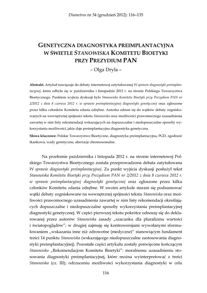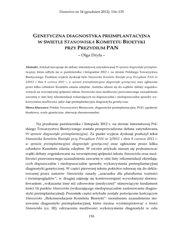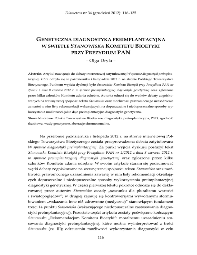 Diametros nr 34 (grudzień 2012): 116–135 GENETYCZNA DIAGNOSTYKA PREIMPLANTACYJNA W ŚWIETLE STANOWISKA KOMITETU BIOETYKI PRZY PREZYDIUM PAN – Olga Dryla – Abstrakt. Artykuł nawiązuje do debaty internetowej zatytułowanej W sprawie diagnostyki preimplantacyjnej, która odbyła się w październiku i listopadzie 2012 r. na stronie Polskiego Towarzystwa Bioetycznego. Punktem wyjścia dyskusji było Stanowisko Komitetu Bioetyki przy Prezydium PAN nr 2/2012 z dnia 8 czerwca 2012 r. w sprawie preimplantacyjnej diagnostyki genetycznej oraz zgłoszone przez kilku członków Komitetu zdania odrębne. Autorka odnosi się do wątków debaty zogniskowanych na wewnętrznej spójności tekstu Stanowiska oraz możliwości prawomocnego uzasadnienia zawartej w nim listy rekomendacji wskazujących na dopuszczalne i niedopuszczalne sposoby wykorzystania możliwości, jakie daje preimplantacyjna diagnostyka genetyczna. Słowa kluczowe: Polskie Towarzystwo Bioetyczne, diagnostyka preimplantacyjna, PGD, zgodność tkankowa, wady genetyczne, aberracje chromosomalne. Na przełomie października i listopada 2012 r. na stronie internetowej Polskiego Towarzystwa Bioetycznego została przeprowadzona debata zatytułowana W sprawie diagnostyki preimplantacyjnej. Za punkt wyjścia dyskusji posłużył tekst Stanowiska Komitetu Bioetyki przy Prezydium PAN nr 2/2012 z dnia 8 czerwca 2012 r. w sprawie preimplantacyjnej diagnostyki genetycznej oraz zgłoszone przez kilku członków Komitetu zdania odrębne. W swoim artykule staram się podsumować wątki debaty zogniskowane na wewnętrznej spójności tekstu Stanowiska oraz możliwości prawomocnego uzasadnienia zawartej w nim listy rekomendacji określających dopuszczalne i niedopuszczalne sposoby wykorzystania preimplantacyjnej diagnostyki genetycznej. W części pierwszej tekstu pokrótce odnoszę się do deklarowanej przez autorów Stanowiska zasady „szacunku dla pluralizmu wartości i światopoglądów”; w drugiej zajmuję się kontrowersjami wywołanymi sformułowaniem „wskazania inne niż zdrowotne (medyczne)” stanowiącym fundament treści 14 punktu Stanowiska (wskazującego niedopuszczalne zastosowania diagnostyki preimplantacyjnej). Pozostałe części artykułu zostały poświęcone kończącym Stanowisko „Rekomendacjom Komitetu Bioetyki”: moralnemu uzasadnieniu stosowania diagnostyki preimplantacyjnej, które można wyinterpretować z treści Stanowiska (cz. III); odrzuceniu możliwości wykorzystania diagnostyki w celu 116 Olga Dryla ◦ Genetyczna diagnostyka preimplantacyjna w świetle „Stanowiska”… ustalenia zgodności tkankowej (cz. IV) oraz w celu wyeliminowania embrionów obarczonych genami wywołującymi choroby późnoujawniające się (cz. V–VI). I. W akapicie rozpoczynającym tekst Stanowiska, jego autorzy wyłuszczają powody dowodzące pilnej potrzeby prawnego uregulowania zasad stosowania preimplantacyjnej diagnostyki genetycznej. Brak takich regulacji już doprowadził do tego, że „nie jest znana liczba polskich klinik, które oferują tę diagnozę, nie istnieje też żadna instytucja regulująca i monitorująca kliniczne standardy wykonywania tej procedury”1. A wszystko to w obliczu stałego wzrostu liczby podejmowanych prób zapłodnienia in vitro oraz związanych z nimi procedur PGD (Preimplantation Genetic Diagnosis). Stanowisko Komitetu Bioetyki ma wskazywać pożądany, czyli etycznie uzasadniony, kierunek rozwiązań legislacyjnych. Trzy pierwsze części Stanowiska zostały poświęcone prezentacji – kolejno – medycznych, etycznych i prawnych aspektów zagadnienia. W częściach poświęconych medycznym (pkt. 1–3) i prawnym (pkt. 8–11) aspektom diagnostyki preimplantacyjnej wstępnie zasygnalizowano powody przemawiające za jej dopuszczalnością. PGD jest dopuszczalna, ponieważ ma na celu „znaczne zmniejszenie lub wyeliminowanie ryzyka urodzenia dziecka dotkniętego chorobą” bądź „zwiększenie skuteczności zapłodnienia pozaustrojowego”2. Nie jest dopuszczalna, jeśli służy wyselekcjonowaniu „zarodka o pożądanej przez rodziców płci” lub „zarodka zgodnego w antygenach z inną żyjącą już osobą [...] [co umożliwiłoby] wykorzystanie nowonarodzonego dziecka w charakterze dawcy tkanek”3. Całkowity zakaz PGD godziłby w „spójność polskiego prawa, a także w jego integralność aksjologiczną”4; prawo pozwalałoby bowiem na prenatalne zdiagnozowanie oraz usunięcie uszkodzonego płodu, wykluczając jednocześnie preimplantacyjne zdiagnozowanie i wyłączenie z dalszych procedur zdefektowanego embrionu. Co istotne, prezentacja zagadnienia PGD w kontekście etycznym (pkt. 4–7) nie przynosi żadnych bezpośrednich argumentów na rzecz dopuszczalności tej procedury. Autorzy dokumentu jedynie identyfikują i krótko omawiają źródła etycznych kontrowersji nagromadzonych wokół kwestii PGD (1. spór o etyczną dopuszczalność zapłodnienia pozaustrojowego; 2. spór o dopuszczalność wpływu rodziców na zdrowie przyszłego potomstwa; 3. spór o ontyczny i moralny status 1 Komitet Bioetyki [2012] s. 1 2 Ibidem, s. 2. 3 Ibidem. 4 Ibidem, s. 5. 117 Olga Dryla ◦ Genetyczna diagnostyka preimplantacyjna w świetle „Stanowiska”… ludzkiego zarodka). Akapit zamykający tę część dokumentu zawiera deklarację, że „Komitet powinien [...] kierować się zasadą szacunku dla pluralizmu wartości i światopoglądów”, ponieważ wykazano, iż „[n]iepodobna raz na zawsze rozstrzygnąć sporu o moralną dopuszczalność lub niedopuszczalność stosowania preimplantacyjnej diagnostyki genetycznej”5. Wszyscy członkowie Komitetu, którzy w reakcji na tekst Stanowiska zgłosili zdania odrębne6, zwracają uwagę, iż wspomniana deklaracja nie wpływa w żaden sposób na treść rekomendacji sformułowanych przez autorów Stanowiska. Sam fakt rekomendowania PGD (niezależnie od ograniczeń tych rekomendacji) dowodzi, że sygnatariusze Stanowiska zajmują zup