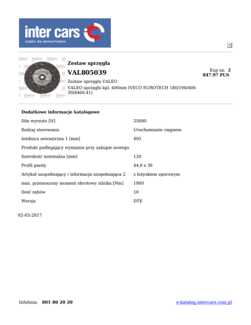 Zestaw sprzęgła Kup za: 2 847.97 PLN VAL805039 Zestaw sprzęgła VALEO VALEO sprzęgło kpl. 400mm IVECO EUROTECH 180/190/40030(8460.41) Dodatkowe informacje katalogowe Siła wyrzutu [N] 25000 Rodzaj sterowania Uruchamianie cięgnem średnica zewnętrzna 1 [mm] 405 Produkt podlegający wymianie przy zakupie nowego Szerokość nominalna [mm] 120 Profil piasty 44,6 x 36 Artykuł uzupełniający / informacja uzupełniająca 2 z łożyskiem oporowym max. przenoszony moment obrotowy silnika [Nm] 1800 Ilość zębów 10 Wersja DTE 02-03-2017 Infolinia: 801 80 20 20 e-katalog.intercars.com.pl