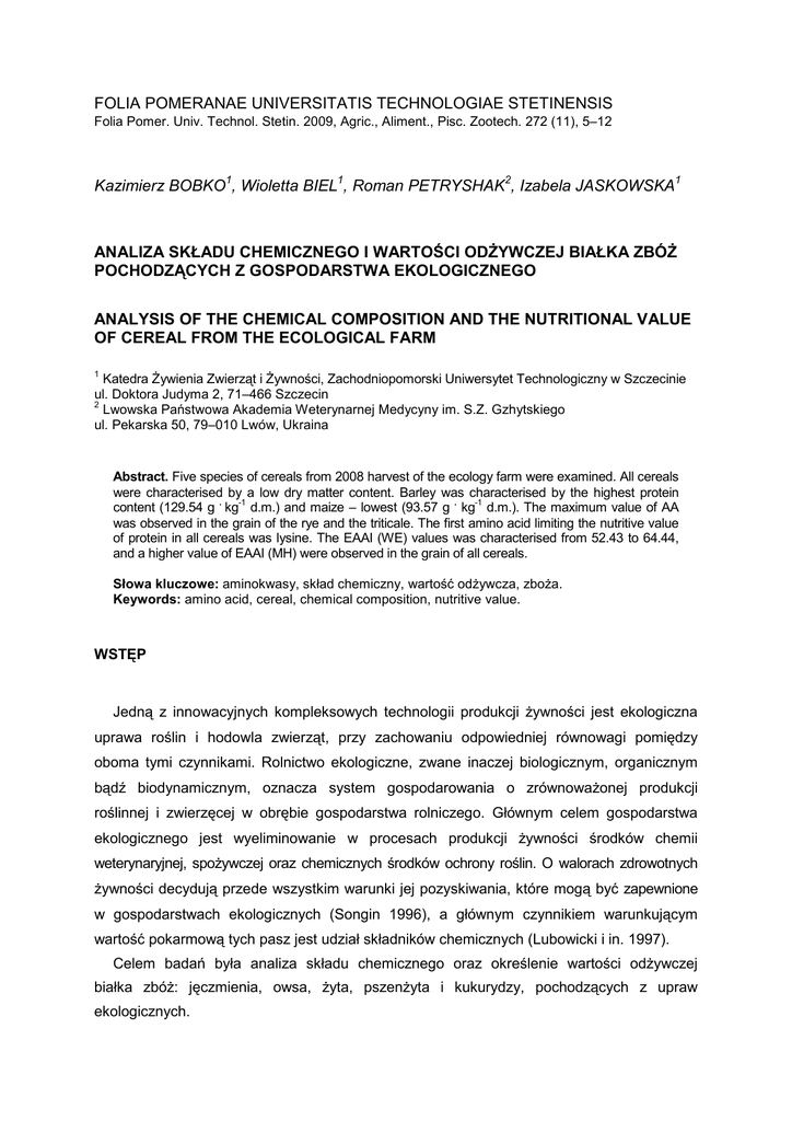 FOLIA POMERANAE UNIVERSITATIS TECHNOLOGIAE STETINENSIS Folia Pomer. Univ. Technol. Stetin. 2009, Agric., Aliment., Pisc. Zootech. 272 (11), 5–12 Kazimierz BOBKO1, Wioletta BIEL1, Roman PETRYSHAK2, Izabela JASKOWSKA1 ANALIZA SKŁADU CHEMICZNEGO I WARTOŚCI ODśYWCZEJ BIAŁKA ZBÓś POCHODZĄCYCH Z GOSPODARSTWA EKOLOGICZNEGO ANALYSIS OF THE CHEMICAL COMPOSITION AND THE NUTRITIONAL VALUE OF CEREAL FROM THE ECOLOGICAL FARM 1 Katedra śywienia Zwierząt i śywności, Zachodniopomorski Uniwersytet Technologiczny w Szczecinie ul. Doktora Judyma 2, 71–466 Szczecin 2 Lwowska Państwowa Akademia Weterynarnej Medycyny im. S.Z. Gzhytskiego ul. Pekarska 50, 79–010 Lwów, Ukraina Abstract. Five species of cereals from 2008 harvest of the ecology farm were examined. All cereals were characterised by a low dry matter content. Barley was characterised by the highest protein . -1 . -1 content (129.54 g kg d.m.) and maize – lowest (93.57 g kg d.m.). The maximum value of AA was observed in the grain of the rye and the triticale. The first amino acid limiting the nutritive value of protein in all cereals was lysine. The EAAI (WE) values was characterised from 52.43 to 64.44, and a higher value of EAAI (MH) were observed in the grain of all cereals. Słowa kluczowe: aminokwasy, skład chemiczny, wartość odŜywcza, zboŜa. Keywords: amino acid, cereal, chemical composition, nutritive value. WSTĘP Jedną z innowacyjnych kompleksowych technologii produkcji Ŝywności jest ekologiczna uprawa roślin i hodowla zwierząt, przy zachowaniu odpowiedniej równowagi pomiędzy oboma tymi czynnikami. Rolnictwo ekologiczne, zwane inaczej biologicznym, organicznym bądź biodynamicznym, oznacza system gospodarowania o zrównowaŜonej produkcji roślinnej i zwierzęcej w obrębie gospodarstwa rolniczego. Głównym celem gospodarstwa ekologicznego jest wyeliminowanie w procesach produkcji Ŝywności środków chemii weterynaryjnej, spoŜywczej oraz chemicznych środków ochrony roślin. O walorach zdrowotnych Ŝywności decydują przede wszystkim warunki jej pozyskiwania, które mogą być zapewnione w gospodarstwach ekologicznych (Songin 1996), a głównym czynnikiem warunkującym wartość pokarmową tych pasz jest udział składników chemicznych (Lubowicki i in. 1997). Celem badań była analiza składu chemicznego oraz określenie wartości odŜywczej białka zbóŜ: jęczmienia, owsa, Ŝyta, pszenŜyta i kukurydzy, pochodzących z upraw ekologicznych. 6 K. Bobko i in. MATERIAŁ I METODY Materiał badawczy Materiał badawczy, będący podstawą badań, składał się z pięciu gatunków zbóŜ: jęczmienia, owsa, Ŝyta, pszenŜyta, kukurydzy. Wszystkie zboŜa pochodziły ze zbiorów w 2008 roku z certyfikowanego gospodarstwa ekologicznego (posiadającego atest Ekolandu), Państwa Izabeli i Marka Dopadło z Rzystnowa, gmina Przybiernów. Skład chemiczny Podstawowy skład chemiczny (sucha masa, popiół surowy, białko ogólne, włókno surowe, bezazotowe wyciągowe) badanych ziaren zbóŜ oznaczono zgodnie z metodą podaną przez AOAC (1990) w dwóch powtórzeniach dla kaŜdego ze zbóŜ. Oznaczenia chemiczne pozwoliły na uchwycenie zmienności składu chemicznego w obrębie gatunków. Aminokwasy Udział aminokwasów określono w analizatorze AAA–400 (INGOS, Czechy) po uprzednim zhydrolizowaniu próbki 6M kwasem solnym w temp. 105ºC przez 24 h. W hydrolizie metioninę oznaczono metodą kalorymetryczną według Pawlika (1972). Tryptofan natomiast oznaczono zgodnie z metodą AOAC (1990). Ocena wartości odŜywczej białka Skład aminokwasowy, uzyskany w wyniku analiz, pozwolił na ocenę jakości białka mierzoną następującymi wskaźnikami: − Wskaźnik aminokwasu ograniczającego – CS (Chemical Score) – metoda Blocka i Mitchella (1946). Metoda ta polega na określeniu stosunku zawartości egzogennego aminokwasu ograniczającego w badanym białku (ab) do zawartości tego samego aminokwasu w białku standardowym (as). Oblicza się go według następującego wzoru: CS = ab/as . 100. W badaniach zastosowano dwa wzorce: dorosłego człowieka (MH) (FAO/WHO, 1991) oraz jaja kurzego (WE) (Hidvégi i Békés 1984). − Wskaźnik aminokwasów egzogenych – EAAI (Essential Amino-Acid Index) wg Osera (1951). Jest to średnia geometryczna stosunku zawartości aminokwasów egzogennych oraz histydyny w białku badanym do zawartości tych aminokwasów w białku wzorcowym (w g na 100 g białka); dla wzorca dorosłego człowieka (MH) z wyłączeniem histydyny. Obliczany na podstawie wzoru: EAAI = 10logEAA, gdzie log EAA obliczamy według wzoru: log EAA = an a1 a2 1 (log x100 + log x100 + …+ log a1s a2s a ns x 100) 10 7 Analiza składu chemicznego... Obliczenia statystyczne Do stwierdzenia istotnych róŜnic pomiędzy gatunkami zbóŜ posłuŜył test F i wielokrotny test rozstępu Dancana (P≤0,01; P≤0,05). Wszystkie obliczenia przeprowadzono z wykorzystaniem programu Statistica® 8,0. WYNIKI I DYSKUSJA Rozpatrując podstawowy skład chemiczny, który jest decydującym czynnikiem wartości pokarmowej pasz, moŜna stwierdzić, Ŝe ziarna zbóŜ zalicza się do pasz węglowodanowych o małej i średniej zawartości białka ogólnego (Brand i in. 2003). Wartości średnie z dwóch powtórzeń podstawowych składników pokarmowych przedstawiono w tab. 1. . -1 Tabela 1. Skład chemiczny zbóŜ [g kg suchej masy] . -1 Table 1. Chemical composition of cereal [g kg dry matter] Wyszczególnienie Item Jęczmień Barley Owies Oat śyto Rye PszenŜyto Triticale Kukurydza Maize Sucha masa . -1 [g kg ziarna] Dry mater . -1 [g kg grain] Popiół surowy Crude ash Białko ogólne Crude protein Ekstrakt eterowy Oil 859,1 Aa 20,74 Aa 129,54 Aa 19,19 Aa 847,2 Ab 29,15 Bb 118,27 Bb 40,6 849,4 Aa 19,07 Aa 100,19 Cc 11,42 Cc 879,1 Bc 20,25 Aa 102,59 CDc 21,77 877,1 Bc 14,71 Bb 93,57 Dd 44,69 Włókno surowe Crude fibre BAW NFE Aa 808,01 Aa Bb 697,60 Bb 21,07 Aa 848,25 Cc Aa 27,59 Cc 827,80 Dd Bd 17,10 Dd 829,93 Dd Bb 22,52 114,38 War