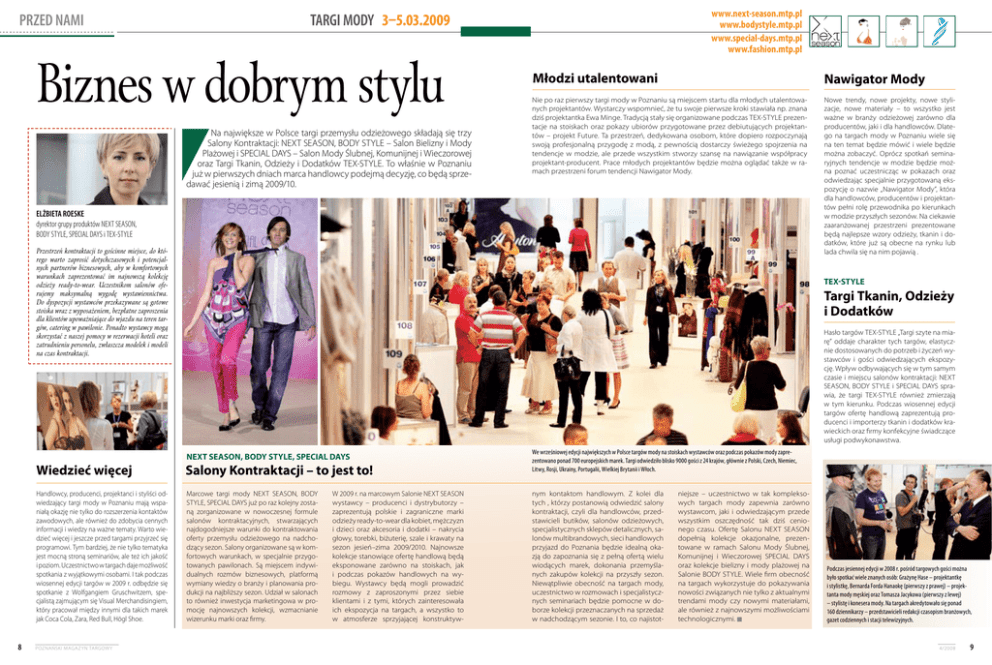 PRZED NAMI www.next-season.mtp.pl www.bodystyle.mtp.pl www.special-days.mtp.pl www.fashion.mtp.pl TARGI MODY 3–5.03.2009 Biznes w dobrym stylu Na największe w Polsce targi przemysłu odzieżowego składają się trzy Salony Kontraktacji: NEXT SEASON, BODY STYLE – Salon Bielizny i Mody Plażowej i SPECIAL DAYS – Salon Mody Ślubnej, Komunijnej i Wieczorowej oraz Targi Tkanin, Odzieży i Dodatków TEX-STYLE. To właśnie w Poznaniu już w pierwszych dniach marca handlowcy podejmą decyzję, co będą sprzedawać jesienią i zimą 2009/10. Młodzi utalentowani Nawigator Mody Nie po raz pierwszy targi mody w Poznaniu są miejscem startu dla młodych utalentowanych projektantów. Wystarczy wspomnieć, że tu swoje pierwsze kroki stawiała np. znana dziś projektantka Ewa Minge. Tradycją stały się organizowane podczas TEX-STYLE prezentacje na stoiskach oraz pokazy ubiorów przygotowane przez debiutujących projektantów – projekt Future. Ta przestrzeń, dedykowana osobom, które dopiero rozpoczynają swoją profesjonalną przygodę z modą, z pewnością dostarczy świeżego spojrzenia na tendencje w modzie, ale przede wszystkim stworzy szansę na nawiązanie współpracy projektant-producent. Prace młodych projektantów będzie można oglądać także w ramach przestrzeni forum tendencji Nawigator Mody. Nowe trendy, nowe projekty, nowe stylizacje, nowe materiały – to wszystko jest ważne w branży odzieżowej zarówno dla producentów, jaki i dla handlowców. Dlatego na targach mody w Poznaniu wiele się na ten temat będzie mówić i wiele będzie można zobaczyć. Oprócz spotkań seminaryjnych tendencje w modzie będzie można poznać uczestnicząc w pokazach oraz odwiedzając specjalnie przygotowaną ekspozycję o nazwie „Nawigator Mody”, która dla handlowców, producentów i projektantów pełni rolę przewodnika po kierunkach w modzie przyszłych sezonów. Na ciekawie zaaranżowanej przestrzeni prezentowane będą najlepsze wzory odzieży, tkanin i dodatków, które już są obecne na rynku lub lada chwila się na nim pojawią . Elżbieta Roeske dyrektor grupy produktów NEXT SEASON, BODY STYLE, SPECIAL DAYS i TEX-STYLE Przestrzeń kontraktacji to gościnne miejsce, do którego warto zaprosić dotychczasowych i potencjalnych partnerów biznesowych, aby w komfortowych warunkach zaprezentować im najnowszą kolekcję odzieży ready-to-wear. Uczestnikom salonów oferujemy maksymalną wygodę wystawiennictwa. Do dyspozycji wystawców przekazywane są gotowe stoiska wraz z wyposażeniem, bezpłatne zaproszenia dla klientów upoważniające do wjazdu na teren targów, catering w pawilonie. Ponadto wystawcy mogą skorzystać z naszej pomocy w rezerwacji hoteli oraz zatrudnieniu personelu, zwłaszcza modelek i modeli na czas kontraktacji. 8 TEX-STYLE Targi Tkanin, Odzieży i Dodatków Hasło targów TEX-STYLE „Targi szyte na miarę” oddaje charakter tych targów, elastycznie dostosowanych do potrzeb i życzeń wystawców i gości odwiedzających ekspozycję. Wpływ odbywających się w tym samym czasie i miejscu salonów kontraktacji: NEXT SEASON, BODY STYLE i SPECIAL DAYS sprawia, że targi TEX-STYLE również zmierzają w tym kierunku. Podczas wiosennej edycji targów ofertę handlową zaprezentują producenci i importerzy tkanin i dodatków krawieckich oraz firmy konfekcyjne świadczące usługi podwykonawstwa. Wiedzieć więcej Next Season, Body Style, Special Days Salony Kontraktacji – to jest to! We wrześniowej edycji największych w Polsce targów mody na stoiskach wystawców oraz podczas pokazów mody zaprezentowano ponad 700 europejskich marek. Targi odwiedziło blisko 9000 gości z 24 krajów, głównie z Polski, Czech, Niemiec, Litwy, Rosji, Ukrainy, Portugalii, Wielkiej Brytanii i Włoch. Handlowcy, producenci, projektanci i styliści odwiedzający targi mody w Poznaniu mają wspaniałą okazję nie tylko do rozszerzenia kontaktów zawodowych, ale również do zdobycia cennych informacji i wiedzy na ważne tematy. Warto wiedzieć więcej i jeszcze przed targami przyjrzeć się programowi. Tym bardziej, że nie tylko tematyka jest mocną stroną seminariów, ale też ich jakość i poziom. Uczestnictwo w targach daje możliwość spotkania z wyjątkowymi osobami. I tak podczas wiosennej edycji targów w 2009 r. odbędzie się spotkanie z Wolfgangiem Gruschwitzem, specjalistą zajmującym się Visual Merchandisingiem, który pracował między innymi dla takich marek jak Coca Cola, Zara, Red Bull, Högl Shoe. Marcowe targi mody NEXT SEASON, BODY STYLE, SPECIAL DAYS już po raz kolejny zostaną zorganizowane w nowoczesnej formule salonów kontraktacyjnych, stwarzających najdogodniejsze warunki do kontraktowania oferty przemysłu odzieżowego na nadchodzący sezon. Salony organizowane są w komfortowych warunkach, w specjalnie przygotowanych pawilonach. Są miejscem indywidualnych rozmów biznesowych, platformą wymiany wiedzy o branży i planowania produkcji na najbliższy sezon. Udział w salonach to również inwestycja marketingowa w promocję najnowszych kolekcji, wzmacnianie wizerunku marki oraz firmy. nym kontaktom handlowym. Z kolei dla tych , którzy postanowią odwiedzić salony kontraktacji, czyli dla handlowców, przedstawicieli butików, salonów odzieżowych, specjalistycznych sklepów detalicznych, salonów multibrandowych, sieci handlowych przyjazd do Poznania będzie idealną okazją do zapoznania się z pełną ofertą wielu wiodących marek, dokonania przemyślanych zakupów kolekcji na przyszły sezon. Niewątpliwie obecność na targach mody, uczestnictwo w rozmowach i specjalistycznych seminariach będzie pomocne w doborze kolekcji przeznaczanych na sprzedaż w nadchodzącym sezonie. I to, co najistot- POZNAŃSKI MAGAZYN TARGOW Y W 2009 r. na marcowym Salonie NEXT SEASON wystawcy – producenci i dystrybutorzy – zaprezentują polskie i zagraniczne marki odzieży ready-to-wear dla kobiet, mężczyzn i dzieci oraz akcesoria i dodatki –