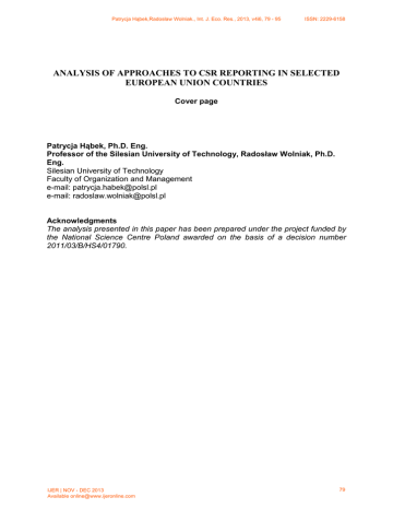 Patrycja Hąbek,Radosław Wolniak., Int. J. Eco. Res., 2013, v4i6, 79 - 95 ISSN: 2229-6158 ANALYSIS OF APPROACHES TO CSR REPORTING IN SELECTED EUROPEAN UNION COUNTRIES Cover page Patrycja Hąbek, Ph.D. Eng. Professor of the Silesian University of Technology, Radosław Wolniak, Ph.D. Eng. Silesian University of Technology Faculty of Organization and Management e-mail: [email protected] e-mail: [email protected] Acknowledgments The analysis presented in this paper has been prepared under the project funded by the National Science Centre Poland awarded on the basis of a decision number 2011/03/B/HS4/01790. IJER | NOV - DEC 2013 Available [email protected] 79 Patrycja Hąbek,Radosław Wolniak., Int. J. Eco. Res., 2013, v4i6, 79 - 95 ISSN: 2229-6158 ANALYSIS OF APPROACHES TO CSR REPORTING IN SELECTED EUROPEAN UNION COUNTRIES Patrycja Hąbek, Ph.D. Eng. Professor of the Silesian University of Technology, Radosław Wolniak, Ph.D. Eng. Silesian University of Technology Faculty of Organization and Management ,e-mail: [email protected] e-mail: [email protected] ABSTRACT In recent years the number of companies publishing CSR reports has significantly increased, especially in European Union. We can observe that national governments are becoming more active in promoting sustainability reporting through inter alia adopting laws and regulations. Current legislation with implication for sustainability reporting impose an obligation on specific groups of companies and usually refers to companies listed on a stock exchange and/or companies of a certain size, state-owned companies, large emitters or energy-intensive companies. Across countries, different combinations of initiatives in this field have been implemented. Authors select to study five European Union member states which are examples of different governmental approaches to sustainability reporting practices. The paper presents methodology and results of their study as well as the matrix of institutional models of governmental policy on CSR reporting. Key words: sustainability reporting, government’s policy on CSR, regulations the most active region in this field. The INTRODUCTION visible evidence of the EU engagement in the topic of corporate social responsibility A growing number of companies in reporting is a proposal for a directive Europe publish reports on their adopted on 16 April 2013 by European sustainability performance as part of their Commission on disclosure of non-financial annual reports or in separate Corporate and diversity information by certain large Social Responsibility (CSR) reports. In companies and groups (COM(2013) 207). recent years, some European governments Across the European Union we can have made CSR reporting mandatory for observe multiple approaches to CSR large companies or decided to lead by reporting undertaken by individual example by pushing state-owned countries. The aim of this paper is to companies to report on their sustainability present some of these approaches and to performance. As a relatively early example identify, on the basis of carried out of national reporting requirements, all analysis, institutional models relating to listed companies in France have had to governmental policy on CSR reporting. disclose information on social and For the purpose of this paper the environmental conditions in their annual authors define sustainability reporting as reports since 2001. In the Nordic region, the practice of providing information to Sweden has made sustainability reporting external and internal stakeholders on the based on the GRI (Global Reporting economic, environmental and social results Initiative) guidelines obligatory for all achieved by an organization. In literature state-owned companies as of 2009, and the and business practice most frequently used Danish companies are required to report on terminology for these kinds of practices their sustainability performance as of 2001 are: sustainability reporting, corporate (Visser and Tolhurst 2010). The level of social responsibility reporting, nonCSR reporting in different countries varies. Europe and especially its western part is IJER | NOV - DEC 2013 Available [email protected] 80 Patrycja Hąbek,Radosław Wolniak., Int. J. Eco. Res., 2013, v4i6, 79 - 95 financial disclosures. In this paper the authors uses them interchangeably. The paper is divided into two parts. The first part consists of introduction and literature review and in the second part the authors present methodology and results of their study as well as the matrix of institutional models of governmental policy on CSR reporting. LITERATURE REVIEW Over the past decade there has been a lively debate amongst proponents of voluntary (Francis et al. 2008; Rodríguez and LeMaster 2007; Dhaliwal et al. 2009) and mandatory (Maguire 2011; Ioannou and Serafeim 2011; Doane 2002) reporting standards. Despite all the arguments for and against governments are key players in the sustainability debate and in the promotion of sustainability reporting (Tschopp et al. 2012). One option for the regulator is to be passive and let sustainability reporting emerges as the result of market forces. Alternatively, the regulator may choose to introduce a range of measures to supplement the market forces (Ioannou and Serafeim 2011): through regulations dictating mandatory reporting by firms; by providing incentives for companies to report; governmental endorsement of the GRI Guidelines and material encouragement for adoption; by recommending or proposing voluntary guidelines with or without reference to international standards such as the United Nations Global Compact (UNGC) and GRI; or by transferring the regulatory power to self-regulating authorities like a stock exchange, whose statutes may be either voluntary or mandatory. Across countries, different combinations of the above options have IJER | NOV - DEC 2013 Available [email protected] ISSN: 2229-6158 been implemented in recent years (Wolniak and Hąbe