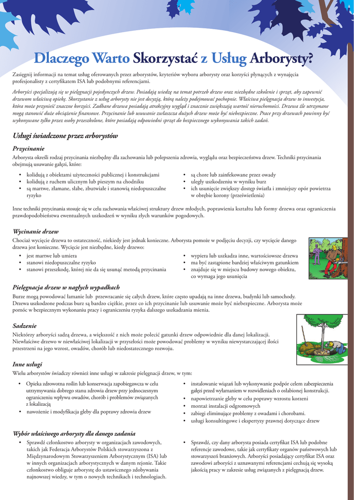 Dlaczego Warto Skorzystać z Usług Arborysty? Zasięgnij informacji na temat usług oferowanych przez arborystów, kryteriów wyboru arborysty oraz korzyści płynących z wynajęcia profesjonalisty z certyfikatem ISA lub podobnymi referencjami. Arboryści specjalizują się w pielęgnacji pojedynczych drzew. Posiadają wiedzę na temat potrzeb drzew oraz niezbędne szkolenie i sprzęt, aby zapewnić drzewom właściwą opiekę. Skorzystanie z usług arborysty nie jest decyzją, którą należy podejmować pochopnie. Właściwa pielęgnacja drzew to inwestycja, która może przynieść znaczne korzyści. Zadbane drzewa posiadają atrakcyjny wygląd i znacznie zwiększają wartość nieruchomości. Drzewa źle utrzymane mogą stanowić duże obciążenie finansowe. Przycinanie lub usuwanie zwłaszcza dużych drzew może być niebezpieczne. Prace przy drzewach powinny być wykonywane tylko przez osoby przeszkolone, które posiadają odpowiedni sprzęt do bezpiecznego wykonywania takich zadań. Usługi świadczone przez arborystów Przycinanie Arborysta określi rodzaj przycinania niezbędny dla zachowania lub polepszenia zdrowia, wyglądu oraz bezpieczeństwa drzew. Techniki przycinania obejmują usuwanie gałęzi, które: • kolidują z obiektami użyteczności publicznej i konstrukcjami • kolidują z ruchem ulicznym lub pieszym na chodniku • są martwe, złamane, słabe, zbutwiałe i stanowią niedopuszczalne ryzyko • są chore lub zainfekowane przez owady • uległy uszkodzeniu w wyniku burz • ich usunięcie zwiększy dostęp światła i zmniejszy opór powietrza w obrębie korony (prześwietlenia) Inne techniki przycinania stosuje się w celu zachowania właściwej struktury drzew młodych, poprawienia kształtu lub formy drzewa oraz ograniczenia prawdopodobieństwa ewentualnych uszkodzeń w wyniku złych warunków pogodowych. Wycinanie drzew Chociaż wycięcie drzewa to ostateczność, niekiedy jest jednak konieczne. Arborysta pomoże w podjęciu decyzji, czy wycięcie danego drzewa jest konieczne. Wycięcie jest niezbędne, kiedy drzewo: • jest martwe lub umiera • stanowi niedopuszczalne ryzyko • stanowi przeszkodę, której nie da się usunąć metodą przycinania • wypiera lub uszkadza inne, wartościowsze drzewa • ma być zastąpione bardziej właściwym gatunkiem • znajduje się w miejscu budowy nowego obiektu, co wymaga jego usunięcia Pielęgnacja drzew w nagłych wypadkach Burze mogą powodować łamanie lub przewracanie się całych drzew, które często upadają na inne drzewa, budynki lub samochody. Drzewa uszkodzone podczas burz są bardzo ciężkie, przez co ich przycinanie lub usuwanie może być niebezpieczne. Arborysta może pomóc w bezpiecznym wykonaniu pracy i ograniczeniu ryzyka dalszego uszkadzania mienia. Sadzenie Niektórzy arboryści sadzą drzewa, a większość z nich może polecić gatunki drzew odpowiednie dla danej lokalizacji. Niewłaściwe drzewo w niewłaściwej lokalizacji w przyszłości może powodować problemy w wyniku niewystarczającej ilości przestrzeni na jego wzrost, owadów, chorób lub niedostatecznego rozwoju. Inne usługi Wielu arborystów świadczy również inne usługi w zakresie pielęgnacji drzew, w tym: • Opieka zdrowotna roślin lub konserwacja zapobiegawcza w celu utrzymywania dobrego stanu zdrowia drzew przy jednoczesnym ograniczeniu wpływu owadów, chorób i problemów związanych z lokalizacją • nawożenie i modyfikacja gleby dla poprawy zdrowia drzew • instalowanie wiązań lub wykonywanie podpór celem zabezpieczenia gałęzi przed wyłamaniem w rozwidleniach o osłabionej konstrukcji. • napowietrzanie gleby w celu poprawy wzrostu korzeni • montaż instalacji odgromowych • zabiegi eliminujące problemy z owadami i chorobami. • usługi konsultingowe i ekspertyzy prawnej dotyczące drzew Wybór właściwego arborysty dla danego zadania • Sprawdź członkostwo arborysty w organizacjach zawodowych, takich jak Federacja Arborystów Polskich stowarzyszona z Międzynarodowym Stowarzyszeniem Arborystycznym (ISA) lub w innych organizacjach arborystycznych w danym rejonie. Takie członkostwo obliguje arborystę do ustawicznego zdobywania najnowszej wiedzy, w tym o nowych technikach i technologiach. • Sprawdź, czy dany arborysta posiada certyfikat ISA lub podobne referencje zawodowe, takie jak certyfikaty organów państwowych lub stowarzyszeń branżowych. Arboryści posiadający certyfikat ISA oraz zawodowi arboryści z uznawanymi referencjami cechują się wysoką jakością pracy w zakresie usług związanych z pielęgnacją drzew. • Poproś o świadectwo ubezpieczenia i zadzwoń do przedsiębiorstwa ubezpieczeniowego w celu dalszego potwierdzenia. Renomowany arborysta posiada ubezpieczenie od szkód osobowych i majątkowych oraz ubezpieczenie dotyczące odszkodowań pracowniczych (jeśli posiada ono zastosowanie w danym obszarze). • Sprawdź niezbędne pozwolenia i licencje. Niektóre agencje rządowe wymagają od wykonawców ubiegania się o pozwolenia i/lub licencje przed rozpoczęciem działalności. • Poproś o referencje, aby dowiedzieć się, gdzie firma zrealizowała prace podobne do prac, które zamierzasz zlecić. Nie zwlekaj, by sprawdzić referencje lub odwiedzić miejsca, w których dana firma lub osoba wykonała podobne prace przy drzewach. • Uważaj na osoby, które pukają od drzwi do drzwi oferując okazje w zakresie prac arborystycznych. Większość renomowanych firm otrzymuje wystarczającą ilość zleceń i nie ubiega się o klientów w ten sposób. • Pamiętaj, że dobry arborysta stosuje wyłącznie praktyki akceptowane w branży. Praktyki, takie jak ścinanie czubka drzewa, usuwanie nadmiernej ilości żywego drewna, wspinaczka za pomocą kolców na drzewa, które nie są przeznaczone do ścięcia, ścinanie lub zniekształcanie żywych drzew bez słusznej przyczyny to niewłaściwe praktyki, które naruszają standardy branżowe. • Zdobądź potwierdze
