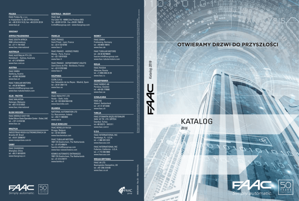 ODDZIAŁY AFRYKA POŁUDNIOWA FRANCJA NIEMCY FAAC SOUTH AFRICA 2040 Johannesburg tel. +27 11 794 4525 www.faac.international FAAC FRANCE Saint Priest - Lyon, France tel. +33 4 72218700 www.faac.fr FAAC GMBH Freilassing, Germany tel. +49 8654 49810 www.faac.de AUSTRALIA FAAC FRANCE - AGENCE PARIS Massy - Paris, France tel. +33 1 69191620 www.faac.fr FAAC TUBULAR MOTORS tel. +49 30 56796645 [email protected] www.faac-tubularmotors.com FAAC AUSTRALIA PTY LTD Homebush – Sydney, Australia tel. +61 2 87565644 www.faac.com.au AUSTRIA FAAC GMBH Salzburg, Austria tel. +43 662 8533950 www.faac.at FAAC TUBULAR MOTORS tel. +49 30 56796645 [email protected] www.faac-tubularmotors.com AZJA - PACYFIK FAAC MALAYSIA Selangor, Malaysia tel. +60 3 5123 0033 www.faac.international BLISKI WSCHÓD FAAC MIDDLE EAST FZE Dubai Silicon Oasis Operation Center - Dubai, UAE tel. + 971 4 3724190 www.faac.ae BRAZYLIA INDÚSTRIAS ROSSI ELETROMECÂNICA SA Brasilia DF, Brazil tel. +55 61 33998787 www.rossiportoes.com.br CHINY FAAC SHANGHAI Shanghai, China tel. +86 21 68182970 www.faacgroup.cn FAAC FRANCE - DEPARTEMENT VOLETS Saint Denis de Pile - Bordeaux, France tel. +33 5 57551890 www.faac.fr HISZPANIA CLEM, S.A.U. San Sebastián de los Reyes - Madrid, Spain tel. +34 91 3581110 www.faac.es INDIE FAAC INDIA PVT. LTD Noida – Delhi, India tel. +91 120 3934100/4199 www.faacindia.com IRLANDIA NATIONAL AUTOMATION LTD Co. Roscommon, Ireland tel. +353 71 9663893 www.nal.ie KRAJE BENELUXU FAAC BENELUX NV/SA Brugge, Belgium tel. +32 50 320202 www.faacbenelux.com FAAC TUBULAR MOTORS 7007 CN Doetinchem, The Netherlands tel. +31 475 406014 [email protected] www.faac-tubularmotors.com KEMKO AUTOMATIC ENTRANCES 7007 CN Doetinchem, The Netherlands tel. +31 314 378777 www.kemko.nl ROSJA FAAC RUSSIA Moscow, Russia tel. +7 (495) 646 24 29 www.faac.ru SKANDYNAWIA FAAC NORDIC AB Perstorp, Sweden tel. +46 435 779500 www.faac.se SZWAJCARIA FAAC AG Altdorf, Switzerland tel. +41 41 8713440 www.faac.ch TURCJA FAAC OTOMATİK GEÇİ� SİSTEMLERİ SAN. VE TİC. LTD. SIRTEKI İstanbul, Turkey tel.+90 (0)212 - 3431311 www.faac.com.tr U.S.A. FAAC INTERNATIONAL INC Rockledge, FL - U.S.A. tel. +1 866 925 3222 www.faacusa.com FAAC INTERNATIONAL INC Fullerton, California - U.S.A. tel. +1 714 446 9800 www.faacusa.com WIELKA BRYTANIA FAAC UK LTD. Basingstoke Hampshire, UK tel. +44 1256 318100 www.faac.co.uk OTWIERAMY DRZWI DO PRZYSZŁOŚCI Katalog 2016 FAAC SpA Via Calari 10 - 40069 Zola Predosa (BO) Tel. +39 051 61724 - Fax +39 051 758518 [email protected] - www.faacgroup.com W trosce o ciągłe doskonalenie produktów FAAC S.p.A. zastrzega sobie prawo do wprowadzania modyfikacji technicznych bez wcześniejszego powiadomienia o zamiarze ich wprowadzenia. Wszystkie prawa zastrzeżone, powielanie w jakiejkolwiek formie, za pomocą dowolnych środków, którejkolwiek z części bądź całości niniejszego dokumentu bez zgody FAAC S.p.A. jest surowo zabronione. CENTRALA – WŁOCHY FAAC Polska Sp. z o.o. ul. Kopijników 12, 03-274 Warszawa tel.: +48 22 814 14 22, fax: +48 22 814 20 24 www.faac.pl 9908295004 - Rev.25 – 1000 - Chinchio POLSKA KATALOG 2016 GIUSEPPE MANINI GDY POMYSŁY ZMIENIAJĄ ŚWIAT Innowacyjność, umiejętność wyjścia poza ustanowione ramy, odwaga przekraczania granic i otwierania drzwi na nowe: to wartości, które od lat inspirują Grupę FAAC, począwszy od jej ustanowienia w 1965 r. Tak wiele różnych rozdziałów, a wszystkie zapoczątkowane duchem wizjonerstwa i pionierstwa stanowiącym solidny fundament, na którym Grupa nieprzerwanie buduje swoją pozycję. Przez wszystkie 50 lat od dnia ustanowienia FAAC celebruje te wartości oddając hołd tym, którzy jako pierwsi wyznaczyli przyświecające nam cele, kierując się podejściem do klienta, która zawsze odróżniało naszą firmę, naszych pracowników i współpracowników od konkurencji. Renoma nowatora i pioniera znacząco przyczyniającego się do poprawy jakości życia, początkowo wyłącznie we Włoszech, dziś już na całym świecie. Duch innowacyjności, którego Giuseppe Manini tchnął i kultywował w FAAC od początku powstania firmy, przekonanie, że owocne i trwałe przedsiębiorstwo można zbudować jedynie na oferowaniu prostych i efektywnych rozwiązań będących odpowiedzią na potrzeby życia codziennego. Rozwiązaniach otwierających wiele nowych drzwi. FAAC SpA napęd hydrauliczny, początek lat 70tych FAAC EKOLOGIA. Innowacyjność zyskuje nowy wymiar. BEZPIECZEŃSTWO I EKOLOGIA to odpowiedź FAAC na nowe podejście do świata systemów automatyki FAAC, pionier w świecie systemów automatyki bramowej, wprowadza na rynek nowe systemy i rozwiązania stanowiące efektywną odpowiedź na zagadnienia znajdujące się w obszarze zainteresowania firmy: • Bezpieczeństwo systemów automatyki jest w pełni dostosowane do aktualnie obowiązujących w UE norm I standardów • Ograniczenie zużycia energii pozwala na pozostawienie mniejszego śladu środowiskowego, a w rezultacie, zaoferowanie odbiorcy końcowemu mniej kosztownych rozwiązań. FAAC Strefa BEZPIECZEŃSTWA. Wszystko staje się prostsze i bardziej bezpieczne. Dzięki Strefie BEZPIECZEŃSTWA FAAC jest w stanie zaproponować systemy i/lub urządzenia upraszczające wykonanie systemów automatyki, odpowiadających aktualnie obowiązującym wymogom dyrektywy maszynowej (MD 2006/42/WE). Strefa BEZPIECZEŃSTWA to szeroka gama oferowanych przez FAAC rozwiązań (napędów hydraulicznych i elektromechanicznych z zasilaniem 24Vdc i 230Vac), które dzięki zastosowaniu nowych paneli sterujących i/lub nowych urządzeń, wśród których wymienić należy uniwersalny koder SAFEcoder (patent FAAC), umożliwiających nie tylko wykonanie nowych instalacji w sposób zgodny z wymaganiami Normy Europejskiej, ale i unowocześnienie już wprowadzonych instalacji, bez konieczności wymiany zainstalowanych systemów automatyki. SAFEcoder: gwarancja bezpieczeństwa Nowy, uniwersalny koder SAFEcoder zapewnia 