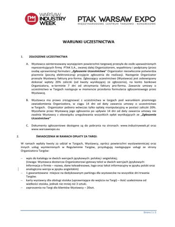 WARUNKI UCZESTNICTWA 1. ZGŁOSZENIE UCZESTNICTWA A. Wystawca zainteresowany wynajęciem powierzchni targowej przesyła do osób upoważnionych reprezentujących firmę PTAK S.A., zwanej dalej Organizatorem, wypełniony i podpisany (przez osobę uprawnioną) formularz „Zgłoszenie Uczestnictwa” Organizator niezwłocznie potwierdza pisemnie (pocztą elektroniczną) przyjęcie zgłoszenia do realizacji. Następnie Organizator przesyła Wystawcy fakturę pro-forma. Zgłaszający uczestnictwo (Wystawca) jest zobowiązany dokonać wpłaty 20% zaliczki (od kwoty wynikającej ze zgłoszenia), na konto bankowe Organizatora, w terminie 7 dni od otrzymania faktury pro-forma. Zawarcie umowy o uczestnictwo w Targach następuje w momencie przesłania formularza zgłoszeniowego przez Wystawcę. B. Wystawca ma prawo zrezygnować z uczestnictwa w targach pod warunkiem pisemnego zawiadomienia Organizatora, w ciągu 14 dni od daty zawarcia umowy o uczestnictwo w Targach. Organizator pobiera wówczas tylko opłatę manipulacyjną w postaci zaliczki 20%. Wycofanie przez Wystawcę jego zgłoszenia po upływie 14 dni od daty zawarcia umowy nie zwalnia Wystawcy z obowiązku uregulowania wszystkich opłat wynikających ze „Zgłoszenia Uczestnictwa” C. Dokumenty zgłoszeniowe dostępne są do pobrania na stronach: www.industryweek.pl oraz www.warsawexpo.eu 2. ŚWIADCZENIA W RAMACH OPŁATY ZA TARGI: W ramach wpłaty kwoty za udział w Targach, Wystawcy, oprócz powierzchni wystawienniczej oraz innych usług wymienionych w Regulaminie Targów, przysługują następujące usługi ze strony Organizatora Targów: wpis do katalogu w dwóch wersjach językowych: polskiej i angielskiej; (Uwaga: Wystawca dostarcza Organizatorowi gotowy tekst w dwóch wersjach językowych: Informacja o firmie – nazwa, dane teleadresowe, logo oraz tekst informacyjny w języku polski oraz analogiczna wersja w języku angielskim) 1 gwarantowane miejsce na dedykowanym parkingu dla wystawców na wszystkie dni trwania Targów. karty wystawcy dla obsługi stoiska (uprawniające do wejścia na Targi) – ilość uzależniona od wielkości stoiska, jednak nie mniej niż 3 sztuki. zaproszenia na Targi dla klientów Wystawcy – 20szt. Strona 1 z 3 3. NAJEM POWIERZCHNI Opłata za najem powierzchni wystawienniczej obejmuje: korzystanie przez Wystawcę z powierzchni wystawienniczej w okresie targów oraz podczas montażu i demontażu. korzystanie z części wspólnych dla Wystawców Targów; utrzymanie czystości przejść i korytarzy w hali; zabezpieczenie hali przez służby ochrony oraz zabezpieczenie p/poż.; reklamę i promocję Targów; bezpłatny dostęp do energii elektrycznej do 2kW (nie dotyczy powierzchni niezabudowanej). 4. CENNIK POWIERZCHNI WYSTAWIENNICZEJ WG RODZAJU I MIEJSCA. Powierzchnia niezabudowana - stoiska wyspowe, półwyspowe oraz narożne W skład tej powierzchni wchodzi powierzchnia o określonym metrażu pod zabudowę własną wystawcy, bez wyposażenia dodatkowego. Przy wykupieniu tej opcji koniecznością jest zamówienie odpowiedniego zasilania elektrycznego oraz ewentualnie niezbędnego wyposażenia dodatkowego. Wystawcy przysługują min. trzy karty wystawcy i jedna karta parkingowa. 100zł/ metr kwadratowy Powierzchnia zabudowana – stoiska szeregowe oraz narożne W skład tej powierzchni wchodzą ściany działowe i przyłącze prądu do 2kW (230 V). Wystawcy przysługują min. trzy karty wystawcy i jedna karta parkingowa. Przy wykupieniu tej opcji koniecznością jest zamówienie niezbędnego wyposażenia dodatkowego. Oznaczenie wystawcy: możliwość zamówienia fryzu reklamowego, możliwość wyklejenia szyb w szklanych boxach wystawienniczych lub „obrandowania” ścian zabudowy. 200/metr kwadratowy Cennik zawiera kwoty netto do których należy doliczyć 23 % VAT 5. USŁUGI DODATKOWE A. Usługi dodatkowe obejmują: przyłącza elektryczne, przyłącza wodno-kanalizacyjne, przyłącza sprężonego powietrza, teleinformatykę (Internet bezprzewodowy), sprzątanie, personel pomocniczy wyposażenie stoisk oraz usługi marketingowo-reklamowe. B. Zgłoszenie zapotrzebowania na wszelkie usługi dodatkowe, musi być przekazane organizatorowi najpóźniej 14 dni przed rozpoczęciem Targów. C. Szczegóły dotyczące usług dodatkowych obejmujące m.in. cenniki oraz sposoby realizacji znajdują się w osobnych formularzach zamówień usług dodatkowych. 6. WARUNKI PŁATNOŚCI A. Zamawiając powierzchnie wystawienniczą, Wystawca dokonuje zaliczkowej płatności w wysokości 20% kwoty wynikającej ze Zgłoszenia, na podstawie faktury pro-forma, w terminie do 7 dni od daty otrzymania faktury pro-forma. Pozostała kwota, obejmująca także dodatkowe Strona 2 z 3 usługi zamówione przez Wystawcę, musi być wpłacona w terminie do 7 dni od otrzymania końcowej faktury VAT wystawionej przez Organizatora. B. W razie zwłoki Wystawcy z zapłatą którejkolwiek części wynagrodzenia Organizatorowi przysługiwać będą dodatkowo odsetki za zwłokę w wysokości wynikającej z art. 359 § 2[1] Kodeksu cywilnego (odsetki ustawowe). C. Brak wpłaty całości należności za udział w targach upoważnia Organizatora do odmówienia Wystawcy udziału w Targach i pozbawia Wystawcę prawa do dochodzenia roszczeń z tego tytułu. D. W przypadku braku wpłaty w terminie określonym przez Organizatora, Wystawca wyraża zgodę na poddanie się egzekucji komorniczej na podstawie wydanego nakazu zapłaty (prawomocnego), do którego nie będzie wnosić sprzeciwu lub zarzutów. 7. DANE KONTAKTOWE Wszystkie zapytania, „Zgłoszenie Uczestnictwa” oraz niezbędne załączniki prosimy przesyłać na adres e-mail: Agnieszka Cieślik – Dyrektor ds. Targów - [email protected] – 518 739 275 Marcin Nowak – Project Manager - [email protected] – 518 739 097 Krzysztof Zieliński – Project Manager - [email protected] – 601 913 214 lub na adres: PTAK WARSAW EXPO Al. Katowicka 62, 05-830, Nadarzyn z dopiskiem Warsaw Industry Week S