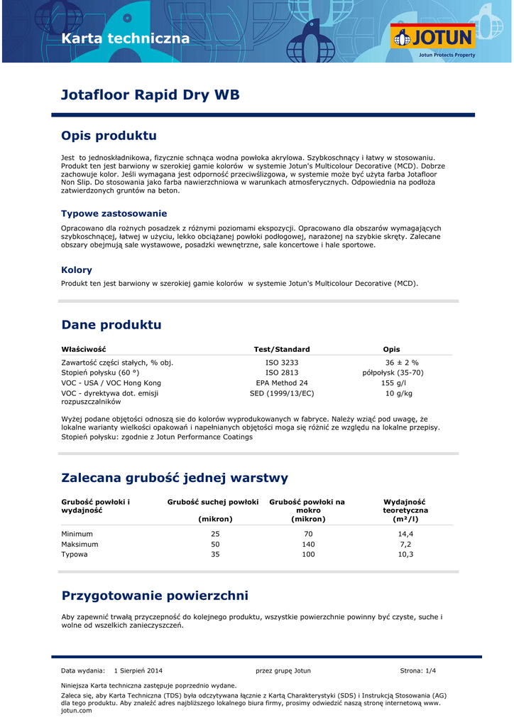 Karta techniczna 7560 1,5 farba alkidowa 7560 VValidationDate). 1 Jotafloor Rapid Dry WB Opis produktu Jest to jednoskładnikowa, fizycznie schnąca wodna powłoka akrylowa. Szybkoschnący i łatwy w stosowaniu. Produkt ten jest barwiony w szerokiej gamie kolorów w systemie Jotun's Multicolour Decorative (MCD). Dobrze zachowuje kolor. Jeśli wymagana jest odporność przeciwślizgowa, w systemie może być użyta farba Jotafloor Non Slip. Do stosowania jako farba nawierzchniowa w warunkach atmosferycznych. Odpowiednia na podłoża zatwierdzonych gruntów na beton. Typowe zastosowanie Opracowano dla rożnych posadzek z różnymi poziomami ekspozycji. Opracowano dla obszarów wymagających szybkoschnącej, łatwej w użyciu, lekko obciążanej powłoki podłogowej, narażonej na szybkie skręty. Zalecane obszary obejmują sale wystawowe, posadzki wewnętrzne, sale koncertowe i hale sportowe. Inne Kolory Produkt ten jest barwiony w szerokiej gamie kolorów w systemie Jotun's Multicolour Decorative (MCD). Dane produktu Właściwość Test/Standard Zawartość części stałych, % obj. Stopień połysku (60 °) VOC - USA / VOC Hong Kong VOC - dyrektywa dot. emisji rozpuszczalników ISO 3233 ISO 2813 EPA Method 24 SED (1999/13/EC) Opis 36 półpołysk 155 10 ±2% (35-70) g/l g/kg Wyżej podane objętości odnoszą sie do kolorów wyprodukowanych w fabryce. Należy wziąć pod uwagę, że lokalne warianty wielkości opakowań i napełnianych objętości moga się różnić ze względu na lokalne przepisy. Stopień połysku: zgodnie z Jotun Performance Coatings Zalecana grubość jednej warstwy Grubość powłoki i wydajność Grubość suchej powłoki (mikron) Grubość powłoki na mokro (mikron) Wydajność teoretyczna (m²/l) Minimum 25 70 14,4 Maksimum Typowa 50 35 140 100 7,2 10,3 Przygotowanie powierzchni Aby zapewnić trwałą przyczepność do kolejnego produktu, wszystkie powierzchnie powinny być czyste, suche i wolne od wszelkich zanieczyszczeń. Data wydania: 1 Sierpień 2014 przez grupę Jotun Strona: 1/4 Niniejsza Karta techniczna zastępuje poprzednio wydane. Zaleca się, aby Karta Techniczna (TDS) była odczytywana łącznie z Kartą Charakterystyki (SDS) i Instrukcją Stosowania (AG) dla tego produktu. Aby znaleźć adres najbliższego lokalnego biura firmy, prosimy odwiedzić naszą stronę internetową www. jotun.com Karta techniczna Jotafloor Rapid Dry WB Przygotowanie powierzchni - tabela zbiorcza Przygotowanie powierzchni Podłoże Minimum Powierzchnie pokryte Zalecane Czysta, sucha i nieuszkodzona, kompatybilna powłoka (ISO 12944-4 6.1) Czysta, sucha i nieuszkodzona, kompatybilna powłoka (ISO 12944-4 6.1) Aplikacja Metody stosowania Produkt może być nałożony przy pomocy W sprayu: Stosować natrysk bezpowietrzny (rozcieńczenie 5 %). Natrysk: Zalecany do niewielkich powierzchni oraz do wyrabiania krawędzi, spawów i miejsc trudnodostępnych.Należy zwrócić uwagę, aby osiągnąć specyfikowaną grubość powłoki. Wałek: Może być stosowany.Należy zwrócić uwagę, aby osiągnąć specyfikowaną grubość powłoki. Proporcje mieszania produktu (obj.) Wyrób jednoskładnikowy Rozcieńczalnik/Zmywacz Rozcieńczalnik: Woda Instrukcja aplikacji natryskiem bezpowietrznym Dysza (inch/1000): 15-19 Ciśnienie w dyszy (minimum): 150 bar/2100 psi Czas schnięcia i utwardzania Temperatura podłoża Pyłosuchość Chodzenie po wyschniętym Czas schnięcia do przemalowania, minimum 10 °C 1h 4h 4h 23 °C 40 °C 45 min 25 min 2h 1h 2h 1h Czasy schnięcia i utwardzania określane są w warunkach kontrolowanych temperatur i wilgotności względnej poniżej 85 % i w zakresie grubości suchej powłoki DFT produktu. Data wydania: 1 Sierpień 2014 przez grupę Jotun Strona: 2/4 Niniejsza Karta techniczna zastępuje poprzednio wydane. Zaleca się, aby Karta Techniczna (TDS) była odczytywana łącznie z Kartą Charakterystyki (SDS) i Instrukcją Stosowania (AG) dla tego produktu. Aby znaleźć adres najbliższego lokalnego biura firmy, prosimy odwiedzić naszą stronę internetową www. jotun.com Karta techniczna Jotafloor Rapid Dry WB Powierzchnia sucha (na dotyk): stan schnięcia, gdy niewielki nacisk palcem nie pozostawia odcisku lub nie ujawnia kleistości. Suchy piasek posypany, na powierzchni może być usunięty bez przywierania lub spowodowania uszkodzenia powierzchni. Chodzenie po wyschniętym : Minimalny czas , po którym powłoka może tolerować normalny ruch pieszy bez trwałych śladów, odcisków i innych uszkodzeń fizycznych. Czas schnięcia do przemalowania, minimum: najkrótszy dopuszczalny czas, po którym może być nakładana następna warstwa. Kompatybilność produktów W zależności od konkretnego przeznaczenia systemu powłok, produkt może być stosowany w kombinacji z różnymi farbami podkładowymi i nawierzchniowymi. Poniżej przedstawiono kilka przykładów. W celu uzyskania szczegółowych zaleceń, należy skontaktować się z firmą Jotun Poprzednia powłoka: wodorozcieńczalna akrylowa warstwa uszczelniająca Kolejna warstwa: wodorozcieńczalny akryl Opakowanie (typowe) Jotafloor Rapid Dry WB Objętość (litry) Wielkość opakowań (litry) 5 5 Wyżej podane objętości odnoszą się do kolorów wyprodukowanych w fabryce. Należy wziąć pod uwagę, że lokalne warianty wielkości opakowań i napełnianych objętości mogą się różnić ze względu na lokalne przepisy. Przechowywanie Produkt musi być przechowywany zgodnie z obowiązującymi przepisami krajowymi. Pojemniki powinny być przechowywane w suchym, chłodnym, dobrze wentylowanym pomieszczeniu z dala od źródeł ciepła i ognia. Pojemniki powinny być szczelnie zamknięte. Ostrożnie obchodzić się z produktem. Przydatność do stosowania w 23 °C Jotafloor Rapid Dry WB 12 miesiąc(e) W niektórych krajach czas przydatności wyrobu do stosowania może być krótszy, co podyktowane jest przez lokalne przepisy. Powyżej podany jest minimalny czas przydatności wyrobu do stosowania, po