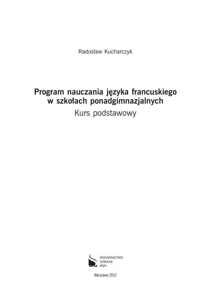 Radosław Kucharczyk Program nauczania języka francuskiego w szkołach ponadgimnazjalnych Kurs podstawowy Warszawa 2012 Redaktor Paulina Słupek Redaktor techniczny Maryla Broda Skład i łamanie Marcin Szcześniak Copyright © by Wydawnictwo Szkolne PWN Sp. z o.o. Warszawa 2012 Spis treści 1. Informacje wstępne . . . . . . . . . . . . . . . . . . . . . . . . . . . . . . . . . . . . . . . . . . . . . . . . . . . . . . . . 1.1. 1.2. 1.3. 1.4. Ogólna charakterystyka programu Koncepcja metodyczna programu Adresaci programu . . . . . . . . . . . Warunki realizacji programu . . . . . . . . . . . . . . . . . . . . . . . . . . . . . . . . . . . . . . . . . . . . . . . . . . . . . . . . . . . . . . . . . . . . . . . . . . . . . . . . . . . . . . . . . . . . . . . . . . . . . . . . . . . . . . . . . . . . . . . . . . . . . . . . . . . . . . . . . . . . . . . . . . . . . . . . . . . . . . . . . . . . . . . . . . . . . . . . . . . . 4 4 5 6 6 2. Cele kształcenia na IV etapie edukacyjnym (podstawa programowa IV.0 i IV.1 w zakresie podstawowym) . . . . . . . . . . . . . . . . . . . . . . . . . . . . . . . . . . . . . . . . . . . . . . . . . . . . . . . . . . . . 7 2.1. Cele kształcenia ogólnego . . . . . . . . . . . . . . . . . . . . . . . . . . . . . . . . . . . . . . . . . . . . . . . . . . 2.2. Ogólne cele kształcenia językowego . . . . . . . . . . . . . . . . . . . . . . . . . . . . . . . . . . . . . . . . . . . 7 7 3. Treści nauczania . . . . . . . . . . . . . . . . . . . . . . . . . . . . . . . . . . . . . . . . . . . . . . . . . . . . . . . . . . 10 3.1. Wymagania szczegółowe . . . . . . . . . . . . . . . . . . . . . . . . . . . . . . . . . . . . . . . . . . . . . . . . . . 10 3.2. Struktury gramatyczne . . . . . . . . . . . . . . . . . . . . . . . . . . . . . . . . . . . . . . . . . . . . . . . . . . . . 14 4. Metody osiągania celów kształcenia . . . . . . . . . . . . . . . . . . . . . . . . . . . . . . . . . . . . . . . . . . . 18 4.1. 4.2. 4.3. 4.4. 4.5. 4.6. 4.7. 4.8. Metodyka nauczania Metodyka nauczania Metodyka nauczania Metodyka nauczania Metodyka nauczania Metodyka nauczania Metodyka nauczania Wybór podręcznika i rozumienia ze słuchu (rozumienia wypowiedzi ustnej) . . . . . . czytania ze zrozumieniem (rozumienia wypowiedzi pisemnej) wypowiedzi pisemnej (tworzenia wypowiedzi pisemnej) . . . . wypowiedzi ustnej (tworzenia wypowiedzi ustnej) . . . . . . . . . interakcji ustnej (reagowania na wypowiedź ustną) . . . . . . . . interakcji pisemnej (reagowania na wypowiedź pisemną) . . . mediacji (przetwarzania wypowiedzi) . . . . . . . . . . . . . . . . . materiałów dydaktycznych . . . . . . . . . . . . . . . . . . . . . . . . . . . . . . . . . . . . . . . . . . . . . . . . . . . . . . . . . . . . . . . . . . . . . . . . . . . . . . . . . . . . . . . . . . . . . . . . . 18 19 20 21 22 26 27 27 5. Ocenianie osiągnięć i postępów ucznia . . . . . . . . . . . . . . . . . . . . . . . . . . . . . . . . . . . . . . . . 28 5.1. Typologia oceniania według Europejskiego systemu 5.2. Sposoby oceniania sprawności językowych . . . . . . 5.2.1. Słuchanie / czytanie . . . . . . . . . . . . . . . . 5.2.2. Słownictwo . . . . . . . . . . . . . . . . . . . . . . . 5.2.3. Gramatyka . . . . . . . . . . . . . . . . . . . . . . . 5.3. Karty do oceny wypowiedzi uczniów . . . . . . . . . . 5.4. Samoocena ucznia . . . . . . . . . . . . . . . . . . . . . . . opisu kształcenia językowego ...................... ...................... ...................... ...................... ...................... ...................... . . . . . . . . . . . . . . . . . . . . . . . . . . . . . . . . . . . . . . . . . . . . . . . . . . . . . . . . . . . . . . . . . . . . . . 28 29 29 32 35 37 38 6. Konstruowanie scenariusza lekcji . . . . . . . . . . . . . . . . . . . . . . . . . . . . . . . . . . . . . . . . . . . . . 39 7. Bibliografia . . . . . . . . . . . . . . . . . . . . . . . . . . . . . . . . . . . . . . . . . . . . . . . . . . . . . . . . . . . . . . . 42 Informacje o autorze programu . . . . . . . . . . . . . . . . . . . . . . . . . . . . . . . . . . . . . . . . . . . . . . . . . . 43 Uwaga! Recenzja niniejszego programu wydana przez dra Macieja Smuka (z Wydziału Neofilologii Uniwersytetu Warszawskiego, Instytutu Romanistyki – Zakładu Dydaktyki i Metodyki Języków Romańskich) znajduje się na stronie Wydawnictwa Szkolnego PWN (www.wszpwn.com.pl). 3 1. Informacje wstępne 1.1. Ogólna charakterystyka programu Niniejszy program nauczania bazuje na trzech podstawowych dokumentach regulujących kwestie związane z nauczaniem języków obcych w szkołach ponadgimnazjalnych w Polsce, czyli: – Rozporządzeniu Ministra Edukacji Narodowej z dnia 23 grudnia 2008 r. w sprawie podstawy programowej wychowania przedszkolnego oraz kształcenia ogólnego w poszczególnych typach szkół (Dz.U. z 2009 r. Nr 4, poz. 17); – Rozporządzeniu Ministra Edukacji Narodowej z dnia 10 sierpnia 2001r. w sprawie standardów wymagań będących podstawą przeprowadzania sprawdzianów i egzaminów (Dz.U. z 2001r. Nr 92, poz.1020, z późniejszymi zmianami); – Informatorze o egzaminie maturalnym od roku szkolnego 2011/2012 oraz na dokumencie Rady Europy (RE) – Europejskim systemie opisu kształcenia językowego: uczenie się, nauczanie, ocenianie (od tej chwili ESOKJ). Nowa podstawa programowa wpłynęła znacząco na nauczanie języków obcych w polskiej szkole. Nakłada ona bowiem obowiązek wprowadzenia pierwszego języka obcego już w szkole podstawowej (I i II etap edukacyjny). W gimnazjum (III etap edukacyjny) uczeń kontynuuje naukę tego języka oraz rozpoczyna naukę drugiego języka. W szkole ponadgimnazjalnej (IV etap edukacyjny) każdy uczeń uczy się co najmniej dwóch języków obcych. Przynajmniej jeden z języków powinien być kontynuacją nauki rozpoczętej w szkole podstawowej lub gimnazjum. Układ nauczania języków obcych ilustruje poniższa tabela zaczerpnięta ze strony 14. Podst