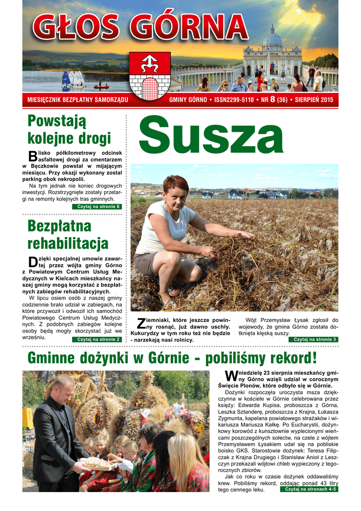 GŁOS GÓRNA MIESIĘCZNIK BEZPŁATNY SAMORZĄDU Powstają kolejne drogi B lisko półkilometrowy odcinek asfaltowej drogi za cmentarzem w Bęczkowie powstał w mijającym miesiącu. Przy okazji wykonany został parking obok nekropolii. Na tym jednak nie koniec drogowych inwestycji. Rozstrzygnięte zostały przetargi na remonty kolejnych tras gminnych. GMINY GÓRNO • ISSN2299-5110 • NR 8 (36) • SIERPIEŃ 2015 Susza Czytaj na stronie 6 Bezpłatna rehabilitacja D zięki specjalnej umowie zawartej przez wójta gminy Górno z Powiatowym Centrum Usług Medycznych w Kielcach mieszkańcy naszej gminy mogą korzystać z bezpłatnych zabiegów rehabilitacyjnych. W lipcu osiem osób z naszej gminy codziennie brało udział w zabiegach, na które przywoził i odwoził ich samochód Powiatowego Centrum Usług Medycznych. Z podobnych zabiegów kolejne osoby będą mogły skorzystać już we wrześniu. Czytaj na stronie 2 Z iemniaki, które jeszcze powinny rosnąć, już dawno uschły. Kukurydzy w tym roku też nie będzie - narzekają nasi rolnicy. Wójt Przemysław Łysak zgłosił do wojewody, że gmina Górno została dotknięta klęską suszy. Czytaj na stronie 3 Gminne dożynki w Górnie - pobiliśmy rekord! W niedzielę 23 sierpnia mieszkańcy gminy Górno wzięli udział w corocznym Święcie Plonów, które odbyło się w Górnie. Dożynki rozpoczęła uroczysta msza dziękczynna w kościele w Górnie celebrowana przez księży: Edwarda Kupisa, proboszcza z Górna, Leszka Sztanderę, proboszcza z Krajna, Łukasza Zygmunta, kapelana powiatowego strażaków i wikariusza Mariusza Kałkę. Po Eucharystii, dożynkowy korowód z kunsztownie wyplecionymi wieńcami poszczególnych sołectw, na czele z wójtem Przemysławem Łysakiem udał się na pobliskie boisko GKS. Starostowie dożynek: Teresa Filipczak z Krajna Drugiego i Stanisław Anioł z Leszczyn przekazali wójtowi chleb wypieczony z tegorocznych zbiorów. Jak co roku w czasie dożynek oddawaliśmy krew. Pobiliśmy rekord, oddając ponad 43 litry Czytaj na stronach 4-5 tego cennego leku. DARMOWE ZABIEGI REHABILITACYJNE Dzięki umowie zawartej przez wójta gminy Górno z Powiatowym Centrum Usług Medycznych w Kielcach mieszkańcy naszej gminy mogą korzystać z bezpłatnych zabiegów rehabilitacyjnych. Od 14 do 27 lipca osiem osób z naszej gminy codziennie brało udział w zabiegach, na które przywoził i odwoził ich samochód Powiatowego Centrum Usług Medycznych. Z podobnych zabiegów kolejne osoby będą mogły skorzystać już w listopadzie. Zainteresowani mogą się zgłaszać do Gminnego Ośrodka Pomocy Społecznej w Górnie. Z rehabilitacji mogą skorzystać wszyscy mieszkańcy gminy Górno posiadający orzeczenie o niepełnosprawności oznaczonej symbolem 05R - informuje Dorota Kwiatek, pełniąca obowiązki kierownika Gminnego Ośrodka Pomocy Społecznej w Górnie. Nowy wóz dla strażaków STO TYSIĘCY DLA SZKÓŁ Ponad sto tysięcy dla naszych szkół z Ministerstwa Edukacji zdobyli gminni urzędnicy. - 51 tysięcy złotych dostaniemy na tak zwaną edukację włączającą, czyli na dostosowanie klas do potrzeb osób niepełnosprawnych w szkołach, do których takie dzieci uczęszczają. Z kolei 56 tysięcy złotych dostaniemy na doposażenie szkolnych stołówek - informuje Barbara Raczyńska, kierownik Samorządowego Zespołu Obsługi Szkół w Górnie. Nasza rozmówczyni informuje, że Urząd Gminy stara się także o pieniądze na doposażenie i utworzenie, tam gdzie ich nie ma, szkolnych gabinetów lekarskich. Gmina zgłosiła także swój udział w programie „Książki naszych marzeń”, w ramach którego mamy szansę na doposażenie szkolnych bibliotek. REFERENDUM - GDZIE GŁOSUJEMY? Już 6 września odbędzie się referendum. Odpowiadać będziemy na trzy pytania: „1. Czy jest Pani/Pan za wprowadzeniem jednomandatowych okręgów wyborczych w wyborach do Sejmu Rzeczypospolitej Polskiej? 2. Czy jest Pani/Pan za utrzymaniem dotychczasowego sposobu finansowania partii politycznych z budżetu państwa? 3. Czy jest Pani/Pan za wprowadzeniem zasady ogólnej rozstrzygania wątpliwości co do wykładni przepisów prawa podatkowego na korzyść podatnika?” Gdzie znajdują się obwodowe komisje referendalne?: - mieszkańcy sołectw Bęczków i Podmąchocice będą głosowali w Zespole Szkół w Bęczkowie (Bęczków 195), - mieszkańcy sołectwa Cedzyna będą głosowali w Zespole Szkolno-Przedszkolnym w Cedzynie (Cedzyna 79), - mieszkańcy sołectw Górno i Górno Parcele będą głosowali w Zespole Szkół w Górnie (Górno 82 A), - mieszkańcy sołectw Krajno Pierwsze, Krajno Zgórze, Krajno Drugie, Krajno-Parcele głosować będą w Zespole Szkół w Krajnie (Krajno Pierwsze 153A), - mieszkańcy Leszczyn głosują w szkole w Leszczynach (Leszczyny 33), - mieszkańcy sołectwa Radlin będą głosowali w Zespole Szkolno-Przedszkolnym w Radlinie (Radlin 86), - mieszkańcy sołectwa Skorzeszyce będą głosować w Szkole Podstawowej w Skorzeszycach (Skorzeszyce 165 b), - mieszkańcy sołectwa Wola Jachowa będą mogli oddawać swoje głosy w Zespole Szkół w Woli Jachowej (Wola Jachowa 136). 2 G Ł O S G Ó R N A • n r 8 (3 6) • S I E R P I E Ń 2 015 T o perełka wśród wozów strażackich. Niejedna jednostka Państwowej Straży Pożarnej może wam go pozazdrościć - mówił Ireneusz Żak, prezes Zarządu Powiatowego Związku Ochotniczych Straży Pożarnych podczas przekazania nowego wozu druhom z Górna. Nowy wóz bojowy marki Man kosztował ponad 720 tysięcy złotych. Jego zakup kwotą 120 tysięcy złotych dofinansowała Państwowa Straż Pożarna oraz Krajowy System Ratowniczo-Gaśniczy, w skład którego wchodzi jednostka w Górnie. 150 tysięcy ofiarował na ten cel Zarząd Wojewódzki ZOSP RP, 80 tys. zł przekazał Wojewódzki Fundusz Ochrony Środowiska. Gmina Górno zakup samochodu dofinansowała kwotą ponad 374 tys. zł. Z wozu cieszy się sołtys Marian Grzegolec, który zabiegał o niego od lat. T