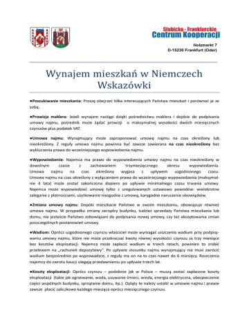 Holzmarkt 7 D-15230 Frankfurt (Oder) __________________________________________________________________________________ Wynajem mieszkan w Niemczech Wskazówki ●Poszukiwanie mieszkania: Proszę obejrzeć kilka interesujących Państwa mieszkań i porównać je ze sobą. ●Prowizja maklera: Jeżeli wynajem nastąpi dzięki pośrednictwu maklera i dojdzie do podpisania umowy najmu, pośrednik może żądać prowizji o maksymalnej wysokości dwóch miesięcznych czynszów plus podatek VAT. ●Umowa najmu: Wynajmujący może zaproponować umowę najmu na czas określony lub nieokreślony. Z reguły umowa najmu powinna być zawsze zawierana na czas nieokreślony bez wykluczenia prawa do wcześniejszego wypowiedzenia najmu. ●Wypowiedzenie: Najemca ma prawo do wypowiedzenia umowy najmu na czas nieokreślony w dowolnym czasie z zachowaniem trzymiesięcznego okresu wypowiedzenia. Umowa najmu na czas określony wygasa z upływem uzgodnionego czasu. Umowa najmu na czas określony z wyłączeniem prawa do wcześniejszego wypowiedzenia (maksymalnie 4 lata) może zostać zakończona dopiero po upływie minimalnego czasu trwania umowy. Najemca może wypowiedzieć umowę tylko z uregulowanych ustawowo powodów: wielokrotne zaleganie z płatnościami, użytkowanie niezgodne z umową, karygodne naruszenie obowiązków. ●Zmiana umowy najmu: Dopóki mieszkacie Państwo w swoim mieszkaniu, obowiązuje również umowa najmu. W przypadku zmiany zarządcy budynku, tudzież sprzedaży Państwa mieszkania lub domu, nie jesteście Państwo zobowiązani do podpisania nowej umowy, czy też akceptowania zmian poszczególnych postanowień umowy. ●Wadium: Oprócz uzgodnionego czynszu właściciel może wymagać uiszczenia wadium przy podpisywaniu umowy najmu, które nie może przekraczać kwoty równej wysokości czynszu za trzy miesiące bez kosztów eksploatacji. Najemca może zapłacić wadium w trzech ratach, powinien to zrobić przelewem na „rachunek depozytowy”. Po upływie stosunku najmu wynajmujący nie musi zwrócić wadium bezpośrednio po wyprowadzce, z reguły ma on na to czas nawet do 6 miesięcy. Roszczenia najemcy do zwrotu kaucji ulegają przedawnieniu po upływie trzech lat. ●Koszty eksploatacji: Oprócz czynszu – podobnie jak w Polsce – muszą zostać zapłacone koszty eksploatacji (takie jak ogrzewanie, woda, usuwanie śmieci, winda, energia elektryczna, ubezpieczenie części wspólnych budynku, sprzątanie domu, itp.). Opląty te należy ustalić w umowie najmu i prawie zawsze płacić zaliczkowo każdego miesiąca oprócz miesięcznego czynszu. ●Wysokość zaliczki na poczet kosztów eksploatacji: Wynajmujący powinien (nie musi) uzgodnić odpowiednie zaliczki na poczet kosztów eksploatacji. Macie Państwo prawo wglądu w certyfikat energetyczny domu i powinniście sprawdzić, czy dom ma dobrą izolacje cieplną. Domy o zapotrzebowaniu na energię ponad 150 kWh / mkw rocznie mają wysokie koszty ogrzewania (od 800 do 2.000 Euro rocznie). Niskie koszty ogrzewania są tylko w domach o wartości mniejszej niż 80 kWh / mkw rocznie (poniżej 600 Euro rocznie), jeśli jest się oszczędnym w ogrzewaniu mieszkania. ●Rozliczenie kosztów eksploatacji: Należy kazać sobie wyjaśnić sposób odczytywania liczników zużycia wody i centralnego ogrzewania i regularnie zapisywać (co miesiąc) stan zużycia wody i centralnego ogrzewania. Rozliczenie następuje raz w roku za rok ubiegły. Najemca ma prawo do sprawdzenia naliczonych kosztów eksploatacji na podstawie oryginalnego dokumentu. ●Zaświadczenie o aktualnej sytuacji finansowej: Wynajmujący często wymaga zaświadczenia o dochodach osoby zainteresowanej wynajmem. Równie często wymagane jest zaświadczenie, że osoba zainteresowana wynajmem nie ma długów z tytułu najmu lokalu u byłych wynajmujących. ●Porządek w budynku: W niektórych domach czynszowych części wspólne budynku (np. klatki schodowe) sprzątane są przez firmę. Częsty też jest wariant, że mieszkańcy sprzątają sami zgodnie z ustalonymi dyżurami (Hausordnung). ●Porozumiewanie się: Rozmów i negocjacji z wynajmującym są zazwyczaj prowadzone w języku niemieckim (z wyjątkiem niektórych przypadkach). Dokumenty takie jak umowa najmu itd. są dostępne tylko w języku niemieckim. Osoby zainteresowane wynajmem, które nie znają języka niemieckiego w wystarczającym stopniu, powinny poszukać wsparcia osoby znającej język. ●Podnajemca: Zakwaterowanie w mieszkaniu członków bliskiej rodziny (małżonka, dzieci, rodziców) nie jest podnajęciem i dlatego też nie podlega obowiązkowi posiadania zezwolenia. Jednakże bez pozwolenia wynajmującego, najemca nie jest uprawniony do przekazywania wynajmowanego mieszkania osobom trzecim, dotyczy to również życiowego partnera/partnerki. Goście nie są lokatorami, i mogą przebywać w mieszkaniu najemcy przez kilka tygodni, bez zgody wynajmującego. ●Usterki: Za konserwacje i naprawy w wynajmowanej nieruchomości jest odpowiedzialny jej właściciel. Jeżeli najemca sam spowodował szkodę, musi on ponosić koszty naprawy szkód. ●Przebudowa przez najemcę: Najemca może dokonywać przebudowy mieszkania. Jednak, jeżeli planuje on ingerencję we własność wynajmującego, potrzebuje on do tego zawsze pisemnej zgody od właściciela. Pozwolenie powinno również określać to, w jakim stanie powinien pozostawić mieszkanie najemca przy wyprowadzce. Często najemca powinien przywrócić mieszkanie do stanu pierwotnego, dlatego nie powinno się przeprowadzać niektórych zmian w zabudowie. Projekt współfinansowany ze środków Europejskiego Funduszu Rozwoju Regionalnego w ramach Programu Operacyjnego Współpracy Transgranicznej Polska (Województwo Lubuskie) – Brandenburgia 2007-2013. Pokonać granice poprzez wspólne inwestycje w przyszłość