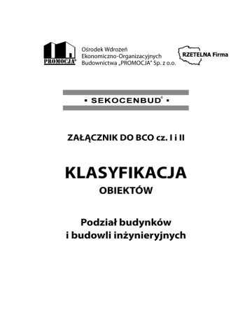 Ośrodek Wdrożeń Ekonomiczno-Organizacyjnych Budownictwa „PROMOCJA” Sp. z o.o. ZAŁĄCZNIK DO BCO cz. I i II KLASYFIKACJA OBIEKTÓW Podział budynków i budowli inżynieryjnych REDAKTOR NACZELNA WYDAWNICTW SEKOCENBUD Mariola Gala-de Vacqueret REDAKTOR PROWADZĄCY ZESZYT Małgorzata Płaneta ZESPÓŁ AUTORSKI Mariola Gala-de Vacqueret, Andrzej Górniecki, Paweł Kaczmarski, Małgorzata Płaneta, Wiesława Sikorska-Ożgo, Andrzej Wypych © Copyright by Ośrodek Wdrożeń Ekonomiczno-Organizacyjnych Budownictwa „PROMOCJA” Sp. z o.o., Warszawa 2016. - WSZELKIE PRAWA ZASTRZEŻONE Kopiowanie i reprodukowanie zarówno całości jak i fragmentów niniejszej publikacji jest niedozwolone ISSN 1231-2517 SPIS TREŚCI Część I. WPROWADZENIE.......................................................................................................................................... 4 1. Uwagi wstępne ...................................................................................................................................... 4 2. Opis i struktura zeszytu (załącznika): ............................................................................................. 4 CZĘŚĆ II. PODZIAŁ BUDYNKÓW (OBIEKTÓW KUBATUROWYCH) W UKŁADZIE ELEMENTOWYM wg SEKOCENBUD .................................................................................................... 9 ZAŁĄCZNIK 1.1. BUDYNKI – wg PKOB 2002 r. ....................................................................................... 9 CZĘŚĆ III. PODZIAŁ BUDOWLI INŻYNIERYJNYCH NA CZĘŚCI OBIEKTU, ELEMENTY KONSTRUKCYJNE I ROZLICZENIOWE ...............................................................................................21 ZAŁĄCZNIK 2.1. BUDOWLE PRZEMYSŁOWE I SKŁADOWE NAZIEMNE – wg GUS-KOB 1989 r. ...............................................................................................21 ZAŁĄCZNIK 2.2.a. DROGI KOŁOWE (budowle inżynierskie lądowe) – wg GUS-KOB 1989 r. ..............................................................................................23 ZAŁĄCZNIK 2.2.b. AUTOSTRADY I DROGI EKSPRESOWE, ULICE I DROGI POZOSTAŁE – klasyfikacja wg SEKOCENBUD na podstawie GDDKiA .....................................28 ZAŁĄCZNIK 2.2.c. INFRASTRUKTURA TRANSPORTU – drogi szynowe kolejowe – (klasyfikacja wg SEKOCENBUD) ..........................................................................36 ZAŁĄCZNIK 2.2.d. INFRASTRUKTURA TRANSPORTU – drogi szynowe na obszarach miejskich (klasyfikacja wg SEKOCENBUD) ...........................................................43 ZAŁĄCZNIK 2.3.a. MOSTY I WIADUKTY – wg GUS-KOB 1989 r. ....................................................51 ZAŁĄCZNIK 2.3.b. MOSTY, WIADUKTY I ESTAKADY – klasyfikacja wg SEKOCENBUD na podstawie GDDKiA ..............................................................................................54 ZAŁĄCZNIK 2.4. RUROCIĄGI I PRZEWODY – wg GUS-KOB 1989 r. ............................................61 ZAŁĄCZNIK 2.5. BUDOWLE PRZEMYSŁOWE I SKŁADOWE PODZIEMNE ORAZ INNE PODZIEMNE (poza górniczymi) – wg GUS-KOB 1989 r. ....................65 ZAŁĄCZNIK 2.6. BUDOWLE SPORTOWE I REKREACYJNE – wg GUS-KOB 1989 r. .................66 ZAŁĄCZNIK 2.7. BUDOWLE INŻYNIERSKIE LĄDOWE, POZOSTAŁE – wg GUS-KOB 1989 r. ...............................................................................................69 ZAŁĄCZNIK 2.8. UJĘCIA I ZRZUTY WODY; BUDOWLE OCZYSZCZALNI WÓD I ŚCIEKÓW (budowle inżynierskie wodne) – wg GUS-KOB 1989 r. ...........71 ZAŁĄCZNIK 2.9. LINIE I SIECI ELEKTROENERGETYCZNE, ELEKTROTRAKCYJNE I TELEKOMUNIKACYJNE – wg GUS-KOB 1989 r. ...............................................73 ZAŁĄCZNIK 2.10. BUDOWLE INŻYNIERYJNE POZOSTAŁE – wg GUS-KOB 1989 r. ..................78 KLASYFIKACJA 2016 3 Część I. WPROWADZENIE 1. Uwagi wstępne Ze względy na dużą ilość obiektów będących nośnikami cen publikowanych w Biuletynie cen obiektów budowlanych (BCO): – część I – obiekty kubaturowe, – część II – obiekty inżynieryjne. oraz dużą objętość tych pozycji wydawniczych, wyodrębniliśmy z nich stałe elementy zbiorów tj. podziały obiektów na stany robót (części konstrukcji – w budowlach), elementy scalone i elementy rozliczeniowe. 2. Opis i struktura zeszytu (załącznika): 2.1. Zeszyt składa się z III części: Część I. Wprowadzenie. Część II. Podział budynków (obiektów kubaturowych) w układzie elementowym. Część III. Podział budowli inżynieryjnych na części obiektu, elementy konstrukcyjne (scalone) i rozliczeniowe. 2.2. Podział budynków w układzie elementowym przedstawiony jest w części II zeszytu, w formie załącznika 1.1. („Budynki”) sporządzonego dla obiektów, których zestaw cen zagregowanych publikujemy w „Biuletynie cen obiektów budowlanych BCO cz. I”. Podział ten odgrywa ważną rolę w korzystaniu z publikowanych cen, gdyż określa jakie roboty wchodzą w skład zagregowanych pozycji (stanów i elementów scalonych), a tym samym pozwala na porównywanie cen elementów scalonych, stanów czy obiektów a także wykorzystywanie ich do wyceny wartości robót w różnych fazach i etapach przygotowania inwestycji do realizacji. Symbolika i terminologia części obiektów (stanów) i elementów scalonych danego obiektu oraz ich jednostki miary podane w tablicach cen „Biuletynu cen obiektów budowlanych BCO cz. I” są zgodne z podziałem określonym w: Załączniku 1.1. BUDYNKI – wg PKOB 2002 r. Składowe części obiektów w „podziale” mają ustaloną symbolikę pięciocyfrową, której pierwsza cyfra stanowi symbol odpowiedniej grupy kosztów Wartości Kosztorysowej Inwestycji (WKI) wg rozporządzenia Rady Ministrów z dnia 2 grudnia 2010 r. w sprawie szczegółowego sposobu i trybu finansowania inwestycji z budżetu państwa (Dz. U. Nr 238, poz. 1579), druga – sekcji obiektów wg Polskiej Klasyfikacji 