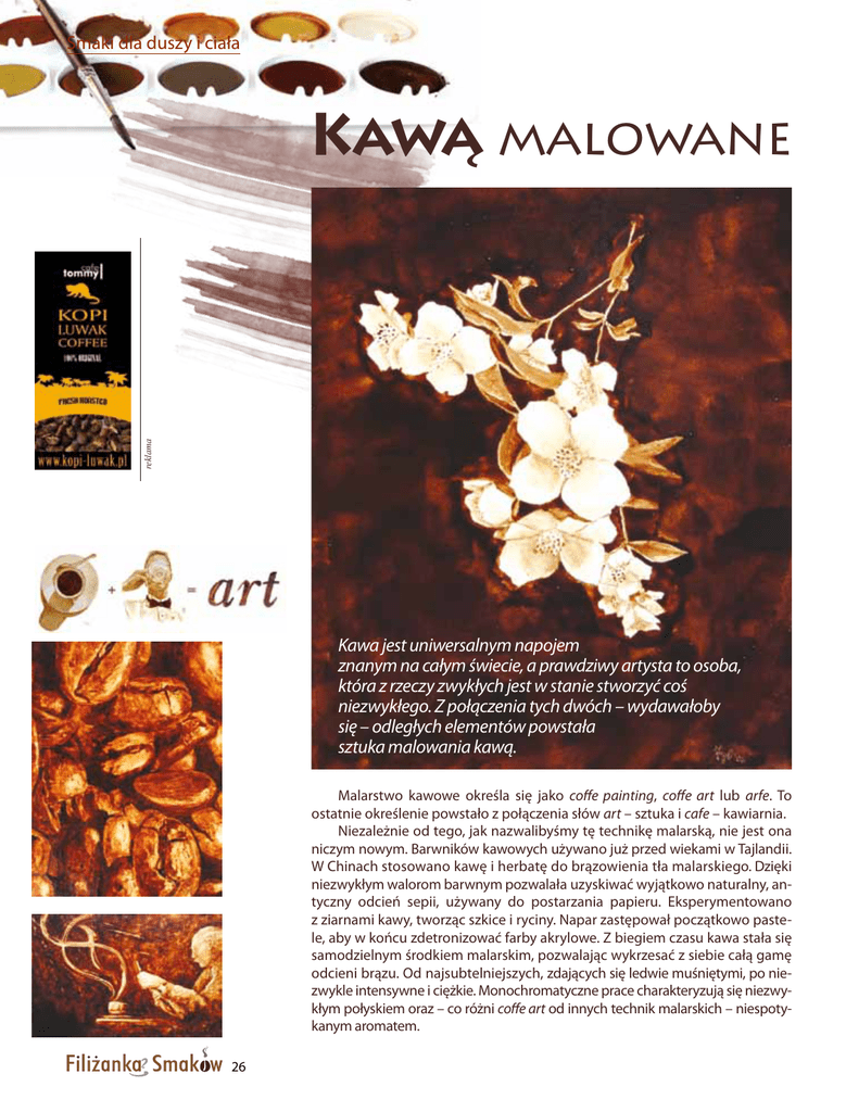 Smaki dla duszy i ciała reklama Kawą malowane Kawa jest uniwersalnym napojem znanym na całym świecie, a prawdziwy artysta to osoba, która z rzeczy zwykłych jest w stanie stworzyć coś niezwykłego. Z połączenia tych dwóch – wydawałoby się – odległych elementów powstała sztuka malowania kawą. Malarstwo kawowe określa się jako coffe painting, coffe art lub arfe. To ostatnie określenie powstało z połączenia słów art – sztuka i cafe – kawiarnia. Niezależnie od tego, jak nazwalibyśmy tę technikę malarską, nie jest ona niczym nowym. Barwników kawowych używano już przed wiekami w Tajlandii. W Chinach stosowano kawę i herbatę do brązowienia tła malarskiego. Dzięki niezwykłym walorom barwnym pozwalała uzyskiwać wyjątkowo naturalny, antyczny odcień sepii, używany do postarzania papieru. Eksperymentowano z ziarnami kawy, tworząc szkice i ryciny. Napar zastępował początkowo pastele, aby w końcu zdetronizować farby akrylowe. Z biegiem czasu kawa stała się samodzielnym środkiem malarskim, pozwalając wykrzesać z siebie całą gamę odcieni brązu. Od najsubtelniejszych, zdających się ledwie muśniętymi, po niezwykle intensywne i ciężkie. Monochromatyczne prace charakteryzują się niezwykłym połyskiem oraz – co różni coffe art od innych technik malarskich – niespotykanym aromatem. 26 Smaki dla duszy i ciała Jean-Jacques Rousseau pisał: „Gdy parzą kawę obok mojego domu, śpieszę otworzyć drzwi, aby wpuścić cały aromat”. Współczesnym artystom udało się uchwycić tę niezwykłą chwilę i – wzbogacając ją o emocje – tworzyć dzieła na miarę wielkich mistrzów malarstwa. Okazuje się, że „kawa, woda, papier i pędzel plus koncepcja i talent potrafią przekształcić puste płótno w dzieło sztuki”. W miarę jak coffe painting zyskiwało nowych zwolenników, zmieniały się techniki malarskie. Zaczęto stosować różne gatunki napoju kawowego o niejednolitych odcieniach i rozmaitym nasyceniu brązu. Łączono kawę z innymi substancjami – mąką, klejem do drewna, przyprawami itp. Przypominało to praktyki znane z renesansu, gdy artyści musieli sami mieszać barwniki, żeby uzyskać konkretny kolor czy wymarzoną teksturę. Tematycznie twórczość arfe, nie odbiegając od innych gatunków sztuki, odzwierciedla rzeczywistość bardzo interdyscyplinarnie. Kawa nie służy jedynie do oddawania kawiarnianych klimatów – powstają z niej portrety, pejzaże czy kopie prac znanych mistrzów. Dziś największą popularnością coffe painting cieszy się w Stanach Zjednoczonych. Ma też wielu zwolenników w Azji. Najsłynniejszymi są Pornchai Lerthammasiri z Tajlandii oraz Mira i Amita z Indii. W Polsce z powodzeniem maluje kawą i wystawia swoje prace Mariusz Goławski. Za oceanem prym wiodą Angel Sarkela-Saur i Andrew Saur – małżeństwo, dla którego malowanie kawą jest życiowym wyzwaniem. Zaczęli niepozornie, na wystawie w jednej z kawiarni, aby w ciągu dekady stać się niekwestionowanymi mistrzami w malarstwie kawowym. Stworzyli cały ruch poświęcony tej dziedzinie – Coffee Art. Ich prace były prezentowane nie tylko w tradycyjnych galeriach, ale także w nietypowych miejscach ekspozycyjnych na świecie. Specjalnością innej amerykańskiej artystki, dawnej baristki Karen Eland, są reminiscencje największych dzieł światowego malarstwa, inspirowane i wzbogacone wątkami kawowymi. Agnieszka Załubska-Giruć www.artdesign.org.pl Andrew Saur i Angel Sarkela-Saur 27