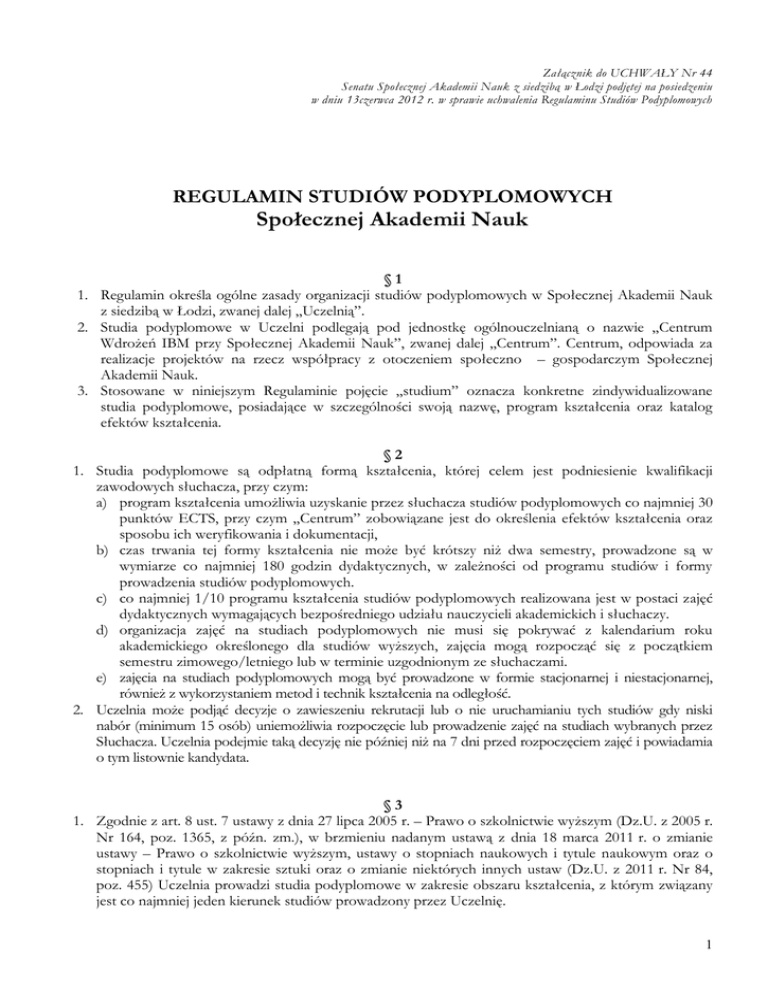 Załącznik do UCHWAŁY Nr 44 Senatu Społecznej Akademii Nauk z siedzibą w Łodzi podjętej na posiedzeniu w dniu 13czerwca 2012 r. w sprawie uchwalenia Regulaminu Studiów Podyplomowych REGULAMIN STUDIÓW PODYPLOMOWYCH Społecznej Akademii Nauk §1 1. Regulamin określa ogólne zasady organizacji studiów podyplomowych w Społecznej Akademii Nauk z siedzibą w Łodzi, zwanej dalej „Uczelnią”. 2. Studia podyplomowe w Uczelni podlegają pod jednostkę ogólnouczelnianą o nazwie „Centrum Wdrożeń IBM przy Społecznej Akademii Nauk”, zwanej dalej „Centrum”. Centrum, odpowiada za realizacje projektów na rzecz współpracy z otoczeniem społeczno – gospodarczym Społecznej Akademii Nauk. 3. Stosowane w niniejszym Regulaminie pojęcie „studium” oznacza konkretne zindywidualizowane studia podyplomowe, posiadające w szczególności swoją nazwę, program kształcenia oraz katalog efektów kształcenia. §2 1. Studia podyplomowe są odpłatną formą kształcenia, której celem jest podniesienie kwalifikacji zawodowych słuchacza, przy czym: a) program kształcenia umożliwia uzyskanie przez słuchacza studiów podyplomowych co najmniej 30 punktów ECTS, przy czym „Centrum” zobowiązane jest do określenia efektów kształcenia oraz sposobu ich weryfikowania i dokumentacji, b) czas trwania tej formy kształcenia nie może być krótszy niż dwa semestry, prowadzone są w wymiarze co najmniej 180 godzin dydaktycznych, w zależności od programu studiów i formy prowadzenia studiów podyplomowych. c) co najmniej 1/10 programu kształcenia studiów podyplomowych realizowana jest w postaci zajęć dydaktycznych wymagających bezpośredniego udziału nauczycieli akademickich i słuchaczy. d) organizacja zajęć na studiach podyplomowych nie musi się pokrywać z kalendarium roku akademickiego określonego dla studiów wyższych, zajęcia mogą rozpocząć się z początkiem semestru zimowego/letniego lub w terminie uzgodnionym ze słuchaczami. e) zajęcia na studiach podyplomowych mogą być prowadzone w formie stacjonarnej i niestacjonarnej, również z wykorzystaniem metod i technik kształcenia na odległość. 2. Uczelnia może podjąć decyzje o zawieszeniu rekrutacji lub o nie uruchamianiu tych studiów gdy niski nabór (minimum 15 osób) uniemożliwia rozpoczęcie lub prowadzenie zajęć na studiach wybranych przez Słuchacza. Uczelnia podejmie taką decyzję nie później niż na 7 dni przed rozpoczęciem zajęć i powiadamia o tym listownie kandydata. §3 1. Zgodnie z art. 8 ust. 7 ustawy z dnia 27 lipca 2005 r. – Prawo o szkolnictwie wyższym (Dz.U. z 2005 r. Nr 164, poz. 1365, z późn. zm.), w brzmieniu nadanym ustawą z dnia 18 marca 2011 r. o zmianie ustawy – Prawo o szkolnictwie wyższym, ustawy o stopniach naukowych i tytule naukowym oraz o stopniach i tytule w zakresie sztuki oraz o zmianie niektórych innych ustaw (Dz.U. z 2011 r. Nr 84, poz. 455) Uczelnia prowadzi studia podyplomowe w zakresie obszaru kształcenia, z którym związany jest co najmniej jeden kierunek studiów prowadzony przez Uczelnię. 1 2. W przypadku, gdy program studiów podyplomowych wykracza poza zakres, o którym mowa w ust. 1, do prowadzenia tych studiów wymagana jest zgoda ministra właściwego do spraw szkolnictwa wyższego, wydana po zasięgnięciu opinii Rady Głównej Nauki i Szkolnictwa Wyższego. §4 1. Uchwalanie, zgodnie z wytycznymi ustalonymi przez Senat, planów i programów studiów podyplomowych, oraz określanie efektów kształcenia dla poszczególnych studiów podyplomowych należy do kompetencji rad poszczególnych podstawowych jednostek organizacyjnych Uczelni (wydziałów). 2. Uchwalone plany i programy studiów podyplomowych oraz katalogi efektów kształcenia dla poszczególnych studiów podyplomowych przekazywane są niezwłocznie do „Centrum” przez kierowników podstawowych jednostek organizacyjnych Uczelni (dziekanów). 3. Uczelnia stosuje się do standardów kształcenia i minimalnych wymagań programowych, o ile zostały one określone. W pozostałych przypadkach ustala się odpowiednie treści programowe oraz wymogi odnośnie liczby godzin zajęć dydaktycznych, w tym wykładów, ćwiczeń i praktyk zawodowych. §5 Uczelnia zapewnia słuchaczom studiów: 1) zajęcia prowadzone przez kadrę naukowo - dydaktyczną posiadającą kwalifikacje odpowiadające rodzajowi prowadzonych zajęć; 2) sale dydaktyczne i wyposażenia niezbędnego do realizacji zajęć; 3) obsługę administracyjno-technicznej studiów. §6 Rektor, po zasięgnięciu opinii Senatu, powołuje Dyrektora „Centrum” przy Społecznej Akademii Nauk, jako kierownika jednostki ogólnouczelnianej, zwanego dalej „Dyrektorem”. §7 1. Studia podyplomowe tworzy zarządzeniem Rektor Uczelni na podstawie wniosku Dyrektora. 2. Wniosek, o którym mowa w ust. 1, powinien zostać złożony do Sekretariatu Uczelni przed planowanym terminem otwarcia studiów podyplomowych. §8 Dyrektor, co najmniej miesiąc przed terminem rozpoczęcia zajęć, ogłasza w sposób ogólnie przyjęty w Uczelni szczegółowe zasady rekrutacji na studia, program studiów podyplomowych, ich koszt, limit miejsc oraz termin i miejsce składania dokumentów. §9 1. Słuchaczem studiów podyplomowych w Uczelni może być osoba legitymująca się wykształceniem wyższym (kwalifikacjami I lub II stopnia) w rozumieniu przepisów ustawy z dnia 27 lipca 2005 r. – Prawo o szkolnictwie wyższym. 2. Osoby, które nie posiadają polskiego dyplomu ukończenia studiów wyższych, zobowiązane są złożyć w Biurze „Centrum” dokument potwierdzający fakt uznania lub nostryfikacji w Polsce dyplomu ukończenia studiów wyższych za granicą. § 10 Kandydaci ubiegający się o przyjęcie na studia podyplomowe składają w Biurze „Centrum” następujące dokumenty: 1) kwestionariusz osobowy, 2 2) odpis dyplomu ukończenia studiów wyższych i dodatkowo jego kserokopię, przedstawiając oryginał do wglądu osobie przyjmuj