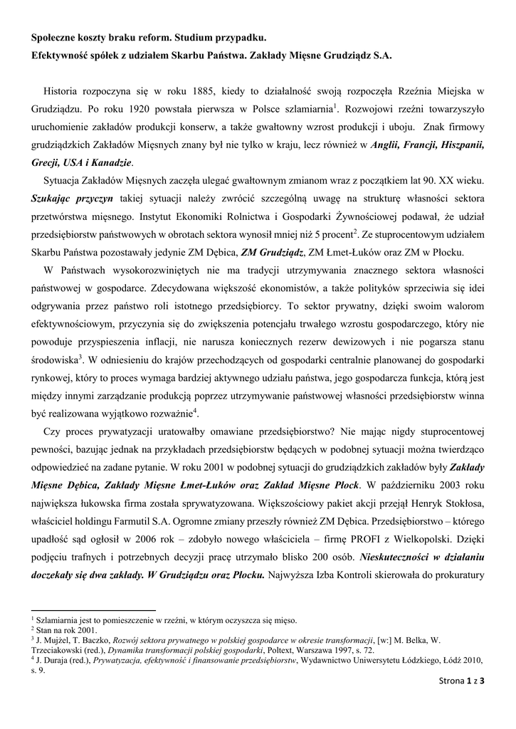 Społeczne koszty braku reform. Studium przypadku. Efektywność spółek z udziałem Skarbu Państwa. Zakłady Mięsne Grudziądz S.A. Historia rozpoczyna się w roku 1885, kiedy to działalność swoją rozpoczęła Rzeźnia Miejska w Grudziądzu. Po roku 1920 powstała pierwsza w Polsce szlamiarnia1. Rozwojowi rzeźni towarzyszyło uruchomienie zakładów produkcji konserw, a także gwałtowny wzrost produkcji i uboju. Znak firmowy grudziądzkich Zakładów Mięsnych znany był nie tylko w kraju, lecz również w Anglii, Francji, Hiszpanii, Grecji, USA i Kanadzie. Sytuacja Zakładów Mięsnych zaczęła ulegać gwałtownym zmianom wraz z początkiem lat 90. XX wieku. Szukając przyczyn takiej sytuacji należy zwrócić szczególną uwagę na strukturę własności sektora przetwórstwa mięsnego. Instytut Ekonomiki Rolnictwa i Gospodarki Żywnościowej podawał, że udział przedsiębiorstw państwowych w obrotach sektora wynosił mniej niż 5 procent2. Ze stuprocentowym udziałem Skarbu Państwa pozostawały jedynie ZM Dębica, ZM Grudziądz, ZM Łmet-Łuków oraz ZM w Płocku. W Państwach wysokorozwiniętych nie ma tradycji utrzymywania znacznego sektora własności państwowej w gospodarce. Zdecydowana większość ekonomistów, a także polityków sprzeciwia się idei odgrywania przez państwo roli istotnego przedsiębiorcy. To sektor prywatny, dzięki swoim walorom efektywnościowym, przyczynia się do zwiększenia potencjału trwałego wzrostu gospodarczego, który nie powoduje przyspieszenia inflacji, nie narusza koniecznych rezerw dewizowych i nie pogarsza stanu środowiska3. W odniesieniu do krajów przechodzących od gospodarki centralnie planowanej do gospodarki rynkowej, który to proces wymaga bardziej aktywnego udziału państwa, jego gospodarcza funkcja, którą jest między innymi zarządzanie produkcją poprzez utrzymywanie państwowej własności przedsiębiorstw winna być realizowana wyjątkowo rozważnie4. Czy proces prywatyzacji uratowałby omawiane przedsiębiorstwo? Nie mając nigdy stuprocentowej pewności, bazując jednak na przykładach przedsiębiorstw będących w podobnej sytuacji można twierdząco odpowiedzieć na zadane pytanie. W roku 2001 w podobnej sytuacji do grudziądzkich zakładów były Zakłady Mięsne Dębica, Zakłady Mięsne Łmet-Łuków oraz Zakład Mięsne Płock. W październiku 2003 roku największa łukowska firma została sprywatyzowana. Większościowy pakiet akcji przejął Henryk Stokłosa, właściciel holdingu Farmutil S.A. Ogromne zmiany przeszły również ZM Dębica. Przedsiębiorstwo – którego upadłość sąd ogłosił w 2006 rok – zdobyło nowego właściciela – firmę PROFI z Wielkopolski. Dzięki podjęciu trafnych i potrzebnych decyzji pracę utrzymało blisko 200 osób. Nieskuteczności w działaniu doczekały się dwa zakłady. W Grudziądzu oraz Płocku. Najwyższa Izba Kontroli skierowała do prokuratury Szlamiarnia jest to pomieszczenie w rzeźni, w którym oczyszcza się mięso. Stan na rok 2001. 3 J. Mujżel, T. Baczko, Rozwój sektora prywatnego w polskiej gospodarce w okresie transformacji, [w:] M. Belka, W. Trzeciakowski (red.), Dynamika transformacji polskiej gospodarki, Poltext, Warszawa 1997, s. 72. 4 J. Duraja (red.), Prywatyzacja, efektywność i finansowanie przedsiębiorstw, Wydawnictwo Uniwersytetu Łódzkiego, Łódź 2010, s. 9. 1 2 Strona 1 z 3 zawiadomienie o podejrzeniu popełnienia przestępstwa przez kolejnych pięciu ministrów Skarbu Państwa, którzy kierowali resortem od marca 2004 do listopada 2007 roku. Dwie nieudane próby prywatyzacji zakończyły się upadłością zakładów. Rys. 1. Restrukturyzacja i prywatyzacja w sektorze mięsnym od 2001 roku Firmy w 100% kontrolowane przez Skarb Państwa w 2001 roku ZM Dębica ZM Grudziądz Firmy, które przetrwały m.in. dzięki procesom restrukturyzacji oraz prywatyzacji ZM Dębica ZM Łmet-Łuków ZM Łmet-Łuków Jedyne zakłady, które upadły (wciąż kontrolowane w 100% przez Skarb Państwa) ZM Grudziądz 2007 r. ZM w Płocku 2009 r. ZM w Płocku Źródło: Opracowanie własne Nieskuteczna próba prywatyzacji Zakładów Mięsnych Grudziądz S.A. zapoczątkowała kryzys, który w konsekwencji doprowadził do upadłości przedsiębiorstwa w roku 2007. Podstawowym pytaniem pozostaje jednak co spowodowało, że podjęta próba prywatyzacji zakończyła się niepowodzeniem. W głównej mierze były to następujące czynniki: - niska rentowność branży - zbyt długi okres odzyskiwania zainwestowanego kapitału; - wysokie zapotrzebowanie na kapitał, które wiąże się między innymi z koniecznością dostosowania działalności do norm UE; - wysoki poziom zatrudnienia, który utrudnia wprowadzenie polityki ograniczającej liczbę pracowników, a tym samym generuje wysokie koszty5; - konieczność poprzedzania procesów prywatyzacji długotrwałymi i bardzo kosztownymi działaniami restrukturyzacyjnymi, na które Minister Skarbu Państwa nie posiadał środków. Powyższe czynniki to tylko nieliczne przykłady, które mogły doprowadzić do nieudanej próby prywatyzacji. W połączeniu jednak z niewłaściwą polityką całego państwa (niedostosowanie ścieżki przekształceń) doprowadziły do upadku jednego z najstarszych i najlepiej funkcjonujących zakładów w Polsce. Zaprezentowany przykład przedsiębiorstwa ma dla autorki niniejszego artykułu szczególne znaczenie ze względu na to, iż dotyczy to jej rodzinnej miejscowości, która swego czasu słynęła z najlepszych w Polsce J. Tomidajewicz (red.), Prywatyzacja w Polsce a kształtowanie europejskiego ładu społecznego, Wydawnictwo Poznańskiego Towarzystwa Przyjaciół Nauk, Poznań 2009, s. 89. 5 Strona 2 z 3 wędlin. Do dzisiaj przejeżdżając przez miasto, zarówno mieszkańców, jak i turystów straszą pozostałości Zakładów Mięsnych. Zastanawiający może okazać się fakt, iż Zakłady Mięsne Grudziądz S.A., które przetrwały zarówno I, jak i II Wojnę Św