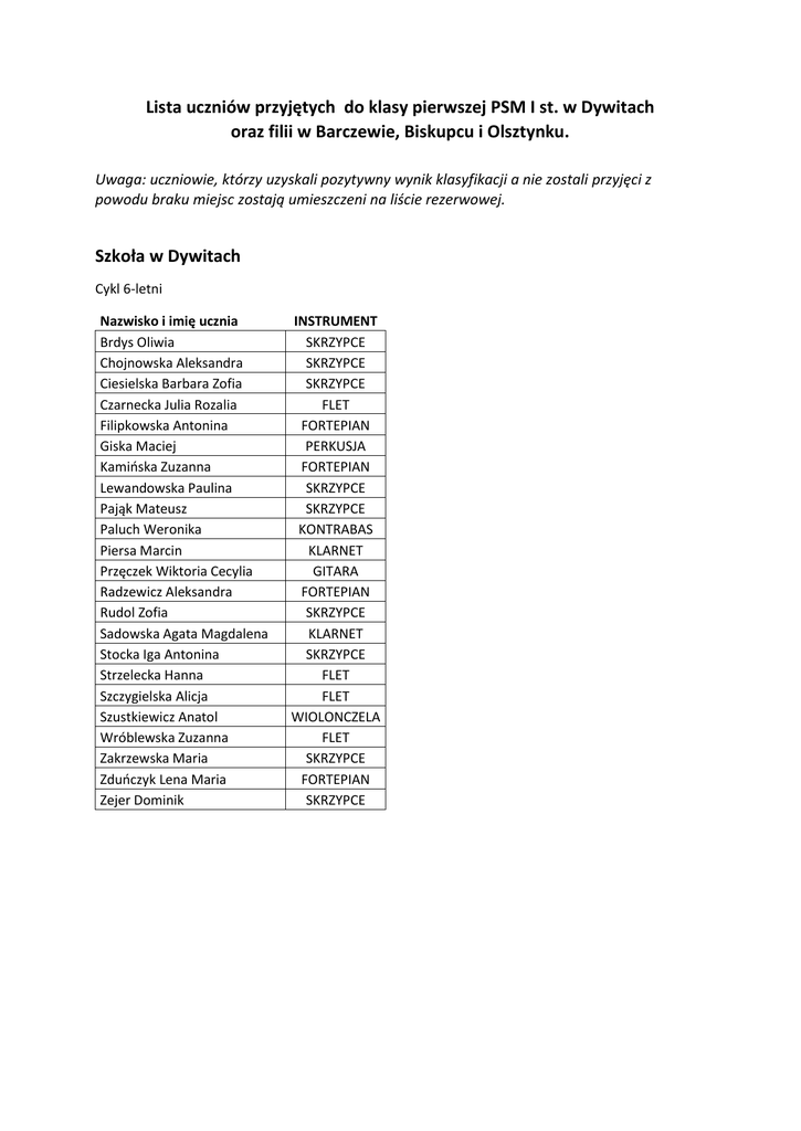 Lista uczniów przyjętych do klasy pierwszej PSM I st. w Dywitach oraz filii w Barczewie, Biskupcu i Olsztynku. Uwaga: uczniowie, którzy uzyskali pozytywny wynik klasyfikacji a nie zostali przyjęci z powodu braku miejsc zostają umieszczeni na liście rezerwowej. Szkoła w Dywitach Cykl 6-letni Nazwisko i imię ucznia Brdys Oliwia Chojnowska Aleksandra Ciesielska Barbara Zofia Czarnecka Julia Rozalia Filipkowska Antonina Giska Maciej Kamińska Zuzanna Lewandowska Paulina Pająk Mateusz Paluch Weronika Piersa Marcin Przęczek Wiktoria Cecylia Radzewicz Aleksandra Rudol Zofia Sadowska Agata Magdalena Stocka Iga Antonina Strzelecka Hanna Szczygielska Alicja Szustkiewicz Anatol Wróblewska Zuzanna Zakrzewska Maria Zduńczyk Lena Maria Zejer Dominik INSTRUMENT SKRZYPCE SKRZYPCE SKRZYPCE FLET FORTEPIAN PERKUSJA FORTEPIAN SKRZYPCE SKRZYPCE KONTRABAS KLARNET GITARA FORTEPIAN SKRZYPCE KLARNET SKRZYPCE FLET FLET WIOLONCZELA FLET SKRZYPCE FORTEPIAN SKRZYPCE PSM Dywity Cykl 4-letni Nazwisko i imię ucznia Brdys Julia Burniewicz Nikola Ewelina Chojnowski Wiktor Czubkowski Michał Danilewicz Zygmunt Józef Filipkowska Maria Jaworowski Kacper Niemczynowicz Julia Orzoł Agnieszka Orzoł Tobiasz Pałka Natalia Pazdyga Marta Natasza Pieczkowska Victoria Purta Marta Reddig Milena Słomka Krzysztof Stankiewicz Zuzanna Strzelecka Antonina Szczerba Krystian Wermter Klaudia Zimecka Natalia Żakiewicz Laura Żelazowski Maciej Żurkowska Malwina Instrument SKRZYPCE WIOLONCZELA KLARNET SKRZYPCE WIOLONCZELA FORTEPIAN KONTRABAS FORTEPIAN FORTEPIAN KONTRABAS OBOJ SKRZYPCE WIOLONCZELA WIOLONCZELA KLARNET AKORDEON FLET FLET AKORDEON PERKUSJA KLARNET SAKSOFON FORTEPIAN WIOLONCZELA Wyniki rekrutacji do PSM I st. w Dywitach filii w Barczewie Cykl 4-letni Nazwisko i imię ucznia Magdalena Ziółkowska Małgorzata Wolanin Natalia Brejta Nikola Wolińska Oskar Wolanin Wiktoria Lamshoft Instrument gitara wiolonczela gitara obój kontrabas flet Cykl 6-letni Nazwisko i imię ucznia Zofia Moszczyńska Nikola Kowalewska Miłosz Grzywiński Zofia Buchholz Maria Teresa Chałupa Maria Obrębska Emilia Żbikowska Piotr Pazera Natalia Żbikowska Amelia Kulesza Julia Grygas Klaudia Wojciechowska Instrument skrzypce fortepian fortepian skrzypce fortepian fortepian gitara fortepian gitara skrzypce gitara akordeon Wyniki rekrutacji do PSM I st. w Dywitach, filii w Biskupcu Cykl 4-letni Nazwisko i imię ucznia Instrument Balcewicz Weronika gitara Bielska Wiktoria Cezary Próchiński Kałędek Jakub Król Maria Łosiak Michał gitara akordeon klarnet gitara akordeon Stangricka Natalia gitara akordeon Ziemiański Mateusz Cykl 6-letni Nazwisko i imię ucznia Instrument Balcewicz Anna Bazis-Markuszewski Mikołaj Cmiel Maciej Dziobak Wiktoria fortepian Fedorska Dominika flet Gąsiewska Amelia skrzypce Kotwasińska Julia Kotwasiński Jakub Łach Franciszek Michniowska Agata Próchińska Maja Szczypiński Kajetan klarnet akordeon akordeon wiolonczela klarnet fortepian fortepian fortepian gitara Wyniki rekrutacji do PSM I st. w Dywitach, filii w Olsztynku Cykl 4-letni Nazwisko i imię ucznia Bak Hanna Borodziuk Maja Brodzińska Joanna Fordon Agnieszka Grzeszczak Maksymilian Jastrzębowski Kacper Kołakowska Eulalia Lewandowska Katarzyna Zdunek Adrianna Zdunowska Wiktoria Instrument waltornia/trąbka akordeon gitara klarnet waltornia/trąbka gitara fortepian skrzypce klarnet flet Cykl 6-cio letni Nazwisko i imię ucznia Borowska Antonina Cisak Artur Dąbrowska Karolina Dwojak Bartosz Jankowska Julia Liliana Karoń Matylda Kołakowski Brunon Kruszewska Amelia Łojewska Lena Michalski Zdzisław Michalski Bartłomiej Miller Dominika Okręglicki Tymoteusz Puczek Mateusz Sawicka Zofia Eliza Sobierajski Bartosz Aleksander Walter Amelia Wasiołkowska Anna Rozalia Wróblewski Mateusz Instrument wiolonczela akordeon gitara skrzypce skrzypce akordeon fortepian fortepian klarnet perkusja akordeon perkusja gitara fortepian gitara akordeon fortepian flet gitara Uczniowie przyjęci do klasy drugiej C-6: Mylewska Jesionowska Aleksandrina Marta skrzypce fortepian