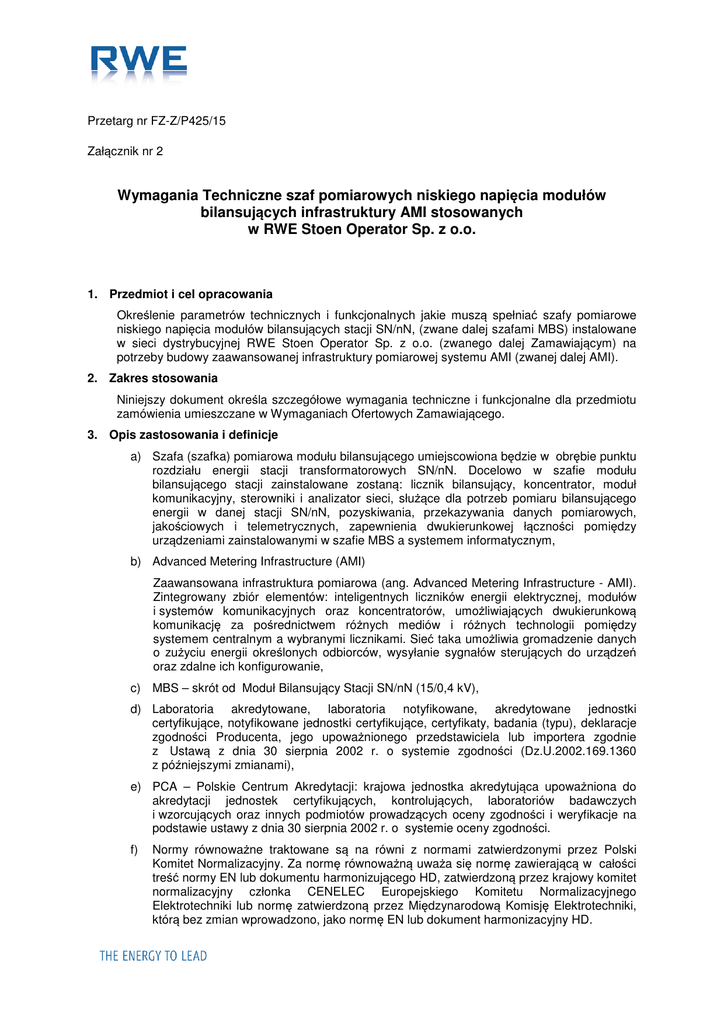 Przetarg nr FZ-Z/P425/15 Załącznik nr 2 Wymagania Techniczne szaf pomiarowych niskiego napięcia modułów bilansujących infrastruktury AMI stosowanych w RWE Stoen Operator Sp. z o.o. 1. Przedmiot i cel opracowania Określenie parametrów technicznych i funkcjonalnych jakie muszą spełniać szafy pomiarowe niskiego napięcia modułów bilansujących stacji SN/nN, (zwane dalej szafami MBS) instalowane w sieci dystrybucyjnej RWE Stoen Operator Sp. z o.o. (zwanego dalej Zamawiającym) na potrzeby budowy zaawansowanej infrastruktury pomiarowej systemu AMI (zwanej dalej AMI). 2. Zakres stosowania Niniejszy dokument określa szczegółowe wymagania techniczne i funkcjonalne dla przedmiotu zamówienia umieszczane w Wymaganiach Ofertowych Zamawiającego. 3. Opis zastosowania i definicje a) Szafa (szafka) pomiarowa modułu bilansującego umiejscowiona będzie w obrębie punktu rozdziału energii stacji transformatorowych SN/nN. Docelowo w szafie modułu bilansującego stacji zainstalowane zostaną: licznik bilansujący, koncentrator, moduł komunikacyjny, sterowniki i analizator sieci, służące dla potrzeb pomiaru bilansującego energii w danej stacji SN/nN, pozyskiwania, przekazywania danych pomiarowych, jakościowych i telemetrycznych, zapewnienia dwukierunkowej łączności pomiędzy urządzeniami zainstalowanymi w szafie MBS a systemem informatycznym, b) Advanced Metering Infrastructure (AMI) Zaawansowana infrastruktura pomiarowa (ang. Advanced Metering Infrastructure - AMI). Zintegrowany zbiór elementów: inteligentnych liczników energii elektrycznej, modułów i systemów komunikacyjnych oraz koncentratorów, umożliwiających dwukierunkową komunikację za pośrednictwem różnych mediów i różnych technologii pomiędzy systemem centralnym a wybranymi licznikami. Sieć taka umożliwia gromadzenie danych o zużyciu energii określonych odbiorców, wysyłanie sygnałów sterujących do urządzeń oraz zdalne ich konfigurowanie, c) MBS – skrót od Moduł Bilansujący Stacji SN/nN (15/0,4 kV), d) Laboratoria akredytowane, laboratoria notyfikowane, akredytowane jednostki certyfikujące, notyfikowane jednostki certyfikujące, certyfikaty, badania (typu), deklaracje zgodności Producenta, jego upoważnionego przedstawiciela lub importera zgodnie z Ustawą z dnia 30 sierpnia 2002 r. o systemie zgodności (Dz.U.2002.169.1360 z późniejszymi zmianami), e) PCA – Polskie Centrum Akredytacji: krajowa jednostka akredytująca upoważniona do akredytacji jednostek certyfikujących, kontrolujących, laboratoriów badawczych i wzorcujących oraz innych podmiotów prowadzących oceny zgodności i weryfikacje na podstawie ustawy z dnia 30 sierpnia 2002 r. o systemie oceny zgodności. f) Normy równoważne traktowane są na równi z normami zatwierdzonymi przez Polski Komitet Normalizacyjny. Za normę równoważną uważa się normę zawierającą w całości treść normy EN lub dokumentu harmonizującego HD, zatwierdzoną przez krajowy komitet normalizacyjny członka CENELEC Europejskiego Komitetu Normalizacyjnego Elektrotechniki lub normę zatwierdzoną przez Międzynarodową Komisję Elektrotechniki, którą bez zmian wprowadzono, jako normę EN lub dokument harmonizacyjny HD. 4. Słownik pojęć Pojęcie MUSI, WYMAGANE, NALEŻY, NIE MOŻE, Opis Ilekroć w dokumencie występuje wyraz MUSI, WYMAGANE, NALEŻY lub NIE MOŻE, ZABRONIONE, lub odpowiadające im formy oznacza to, że istnieje obowiązek bezwzględnego zastosowania się do treści zapisu w oferowanym rozwiązaniu. ZABRONIONE POWINNO, ZALECANE, NIE POWINNO, NIEZALECANE OPCJONALNIE, MOŻE Ilekroć w dokumencie występuje wyrażenie POWINNO, ZALECANE lub NIE POWINNO, NIEZALECANE, lub odpowiadające im formy oznacza to, że dopuszczalne jest niezastosowanie się do treści zapisu, ale wtedy i tylko wtedy, gdy na podstawie uprzednio wykonanej analizy dla określonego przypadku wykazano, że zastosowanie się do treści zapisu jest niemożliwe, lub inne obiektywnie uzasadnione czynniki sprawiają, że zastosowanie się jest zbędne albo nieefektywne. Ilekroć w dokumencie występuje wyrażenie OPCJONALNIE lub MOŻE lub odpowiadające im formy oznacza to, że dopuszczalne jest niezastosowanie się do treści zapisu. Konieczne jest podanie przyczyny niezastosowania i sposobu alternatywnego rozwiązania kwestii opisywanych w akapicie. 5. Regulacje i normy 5.1 Regulacje zewnętrzne 5.1.1 Ustawa z dnia 30 sierpnia 2002 r. o systemie oceny zgodności (Dz.U.2002.169.1360 z późniejszymi zmianami). 5.1.2 Ustawa z dnia 12 września 2002 r. o normalizacji (Dz.U.2002.169.1386 z późniejszymi zmianami). 5.1.3 Ustawa z dnia 13 (Dz.U.2007.82.556) 5.1.4 Rozporządzenie Ministra Gospodarki z dnia 21 sierpnia 2007 r. w sprawie zasadniczych wymagań dla sprzętu elektrycznego (Dz.U.2007.155.1089). 5.1.5 Rozporządzenie Ministra Gospodarki z 1 kwietnia 2009 r. zmieniające rozporządzenie w sprawie szczegółowych wymagań dotyczących ograniczeń wykorzystywaniu w sprzęcie elektrycznym i elektronicznym niektórych substancji mogących negatywnie oddziaływać na środowisko (Dz.U.2009.63.525). 5.1.6 Dyrektywa 2006/95/WE Parlamentu Europejskiego i Rady z dnia 12 grudnia 2006 r. w sprawie harmonizacji ustawodawstwa Państw Członkowskich odnoszących się do sprzętu elektrycznego przewidzianego do stosowania w określonych granicach napięcia (Dz.U. UE L 2006.374.10). 5.1.7 Dyrektywa 2004/108/WE Parlamentu Europejskiego i Rady z dnia 15 grudnia 2004 r. w sprawie zbliżenia ustawodawstwa Państw Członkowskich odnoszących się do kompatybilności elektromagnetycznej oraz uchylająca dyrektywę 89/336/EWG (Dz.U. UE L 2004.390.24). 5.1.8 Dyrektywa 2002/95/WE Parlamentu Europejskiego i Rady z dnia 27 stycznia 2003 r. w sprawie ograniczenia stosowania niektórych niebezpiecznych substancji w sprzęcie elektrycznym i elektronicznym (Dz.U. UE L 2003.37.19), jak również Dyrektywa 2008/35/WE Parlamentu Europejskiego i Rady z dnia 11 marca 2008 r. zmieniająca 