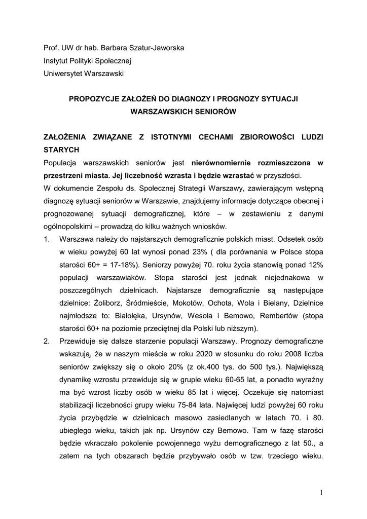 Prof. UW dr hab. Barbara Szatur-Jaworska Instytut Polityki Społecznej Uniwersytet Warszawski PROPOZYCJE ZAŁOśEŃ DO DIAGNOZY I PROGNOZY SYTUACJI WARSZAWSKICH SENIORÓW ZAŁOśENIA ZWIĄZANE Z ISTOTNYMI CECHAMI ZBIOROWOŚCI LUDZI STARYCH Populacja warszawskich seniorów jest nierównomiernie rozmieszczona w przestrzeni miasta. Jej liczebność wzrasta i będzie wzrastać w przyszłości. W dokumencie Zespołu ds. Społecznej Strategii Warszawy, zawierającym wstępną diagnozę sytuacji seniorów w Warszawie, znajdujemy informacje dotyczące obecnej i prognozowanej sytuacji demograficznej, które – w zestawieniu z danymi ogólnopolskimi – prowadzą do kilku waŜnych wniosków. 1. Warszawa naleŜy do najstarszych demograficznie polskich miast. Odsetek osób w wieku powyŜej 60 lat wynosi ponad 23% ( dla porównania w Polsce stopa starości 60+ = 17-18%). Seniorzy powyŜej 70. roku Ŝycia stanowią ponad 12% populacji warszawiaków. poszczególnych Stopa dzielnicach. starości Najstarsze jest jednak demograficznie niejednakowa są w następujące dzielnice: śoliborz, Śródmieście, Mokotów, Ochota, Wola i Bielany, Dzielnice najmłodsze to: Białołęka, Ursynów, Wesoła i Bemowo, Rembertów (stopa starości 60+ na poziomie przeciętnej dla Polski lub niŜszym). 2. Przewiduje się dalsze starzenie populacji Warszawy. Prognozy demograficzne wskazują, Ŝe w naszym mieście w roku 2020 w stosunku do roku 2008 liczba seniorów zwiększy się o około 20% (z ok.400 tys. do 500 tys.). Największą dynamikę wzrostu przewiduje się w grupie wieku 60-65 lat, a ponadto wyraźny ma być wzrost liczby osób w wieku 85 lat i więcej. Oczekuje się natomiast stabilizacji liczebności grupy wieku 75-84 lata. Najwięcej ludzi powyŜej 60 roku Ŝycia przybędzie w dzielnicach masowo zasiedlanych w latach 70. i 80. ubiegłego wieku, takich jak np. Ursynów czy Bemowo. Tam w fazę starości będzie wkraczało pokolenie powojennego wyŜu demograficznego z lat 50., a zatem na tych obszarach będzie przybywało osób w tzw. trzeciego wieku. 1 Jednocześnie będzie miał wzrost liczby osób sędziwych – w tzw. czwartym wieku. 3. Prognozuje się, Ŝe nadal będą starzeć się centralne dzielnice Warszawy, choć tempo tego procesu moŜe ulec zmniejszeniu. Z jednej strony w centrum miasta jest relatywnie niewiele niezagospodarowanych terenów budowlanych i nowych inwestycji mieszkaniowych, co ogranicza napływ osób w wieku produkcyjnym. Z drugiej jednak strony liczebność młodszych generacji na tych terenach moŜe wzrastać w związku z przejmowaniem mieszkań dotychczas zamieszkiwanych przez osoby starsze. Osoby starsze – takŜe starsi mieszkańcy Warszawy – to populacja silnie zróŜnicowana pod względem: A. wieku, B. płci, C. poziomu wykształcenia, D. stanu zdrowia, E. stanu cywilnego, F. sytuacji mieszkaniowej, G. poziomu dochodów. Ad. A. W fazie starości demografowie wyróŜniają – zaleŜnie od autora - od 2 do 4 subfaz. Wówczas, gdy wzrasta nie tylko odsetek ludzi w wieku 60 lat i więcej (jako granicę starości przyjmuje się takŜe inny wiek, np. 65 lat), ale takŜe odsetek osób będących w fazie późnej starości (np. moŜna przyjąć tu granicę wieku 75 lat) – to mówi się o podwójnym starzeniu demograficznym. Obserwacja tego procesu jest bardzo istotna z punktu widzenia polityki społecznej, gdyŜ zasadniczo inne są potrzeby tzw. młodych starych (trzeciego wieku), a inne osób w wieku sędziwym (czwartego wieku). W 2006 roku w Polsce przeciętne dalsze trwanie Ŝycia dla kobiet w wieku 60 lat wynosiło 22,84,a wieku 75 lat – 11,31, zaś w przypadku męŜczyzn odpowiednio _ 17,65 lat i 9,09 lat. W miastach województwa mazowieckiego kobieta 60-letnia miała przed sobą przeciętnie 23,32 lat Ŝycia, zaś męŜczyzna 60-letni – 18,59 lat.1 1 www.stat.gov.pl 2 Ad.B. W populacji ludzi starszych obserwujemy przewagę liczebną kobiet nad męŜczyznami. Im starsza grupa wieku, tym więcej kobiet a mniej męŜczyzn. Kobiety Ŝyją dłuŜej, ale są samotne i bardziej schorowane. Jednocześnie – w porównaniu ze starszymi męŜczyznami – wykazują większą zaradność w sprawach Ŝycia codziennego, lepiej gospodarują niewielkimi dochodami. Starsze kobiety w naszym kraju są gorzej wykształcone niŜ męŜczyźni, nie jest to jednak niezmienna cecha populacji w starszym wieku. Z czasem, gdy próg starości zaczną przekraczać przedstawiciele innych, lepiej wykształconych pokoleń ta róŜnica między kobietami i męŜczyznami będzie zmniejszała się, a moŜe nawet zmienić kierunek – lepiej wykształcone będą kobiety. Kobiety będące we wcześniejszej fazie starości są najczęściej opiekunkami sędziwych rodziców – głównie matek i teściowych. W analizach sytuacji seniorów naleŜy zatem uwzględniać współczynnik feminizacji tej populacji oraz tzw. potencjał opiekuńczy rodzin ludzi starych. Mierzy się go w demografii na kilka sposobów: • współczynnik wsparcia (ang. – support ratio) – określający proporcje między liczbą osób w średnim wieku a liczbą osób starszych, które ewentualnie potrzebują pomocy ze strony młodszych; np. w publikacjach ONZ (np. „World Population Ageing 1950-2050”) obliczane są dwie miary tego typu: współczynnik potencjalnego wsparcia (ang. – potential support ratio) – liczba osób w wieku 15-64 lata w relacji do liczby osób w wieku 65 lat i więcej, oraz współczynnik wsparcia rodziców (ang. – parent support ratio) – liczba osób w wieku 85 lat i więcej przypadająca na 100 osób w wieku 50-64 lata. • współczynnik potencjału pielęgnacyjnego – w polskim raporcie UNDP o rozwoju społecznym z 1999 r. („Ku godnej aktywnej starości”, s. 70) obliczany jest jako stosunek liczby kobiet w wieku 45-69 lat do liczby osób w wieku 70 lat i więcej. Ad. C. Populacja ludzi starych jest zróŜnicowana pod względem poziomu wykształcenia. Ta cecha ma istotny dodatni związek z aktywno