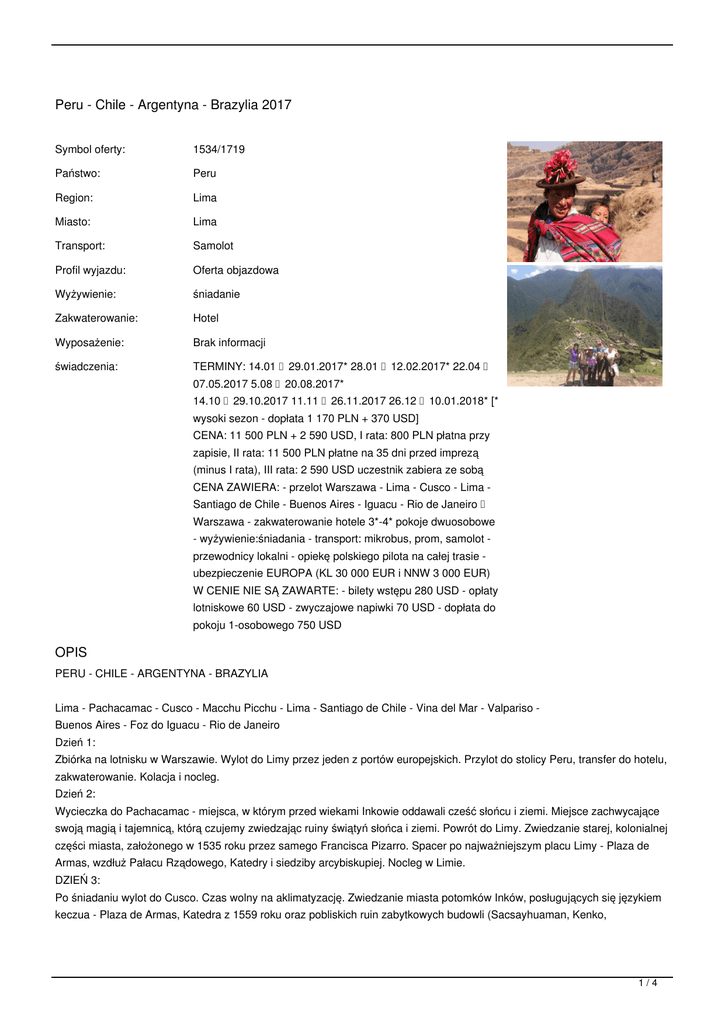 Peru - Chile - Argentyna - Brazylia 2017 Symbol oferty: 1534/1719 Państwo: Peru Region: Lima Miasto: Lima Transport: Samolot Profil wyjazdu: Oferta objazdowa Wyżywienie: śniadanie Zakwaterowanie: Hotel Wyposażenie: Brak informacji świadczenia: TERMINY: 14.01 29.01.2017* 28.01 12.02.2017* 22.04 07.05.2017 5.08 20.08.2017* 14.10 29.10.2017 11.11 26.11.2017 26.12 10.01.2018* [* wysoki sezon - dopłata 1 170 PLN + 370 USD] CENA: 11 500 PLN + 2 590 USD, I rata: 800 PLN płatna przy zapisie, II rata: 11 500 PLN płatne na 35 dni przed imprezą (minus I rata), III rata: 2 590 USD uczestnik zabiera ze sobą CENA ZAWIERA: - przelot Warszawa - Lima - Cusco - Lima Santiago de Chile - Buenos Aires - Iguacu - Rio de Janeiro Warszawa - zakwaterowanie hotele 3*-4* pokoje dwuosobowe - wyżywienie:śniadania - transport: mikrobus, prom, samolot przewodnicy lokalni - opiekę polskiego pilota na całej trasie - ubezpieczenie EUROPA (KL 30 000 EUR i NNW 3 000 EUR) W CENIE NIE SĄ ZAWARTE: - bilety wstępu 280 USD - opłaty lotniskowe 60 USD - zwyczajowe napiwki 70 USD - dopłata do pokoju 1-osobowego 750 USD OPIS PERU - CHILE - ARGENTYNA - BRAZYLIA Lima - Pachacamac - Cusco - Macchu Picchu - Lima - Santiago de Chile - Vina del Mar - Valpariso Buenos Aires - Foz do Iguacu - Rio de Janeiro Dzień 1: Zbiórka na lotnisku w Warszawie. Wylot do Limy przez jeden z portów europejskich. Przylot do stolicy Peru, transfer do hotelu, zakwaterowanie. Kolacja i nocleg. Dzień 2: Wycieczka do Pachacamac - miejsca, w którym przed wiekami Inkowie oddawali cześć słońcu i ziemi. Miejsce zachwycające swoją magią i tajemnicą, którą czujemy zwiedzając ruiny świątyń słońca i ziemi. Powrót do Limy. Zwiedzanie starej, kolonialnej części miasta, założonego w 1535 roku przez samego Francisca Pizarro. Spacer po najważniejszym placu Limy - Plaza de Armas, wzdłuż Pałacu Rządowego, Katedry i siedziby arcybiskupiej. Nocleg w Limie. DZIEŃ 3: Po śniadaniu wylot do Cusco. Czas wolny na aklimatyzację. Zwiedzanie miasta potomków Inków, posługujących się językiem keczua - Plaza de Armas, Katedra z 1559 roku oraz pobliskich ruin zabytkowych budowli (Sacsayhuaman, Kenko, 1/4 Puca-Pucara, Tambomachay). Nocleg w Cusco. DZIEŃ 4: Wycieczka do wymarzonego i najsłynniejszego na kontynencie zaginionego miasta - Machu Picchu. Twierdza została odkryta dopiero w 1911 roku przez amerykańskiego historyka. To niesamowite dzieło rąk ludzkich zadziwia doskonałością kamieniarki i bogactwem dekoracji. Sesja zdjęciowa na tle ruin Świątyni Trzech Okien, Słonecznego Obserwatorium i malowniczych tarasów. Powrót do Cusco. Nocleg. DZIEŃ 5: Wycieczka do Świętej Doliny Inków. Po drodze do Pisac widoki na malownicze terasy, dojazd do Pisac, spacer na indiańskim rynku przepełnionym kramami ze swetrami, tkaninami i pamiątkami. Oglądanie ruin twierdzy Ollantaytambo. Powrót do Cusco na nocleg. DZIEŃ 6: Po śniadaniu przejazd na lotnisko. Wylot do Limy, przylot. Wycieczka do Muzeum Larco Herrera, którego budynek pochodzi z czasów kolonialnych i jest otoczony pięknymi ogrodami. W muzeum znajdziemy bogatą kolekcję wyrobów ze złota, ceramikę oraz przepiękne materiały z czasów preinkaskich. Późnym popołudniem transfer na lotnisko. Wylot do Santiago de Chile. Przylot. Transfer do hotelu. Nocleg. DZIEŃ 7: Po śniadaniu zwiedzanie Santiago de Chile - wzgórze San Cristobal - stąd rozpościera się wspaniały widok na miasto i okolicę, znanego z ataku lotniczego na prezydenta Salvadore Allende Palacio de la Moneda, dzielnica rządowa, katedra. Nocleg. DZIEŃ 8: Przejazd do Vina del Mar największego kurortu w Chile. Zwiedzanie kurortu, okolicznych plaż, portowego miasta Valparaiso. Wjazd starą, niemiłosiernie skrzypiącą kolejką zębatą na punkt widokowy. Powrót do Santiago na nocleg. DZIEŃ 9: Po śniadaniu transfer na lotnisko. Przelot do Buenos Aires. Po przylocie zwiedzanie boskiego Buenos Aires - Plaza de Mayo, katedra, barwna dzielnica La Boca, w której narodziło się tango, cmentarz Recoleta, gdzie znajduje się między innymi grób charyzmatycznej Evity. Wieczorem - fakultatywnie - możliwość podziwiania gibkich ciał tancerek i przystojnych tancerzy oraz pójścia w tango przy upojnej muzyce (ok. 80 USD). Nocleg w Buenos Aires. DZIEŃ 10: Po śniadaniu czas wolny na spacery i samodzielne podglądanie uroków Buenos Aires. Kontemplacja urody miasta i jego mieszkańców przy kawiarnianym stoliku. Zakupy, przechadzki lub fakultatywnie wycieczka promem do Colonii w Urugwaju niezwykle urokliwego miasteczka o kolonialnej architekturze (wpisana na listę dziedzictwa UNESCO), zwiedzanie kościoła, przechadzki brukowanymi uliczkami, czas na wypicie kufla dobrze schłodzonego piwa i chłonięcie zaczarowanej atmosfery miasteczka, lub wycieczka do delty Parany (meandry rzeki Parana w zbliżeniu). Nocleg w Buenos Aires. DZIEŃ 11: Po śniadaniu przejazd na lotnisko. Przelot z Buenos Aires do Iguacu. Przylot. Podziwianie argentyńskiej strony wodospadów, w tym największego z nich - Garganta del Diablo, spacer po dżungli. Fakultatywnie rejs stateczkiem prawie pod samą gardziel wodospadu (70 USD). Pozostali mogą w tym czasie spróbować wypatrzyć w gęstwinie roślinności papugę, tukana lub też niezwykle sympatycznego ostronosa. Powrót na stronę brazylijską, przejazd do hotelu na nocleg do Iguacu. Dla chętnych fakultatywnie - możliwość skosztowania pożywnego churrasco - grillowanej wołowiny spożywanej zwykle z dużą ilością czerwonego wina i koniecznie z muzyką w tle i przyglądanie się popisom tanecznym artystów z całej Ameryki Łacińskiej (70 USD). Nocleg. DZIEŃ 12: Kolejne spotkanie z wielką i dziką przyrodą. Ciąg dalszy zachwytów nad dziełem Matki Natury - oglądanie wodospadów po stronie brazylijskiej. Fakultatywnie przelot helikopterem nad wodospadem (110 USD). Powrót do hotelu. Nocleg DZIEŃ 13: Przejazd na lotnisko. Przelot do Rio de Janeiro - miasta z