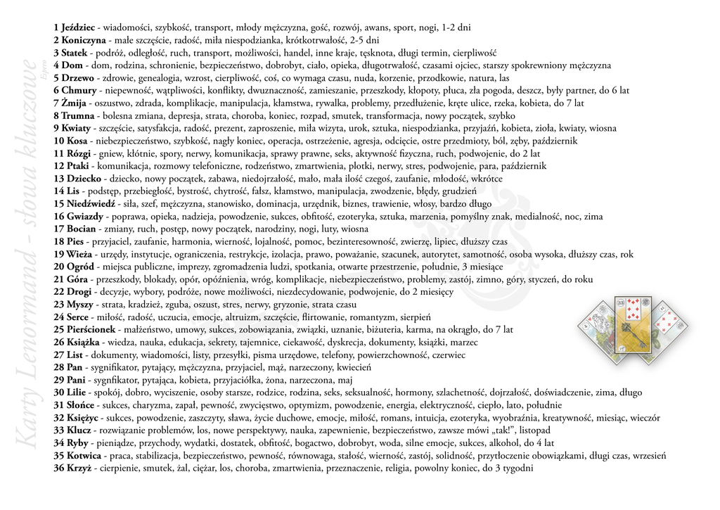 Espero Karty Lenormand - słowa kluczowe 1 Jeździec - wiadomości, szybkość, transport, młody mężczyzna, gość, rozwój, awans, sport, nogi, 1-2 dni 2 Koniczyna - małe szczęście, radość, miła niespodzianka, krótkotrwałość, 2-5 dni 3 Statek - podróż, odległość, ruch, transport, możliwości, handel, inne kraje, tęsknota, długi termin, cierpliwość 4 Dom - dom, rodzina, schronienie, bezpieczeństwo, dobrobyt, ciało, opieka, długotrwałość, czasami ojciec, starszy spokrewniony mężczyzna 5 Drzewo - zdrowie, genealogia, wzrost, cierpliwość, coś, co wymaga czasu, nuda, korzenie, przodkowie, natura, las 6 Chmury - niepewność, wątpliwości, konflikty, dwuznaczność, zamieszanie, przeszkody, kłopoty, płuca, zła pogoda, deszcz, były partner, do 6 lat 7 Żmija - oszustwo, zdrada, komplikacje, manipulacja, kłamstwa, rywalka, problemy, przedłużenie, kręte ulice, rzeka, kobieta, do 7 lat 8 Trumna - bolesna zmiana, depresja, strata, choroba, koniec, rozpad, smutek, transformacja, nowy początek, szybko 9 Kwiaty - szczęście, satysfakcja, radość, prezent, zaproszenie, miła wizyta, urok, sztuka, niespodzianka, przyjaźń, kobieta, zioła, kwiaty, wiosna 10 Kosa - niebezpieczeństwo, szybkość, nagły koniec, operacja, ostrzeżenie, agresja, odcięcie, ostre przedmioty, ból, zęby, październik 11 Rózgi - gniew, kłótnie, spory, nerwy, komunikacja, sprawy prawne, seks, aktywność fizyczna, ruch, podwojenie, do 2 lat 12 Ptaki - komunikacja, rozmowy telefoniczne, rodzeństwo, zmartwienia, plotki, nerwy, stres, podwojenie, para, październik 13 Dziecko - dziecko, nowy początek, zabawa, niedojrzałość, mało, mała ilość czegoś, zaufanie, młodość, wkrótce 14 Lis - podstęp, przebiegłość, bystrość, chytrość, fałsz, kłamstwo, manipulacja, zwodzenie, błędy, grudzień 15 Niedźwiedź - siła, szef, mężczyzna, stanowisko, dominacja, urzędnik, biznes, trawienie, włosy, bardzo długo 16 Gwiazdy - poprawa, opieka, nadzieja, powodzenie, sukces, obfitość, ezoteryka, sztuka, marzenia, pomyślny znak, medialność, noc, zima 17 Bocian - zmiany, ruch, postęp, nowy początek, narodziny, nogi, luty, wiosna 18 Pies - przyjaciel, zaufanie, harmonia, wierność, lojalność, pomoc, bezinteresowność, zwierzę, lipiec, dłuższy czas 19 Wieża - urzędy, instytucje, ograniczenia, restrykcje, izolacja, prawo, poważanie, szacunek, autorytet, samotność, osoba wysoka, dłuższy czas, rok 20 Ogród - miejsca publiczne, imprezy, zgromadzenia ludzi, spotkania, otwarte przestrzenie, południe, 3 miesiące 21 Góra - przeszkody, blokady, opór, opóźnienia, wróg, komplikacje, niebezpieczeństwo, problemy, zastój, zimno, góry, styczeń, do roku 22 Drogi - decyzje, wybory, podróże, nowe możliwości, niezdecydowanie, podwojenie, do 2 miesięcy 23 Myszy - strata, kradzież, zguba, oszust, stres, nerwy, gryzonie, strata czasu 24 Serce - miłość, radość, uczucia, emocje, altruizm, szczęście, flirtowanie, romantyzm, sierpień 25 Pierścionek - małżeństwo, umowy, sukces, zobowiązania, związki, uznanie, biżuteria, karma, na okrągło, do 7 lat 26 Książka - wiedza, nauka, edukacja, sekrety, tajemnice, ciekawość, dyskrecja, dokumenty, książki, marzec 27 List - dokumenty, wiadomości, listy, przesyłki, pisma urzędowe, telefony, powierzchowność, czerwiec 28 Pan - sygnifikator, pytający, mężczyzna, przyjaciel, mąż, narzeczony, kwiecień 29 Pani - sygnfikator, pytająca, kobieta, przyjaciółka, żona, narzeczona, maj 30 Lilie - spokój, dobro, wyciszenie, osoby starsze, rodzice, rodzina, seks, seksualność, hormony, szlachetność, dojrzałość, doświadczenie, zima, długo 31 Słońce - sukces, charyzma, zapał, pewność, zwycięstwo, optymizm, powodzenie, energia, elektryczność, ciepło, lato, południe 32 Księżyc - sukces, powodzenie, zaszczyty, sława, życie duchowe, emocje, miłość, romans, intuicja, ezoteryka, wyobraźnia, kreatywność, miesiąc, wieczór 33 Klucz - rozwiązanie problemów, los, nowe perspektywy, nauka, zapewnienie, bezpieczeństwo, zawsze mówi „tak!”, listopad 34 Ryby - pieniądze, przychody, wydatki, dostatek, obfitość, bogactwo, dobrobyt, woda, silne emocje, sukces, alkohol, do 4 lat 35 Kotwica - praca, stabilizacja, bezpieczeństwo, pewność, równowaga, stałość, wierność, zastój, solidność, przytłoczenie obowiązkami, długi czas, wrzesień 36 Krzyż - cierpienie, smutek, żal, ciężar, los, choroba, zmartwienia, przeznaczenie, religia, powolny koniec, do 3 tygodni
