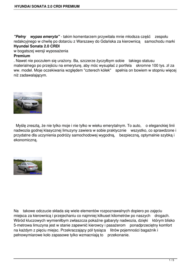 HYUNDAI SONATA 2.0 CRDI PREMIUM "Pełny wypas emeryta" - takim komentarzem przywitała mnie młodsza część zespołu redakcyjnego w chwilę po dotarciu z Warszawy do Gdańska za kierownicą samochodu marki Hyundai Sonata 2.0 CRDI w bogatszej wersji wyposażenia Premium . Nawet nie poczułem się urażony. Ba, szczerze życzyłbym sobie takiego statusu materialnego po przejściu na emeryturę, aby móc wysupłać z portfela skromne 100 tys. zł za ww. model. Moje oczekiwania względem "czterech kółek" spełnia on bowiem w stopniu więcej niż zadawalającym. Myślę zresztą, że nie tylko moje i nie tylko w wieku emerytalnym. To auto, o eleganckiej linii nadwozia godnej klasycznej limuzyny zawiera w sobie praktycznie wszystko, co sprawdzone i przydatne dla uczynienia podróży samochodowej wygodną, bezpieczną, optymalnie szybką i ekonomiczną. Na takowe odczucie składa się wiele elementów rozpoznawalnych dopiero po zajęciu miejsca za kierownicą i przejechaniu co najmniej kilkuset kilometrów po naszych drogach. Wśród kluczowych wymieniłbym zwłaszcza pokaźne gabaryty nadwozia, dzięki którym blisko 5-metrowa limuzyna jest w stanie zapewnić kierowcy i pasażerom ponadprzeciętny komfort na każdym z pięciu miejsc. Przekraczający pół tysiąca litrów pojemności bagażnik i pełnowymiarowe koło zapasowe tylko wzmacniają to przekonanie. 1/5 HYUNDAI SONATA 2.0 CRDI PREMIUM W parze z obszernym wnętrzem idzie jego staranne wyciszenie i wykończenie najlepszymi materiałami (m.in. skórzana tapicerka siedzeń) oraz ergonomiczna deska rozdzielcza z dostępem do szeregu rozwiązań poprawiających komfort jazdy - od komputera pokładowego, poprzez automatyczną klimatyzację, aż do radioodtwarzacza CD i MP3 Z luksusowym wyposażeniem Sonaty znakomicie współgra dobrze zestrojone zawieszenie oraz 140-konny turbodiesel, zapewniający pokaźnej, 2-tonowej limuzynie przyzwoitą elastyczność i dynamikę, przydatną zwłaszcza w warunkach jazdy pozamiejskiej. Ten, kogo bardziej interesuje podróż ekonomiczna ma natomiast w odwodzie sześciostopniową skrzynię biegów, pozwalającą na najwyższym przełożeniu pokonać dystans 100 km przy zużyciu zaledwie pięciu litrów oleju napędowego. Rzeczywiście, "pełny wypas emeryta" w najlepszym i pozbawionym złośliwości rozumieniu tego określenia. Tekst i zdjęcia: H. Jez. HYUNDAI SONATA 2.0 CRDI PREMIUM DANE TECHNICZNE SILNIK Pojemność - 1991 cc 2/5 HYUNDAI SONATA 2.0 CRDI PREMIUM Układ cylindrów - rzędowy Liczba cylindrów/zaworów - 4/16 Układ paliwowy - Common Rail Paliwo - olej napędowy Stopień sprężania - 17,3:1 Moc maksymalna - 103 kW/140 KM przy 4000 obr/min Maksymalny moment obrotowy - 305 Nm przy 1800 - 2500 obr/min Pojemność zbiornika paliwa - 70 l ZAWIESZENIE Przód - podwójne wahacze, stabilizator, sprężyny śrubowe, amortyzator Tylne - niezależne wahaczowi ze sprężyną spiralną, stabilizator, amortyzator UKŁAD HAMULCOWY Typ - dwuobwodowy, krzyżowy ze wspomaganiem Przód - tarczowe wentylowane Tył - tarczowe WYMIARY Długość/szerokość/wysokość - 4800/1832/1475 mm Rozstaw osi - 2730 mm Rozstaw kół przednich/tylnych - 1565/1550 mm Zwis przedni/tylny - 960/1110 mm Minimalny prześwit - 160 mm Pojemność bagażnika (VDA) - 523 l Koła i ogumienie - R16 215/60 (Dunlop) MASY Masa własna minimalna/maksymalna - 1591/1663 kg Dopuszczalna masa całkowita - 2150 kg Maksymalne obciążenie bagażnika dachowego - 100 kg Masa przyczepy z hamulcem - 1700 kg Masa przyczepy bez hamulca - 523 kg 3/5 HYUNDAI SONATA 2.0 CRDI PREMIUM OSIĄGI Prędkość maksymalna - 203 km/h Przyspieszenie od 0 do 100 km/h - 10,7 s Zużycie paliwa na 100 km miasto/poza miastem/mieszane - 8,2/5,0/6,1 l Emisja CO2 - 163 g/k WYPOSAŻENIE STANDARDOWE Poduszka powietrzna kierowcy i pasażera Poduszki powietrze boczne Kurtyny powietrzne Deaktywacja poduszki powietrznej pasażera Pasy bezpieczeństwa z napinaczami i ogranicznikami siły napięcia Zaczepy ISOFIX na tylnej kanapie Kontrolka zapięcia pasa pasażera System antypoślizgowy ABS z EBD + tylne hamulce tarczowe Elektroniczny system kontroli stabilizacji pojazdu ESP Asystent hamowania Regulowana kolumna kierownicy (wysokość i głębokość) Regulacja części lędźwiowej fotela kierowcy Ogrzewane fotele przednie Regulacja wysokość fotela kierowcy Oparcie kanapy tylnej składane i dzielone w proporcjach 60:40 Podłokietnik na tylnej kanapie Przednie lampy przeciwmgielne Czujnik cofania Przednie lampki punktowe ze schowkiem na okulary Wspomaganie układu kierowniczego Manualna skrzynia biegów 6-stopniowa Klimatyzacja automatyczna System kontroli powietrza (AQCS) Przednie i tylne szyby sterowane elektrycznie Lusterka boczne regulowane elektrycznie i ogrzewane Samościemniające lusterko wsteczne (ECM) Immobilizer Zamek centralny z pilotem Autoalarm Komputer pokładowy Ogrzewane wycieraczki szyby przedniej Skórzana kierownica i dźwignia zmiany biegów Skórzane siedzenia Wykończenie wnętrza materiałem drewnopodobnym lub imitującym metal Wykończenie kierownicy materiałem drewnopodobnym lub imitującym metal 4/5 HYUNDAI SONATA 2.0 CRDI PREMIUM Felgi aluminiowe Pełnowymiarowe koło zapasowe z felgą aluminiową Radioodtwarzacz CD MP3 z 6 głośnikami i sterowaniem przy kole kierownicy WYPOSAŻENIE OPCJONALNE (za dopłatą) Lakier metalik/mika (2.000) Nakładki progowe (205) Owiewki (210) Dywaniki welurowe (215) Nakładka drewnopodobna (300) Mata antypoślizgowa bagażnika (330) Bagażnik dachowy (600) Elektrycznie otwierane okno dachowe (3.500) Ekran DVD 7" montowany w dachu (7.950) DVD + nawigacja (8.700) CENA WERSJA STANDARDOWEJ (stan na 11 lipca 2007) 102.900 zł 5/5