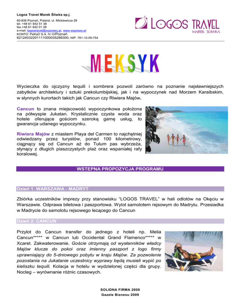 Logos Travel Marek Śliwka sp.j. 60-836 Poznań, Poland, ul. Mickiewicza 28 tel. +48 61 842 51 38 fax.+48 61 842 01 28 e-mail: [email protected], www.wyprawy.pl KONTO: PeKaO S.A. IV O/Poznań 62124032201111000035289300, NIP: 781-10-09-754 Wycieczka do ojczyzny tequili i sombrera pozwoli zarówno na poznanie najsławniejszych zabytków architektury i sztuki prekolumbijskiej, jak i na wypoczynek nad Morzem Karaibskim, w słynnych kurortach takich jak Cancun czy Riwiera Majów. Cancun to znana miejscowość wypoczynkowa położona na półwyspie Jukatan. Krystalicznie czysta woda oraz hotele oferujące gościom szeroką gamę usług, to gwarancja udanego wypoczynku. Riwiera Majów z miastem Playa del Carmen to najchętniej odwiedzany przez turystów, ponad 100 kilometrowy, ciągnący się od Cancun aż do Tulum pas wybrzeża, słynący z długich piaszczystych plaż oraz wspaniałej rafy koralowej. WSTEPNA PROPOZYCJA PROGRAMU Dzień 1. WARSZAWA - MADRYT Zbiórka uczestników imprezy przy stanowisku “LOGOS TRAVEL” w hali odlotów na Okęciu w Warszawie. Odprawa biletowa i paszportowa. Wylot samolotem rejsowym do Madrytu. Przesiadka w Madrycie do samolotu rejsowego lecącego do Cancun Dzień 2. CANCUN Przylot do Cancun transfer do jednego z hoteli np. Melia Cancun***** w Cancun lub Occidental Grand Flamenco***** w Xcaret. Zakwaterowanie. Goście otrzymają od wysłanników władcy Majów klucze do pokoi oraz imienny paszport z logo firmy uprawniający do 5-dniowego pobytu w kraju Majów. Za pozwolenie pozostania na Jukatanie uczestnicy wyprawy będą musieli wypić po kieliszku tequili. Kolacja w hotelu w wydzielonej części dla grupy. Nocleg – wyrównanie różnic czasowych. SOLIDNA FIRMA 2009 Gazele Biznesu 2009 Dzień 3. CANCUN/RIWIERA MAJÓW Godzina 08:00 – 09:00 Śniadanie w hotelu. Po śniadaniu: Godz. 09:00 – 16:00 Wyprawa statkiem na Wyspę Kobiet /Isla Mujeres/ (prosimy o zabranie: ręcznika i stroju plażowego). Przejazd do Cancun – ok. 45 minut. Obsługa statku w strojach Majów zaprosi Państwa na pokład statku, którym w ciągu godziny dotrzemy na miejsce. Na statku open bar, animacje. Wycieczka na jedną z najpiękniejszych plaż – pływanie z maską i fajką – oglądanie wraków statków, możliwość nurkowania lub przejażdżki melexem po wyspie. Lunch i napoje w barze i w restauracji na plaży. Czas wolny, powrót do hotelu. Kolacja, nocleg. LUB Całodzienne atrakcje w parku Xcaret. XCARET to położony około 72 km. na płd. od Cancun park eko - archeologiczny z dużą ilością atrakcji m.in. podziemna rzeka, zabawy z delfinami, podwodne spacery, pływanie w tzw. cenotes (oczka wodne/ podziemne jaskinie) oraz w krystalicznie czystych wodach Morza Karaibskiego, snorkeling i nurkowanie. Czeka tu Państwa wiele wrażeń. Miłośnicy słońca wypoczywać mogą na śnieżno-białym piasku korzystając z hamaków i leżaków lub spędzić czas bardziej aktywnie. W Xcaret znajdują się także: akwarium, w którym zgromadzono przepiękne fragmenty rafy koralowej oraz okazy fauny i flory morskiej znajdujące się pod ochroną żółwie pszczelarnia na terenie ogrodu botanicznego ptaszarnia jaskinia nietoperzy pawilon motyli, uważany za największy w Meksyku farma dzikich orchidei farma egzotycznych grzybów budowle archeologiczne z czasu Majów wioska Majów Na terenie parku pozostaniemy do późnych godzin wieczornych (ok. 22:00). Niezapomnianym przeżyciem będzie wieczorny pokaz gry w piłkę z czasów prekolumbijskich, tzw. pelotę oraz przedstawienie, podczas którego około 200 tancerzy w barwnych strojach zaprezentuje przy dźwiękach muzyki fragmenty historii i kultury tego pasjonującego kraju, jakim jest Meksyk. Powrót do hotelu na późną kolację i nocleg. Dzień 4. CANCUN/RIWIERA MAJÓW Śniadanie w hotelu. Wycieczka do Tulum i Xel-Ha lub Jungle Tour. Wyjazd z hotelu w godzinach porannych (w zależności od wybranego hotelu w Cancun lub na Riviera Maja będzie to wcześniej wyznaczona godzina pomiędzy 07:00 a 09:00). Przejazd klimatyzowanym autokarem do położonego ok. 70 km na południe od Cancun Tulum. TULUM słynie ze wznoszących się na szczycie urwiska, górujących ponad białą plażą i turkusem Morza Karaibskiego ruin budowli z czasu schyłku cywilizacji Majów. Jest to jedyny na terenie Meksyku tak malowniczo położony kompleks ruin, co czyni go niezwykle majestatycznym. W czasach swej świetności Tulum pełniło rolę fortecy oraz portu i nazywane było Miastem Świtu lub Odnowy. Zachowane ruiny budowli nie należą do największych na Jukatanie, ale jedynie w tym miejscu można doznać tak niesamowitego wrażenia oraz zrobić jedyne w swoim rodzaju pamiątkowe zdjęcia. Po zakończonym na terenie kompleksu spacerze udamy się do położonego około 13 km. od Tulum parku przyrodniczoarcheologicznego Xel-Ha. Nazywanego w języku Majów miejscem Gdzie Narodziła Się Woda. Jest to obszerny kompleks wodny stanowiący pewnego rodzaju wielkie naturalne akwarium pełne różnorodnych gatunków fauny i flory. Kompleks ten składa się z głównego zbiornika wodnego, otaczających go lagun, krystalicznie czystej rzeki wypływającej z mangrowcowych zarośli oraz mniejszych oczek wodnych (tzw. cenotes) ukrytych pośród tropikalnej roślinności, do których wiodą liczne biegnące na terenie parku ścieżki. Polecamy rozpocząć zabawę od spływu rzeką w dół do głównego zbiornika (dla „wygodniejszych” dostępne również pływające koła/ opony), a następnie zaszyć się w kilku barwnych lagunach. Na mniej zapalonych miłośników kąpieli wodnych czekają naturalne atrakcje wzdłuż ścieżek spacerowych otaczających kompleks, liczne hamaki i leżaki dostępne w wielu miejscach, kilka plaż przy lagunach oraz główna plaża nad otwartym morzem, siedlisko żółwi (od kwietnia do września) a także masaże, sklepy z pamiątkami oraz 9 restauracji i mniejszych barów. Polecamy również spacer dookoła kompleksu i przejście 