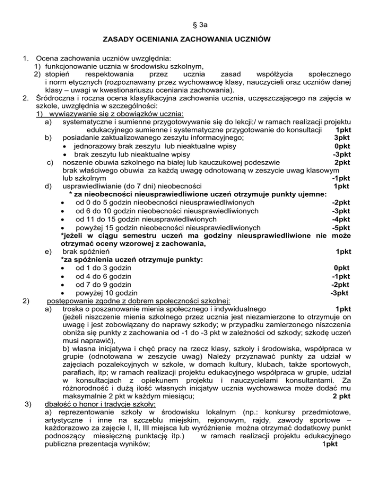 § 3a ZASADY OCENIANIA ZACHOWANIA UCZNIÓW 1. Ocena zachowania uczniów uwzględnia: 1) funkcjonowanie ucznia w środowisku szkolnym, 2) stopień respektowania przez ucznia zasad współżycia społecznego i norm etycznych (rozpoznawany przez wychowawcę klasy, nauczycieli oraz uczniów danej klasy – uwagi w kwestionariuszu oceniania zachowania). 2. Śródroczna i roczna ocena klasyfikacyjna zachowania ucznia, uczęszczającego na zajęcia w szkole, uwzględnia w szczególności: 1) wywiązywanie się z obowiązków ucznia: a) systematyczne i sumienne przygotowywanie się do lekcji;/ w ramach realizacji projektu edukacyjnego sumienne i systematyczne przygotowanie do konsultacji 1pkt b) posiadanie zaktualizowanego zeszytu informacyjnego; 3pkt jednorazowy brak zeszytu lub nieaktualne wpisy 0pkt brak zeszytu lub nieaktualne wpisy -3pkt c) noszenie obuwia szkolnego na białej lub kauczukowej podeszwie 2pkt brak właściwego obuwia za każdą uwagę odnotowaną w zeszycie uwag klasowym lub szkolnym -1pkt d) usprawiedliwianie (do 7 dni) nieobecności 1pkt * za nieobecności nieusprawiedliwione uczeń otrzymuje punkty ujemne: od 0 do 5 godzin nieobecności nieusprawiedliwionych -2pkt od 6 do 10 godzin nieobecności nieusprawiedliwionych -3pkt od 11 do 15 godzin nieusprawiedliwionych -4pkt powyżej 15 godzin nieobecności nieusprawiedliwionych -5pkt *jeżeli w ciągu semestru uczeń ma godziny nieusprawiedliwione nie może otrzymać oceny wzorowej z zachowania, e) brak spóźnień 1pkt *za spóźnienia uczeń otrzymuje punkty: od 1 do 3 godzin 0pkt od 4 do 6 godzin -1pkt od 7 do 9 godzin -2pkt powyżej 10 godzin -3pkt 2) postępowanie zgodne z dobrem społeczności szkolnej: a) troska o poszanowanie mienia społecznego i indywidualnego 1pkt (jeżeli niszczenie mienia szkolnego przez ucznia jest niezamierzone to otrzymuje on uwagę i jest zobowiązany do naprawy szkody; w przypadku zamierzonego niszczenia obniża się punkty z zachowania od -1 do -3 pkt w zależności od szkody; szkodę uczeń musi naprawić), b) własna inicjatywa i chęć pracy na rzecz klasy, szkoły i środowiska, współpraca w grupie (odnotowana w zeszycie uwag) Należy przyznawać punkty za udział w zajęciach pozalekcyjnych w szkole, w domach kultury, klubach, także sportowych, parafiach, itp; w ramach realizacji projektu edukacyjnego współpraca w grupie, udział w konsultacjach z opiekunem projektu i nauczycielami konsultantami. Za różnorodność i dużą ilość własnych inicjatyw ucznia wychowawca może dodać mu maksymalnie 2 pkt w każdym miesiącu; 2 pkt 3) dbałość o honor i tradycje szkoły: a) reprezentowanie szkoły w środowisku lokalnym (np.: konkursy przedmiotowe, artystyczne i inne na szczeblu miejskim, rejonowym, rajdy, zawody sportowe – każdorazowo za zajęcie I, II, III miejsca lub wyróżnienie można otrzymać dodatkowy punkt podnoszący miesięczną punktację itp.) w ramach realizacji projektu edukacyjnego publiczna prezentacja wyników; 1pkt b) kulturalne uczestnictwo w uroczystościach szkolnych i państwowych takich jak: rozpoczęcie i zakończenie roku szkolnego, Święto Patrona Szkoły, ślubowanie klas I, Dzień Edukacji Narodowej, Rocznica Konstytucji 3 Maja, Święto Niepodległości 1pkt c) noszenie stroju odpowiadającego zapisom: 1pkt *strój szkolny: czysty, schludny, w stonowanej, określonej kolorystyce, bluzki zakrywające ramiona i brzuch, odpowiednia długość spódnic (do10 cm nad kolana), klasyczny krój spodni; *strój galowy: dziewczęta – białe bluzki, granatowe/czarne spódnice/ spodnie; chłopcy – białe koszule, granatowe/czarne spodnie d) wygląd: bez farbowania włosów, układania ich na żelu, noszenia grzywki, zasłaniających oczy i utrudniających pisanie; rozpuszczonych włosów (także przez chłopców) 1pkt jednorazowo 0pkt nagminne łamanie zasad (2 razy w miesiącu i więcej) - 5pkt e) schludny wygląd bez makijażu, malowania paznokci (dopuszcza się lakier bezbarwny) 1pkt jednorazowo 0pkt nagminne łamanie zasad (2 razy w miesiącu i więcej) - 5pkt f) schludny wygląd bez biżuterii (dopuszcza się łańcuszek na szyi i skromne kolczyki w uszach) 1pkt jednorazowo 0pkt nagminne łamanie zasad (2 razy w miesiącu i więcej) - 5pkt 4) dbałość o piękno mowy ojczystej: a) przestrzeganie zasad kulturalnego wysławiania się 1pkt b) za każdą uwagę na temat wulgarnego wysławiania się lub agresji słownej otrzymuje się po -1pkt 5) dbałość o bezpieczeństwo i zdrowie własne oraz innych osób: a) przestrzeganie norm bezpieczeństwa w szkole i poza nią (regulamin BHP w szkole, zasady ruchu drogowego) 1pkt przestrzeganie zasad współżycia społecznego w szkole i poza nią 1pkt (za celowe działanie na szkodę zdrowia swojego – spożywanie alkoholu, palenie papierosów i używanie innych środków psychoaktywnych, przemoc i cyberprzemoc uczeń jest oceniany według punktacji: jednorazowo 0pkt nagminne łamanie zasad (2 razy w miesiącu i więcej) - 5pkt 6) godne i kulturalne zachowanie w szkole i poza nią: a) na lekcjach, przerwach i imprezach szkolnych; 1pkt b) w miejscach publicznych (podczas wyjazdów, wycieczek klasowych, na przystankach autobusowych, w kinie, teatrze, bibliotece itp.); 1pkt c) każda uwaga za niewłaściwe zachowanie skutkuje w rozliczeniu miesięcznym - 1pkt 7) okazywanie szacunku innym osobom: 1pkt a) kolegom, koleżankom, nauczycielom, wychowawcom, pracownikom szkoły, ludziom starszym – poprzez społecznie akceptowane normy. b) każda uwaga za brak szacunku skutkuje w rozliczeniu miesięcznym -1pkt 8) za przestępstwa ścigane prawem uczeń otrzymuje naganną semestralną /roczną ocenę z zachowania/. 9) za nagminne używanie telefonu komórkowego, nagrywanie obrazu i dźwięku -2pkt 2a. Śródroczna i roczna ocena klasyfikacyjna z zachowania ucznia nauczanego indywidualnie, uwzględnia w szczególności: 1) wywiązywanie się z obowiązków ucznia: a) systematyczne przygotowanie się do lekcji; 1pkt b) inf