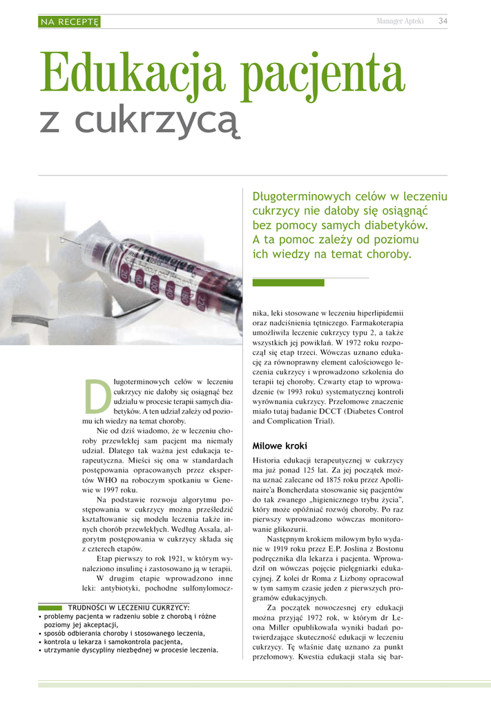 Manager Apteki NA RECEPTĘ 34 Edukacja pacjenta z cukrzycą Długoterminowych celów w leczeniu cukrzycy nie dałoby się osiągnąć bez pomocy samych diabetyków. A ta pomoc zależy od poziomu ich wiedzy na temat choroby. D ługoterminowych celów w leczeniu cukrzycy nie dałoby się osiągnąć bez udziału w procesie terapii samych diabetyków. A ten udział zależy od poziomu ich wiedzy na temat choroby. Nie od dziś wiadomo, że w leczeniu choroby przewlekłej sam pacjent ma niemały udział. Dlatego tak ważna jest edukacja terapeutyczna. Mieści się ona w standardach postępowania opracowanych przez ekspertów WHO na roboczym spotkaniu w Genewie w 1997 roku. Na podstawie rozwoju algorytmu postępowania w cukrzycy można prześledzić kształtowanie się modelu leczenia także innych chorób przewlekłych. Według Assala, algorytm postępowania w cukrzycy składa się z czterech etapów. Etap pierwszy to rok 1921, w którym wynaleziono insulinę i zastosowano ją w terapii. W drugim etapie wprowadzono inne leki: antybiotyki, pochodne sulfonylomocz Trudności w leczeniu cukrzycy: •p roblemy pacjenta w radzeniu sobie z chorobą i różne poziomy jej akceptacji, • sposób odbierania choroby i stosowanego leczenia, • kontrola u lekarza i samokontrola pacjenta, • utrzymanie dyscypliny niezbędnej w procesie leczenia. nika, leki stosowane w leczeniu hiperlipidemii oraz nadciśnienia tętniczego. Farmakoterapia umożliwiła leczenie cukrzycy typu 2, a także wszystkich jej powikłań. W 1972 roku rozpoczął się etap trzeci. Wówczas uznano edukację za równoprawny element całościowego leczenia cukrzycy i wprowadzono szkolenia do terapii tej choroby. Czwarty etap to wprowadzenie (w 1993 roku) systematycznej kontroli wyrównania cukrzycy. Przełomowe znaczenie miało tutaj badanie DCCT (Diabetes Control and Complication Trial). Milowe kroki Historia edukacji terapeutycznej w cukrzycy ma już ponad 125 lat. Za jej początek można uznać zalecane od 1875 roku przez Apollinaire’a Boncherdata stosowanie się pacjentów do tak zwanego „higienicznego trybu życia”, który może opóźniać rozwój choroby. Po raz pierwszy wprowadzono wówczas monitorowanie glikozurii. Następnym krokiem milowym było wydanie w 1919 roku przez E.P. Joslina z Bostonu podręcznika dla lekarza i pacjenta. Wprowadził on wówczas pojęcie pielęgniarki edukacyjnej. Z kolei dr Roma z Lizbony opracował w tym samym czasie jeden z pierwszych programów edukacyjnych. Za początek nowoczesnej ery edukacji można przyjąć 1972 rok, w którym dr Leona Miller opublikowała wyniki badań potwierdzające skuteczność edukacji w leczeniu cukrzycy. Tę właśnie datę uznano za punkt przełomowy. Kwestia edukacji stała się bar- 35 Manager Apteki dzo popularna, co przyczyniło się do powstania w 1974 roku w Stanach Zjednoczonych Amerykańskiego Stowarzyszenia Instruktorów Edukacji Zdrowotnej w Cukrzycy (AAED). Jego celem było zwiększenie roli edukatorów i poprawa jakości edukacji terapeutycznej chorych na cukrzycę. Natomiast w Europie pierwsze sympozjum poświęcone nauczaniu chorych zorganizowano w Genewie w 1977 roku z okazji dorocznego zjazdu Europejskiego Towarzystwa Badań nad Cukrzycą. Coraz większe zainteresowanie edukacją terapeutyczną w cukrzycy na naszym kontynencie zaowocowało powstaniem grupy edukacyjnej Zespołów do spraw Nauczania Cukrzycy (DESG). Programowym założeniem tej grupy stało się zaliczenie do podstawowych elementów terapii nauczania chorych na cukrzycę. Stowarzyszenie miało za zadanie rozpowszechniać wśród lekarzy, pielęgniarek i dietetyków programy szkoleniowe dla chorych. Przeprowadzone od tego czasu badania udowodniły znaczenie zespołowej pracy lekarzy z diabetykami. Z tego względu cukrzycę uznano za chorobę wymagającą medycznopsychologiczno-społecznego podejścia. Edukacja w Polsce W Polsce prekursorem edukacji zdrowotnej był Florian Znaniecki, socjolog z Uniwersytetu Warszawskiego, który w okresie międzywojennym stworzył podstawy edukacji terapeutycznej. Jednak w Polsce i w innych krajach Europy Wschodniej dopiero po latach zainicjowano wielki program szkolenia diabetologicznego. Jego animatorem był profesor Berger z Düsseldorfu. Od tego czasu zaobserwowano w Polsce szybki rozwój idei włączania edukacji terapeutycznej do standardów postępowania w cukrzycy. W ramach Narodowego Programu Walki z Cukrzycą w 1998 roku opracowano w Łodzi zasady kształcenia edukatorów cukrzycy i przekazano je do Ministerstwa Zdrowia. Przełom w powołaniu zawodu edukatora cukrzycy nastąpił dopiero rok temu. Minister zdrowia Ewa Kopacz skłoniła się ku temu, żeby w taryfikatorze zawodów medycznych umieścić NA RECEPTĘ Modele i metody edukacji terapeutycznej w cukrzycy Prowadzenie edukacji terapeutycznej napotyka liczne trudności. Założenia programowe takiej edukacji powinny być zróżnicowane, zależne od: • t ypu cukrzycy – trzeba stworzyć oddzielne programy dla chorych na cukrzycę typu 1 i typu 2, • w ieku (dzieci, młodzież, dorośli, osoby starsze), • poziomu wykształcenia, środowiska, z którego pochodzi pacjent, • możliwości percepcyjnych chorego na cukrzycę. tak bardzo potrzebny zawód, jakim jest edukator ds. diabetologii. Departament Pielęgniarek i Położnych poinformował o zatwierdzeniu w lutym 2011 roku nowego ramowego programu kursu specjalistycznego pod nazwą „Edukator w cukrzycy dla pielęgniarek i położnych”. Jego celem jest przygotowanie pielęgniarek i położnych do prowadzenia oraz koordynacji działań związanych z edukacją terapeutyczną, podwyższającą jakość życia osób chorych na cukrzycę. W połowie roku minister zdrowia wydała rozporządzenie w sprawie kwalifikacji, jakie powinni mieć pracownicy na poszczególnych stanowiskach pracy w zakładach leczniczych. W załączonym do rozporządzenia taryfikatorze kwalifikacyjnym w punkcie 118 znajduje się pozycja edukator do spraw diab