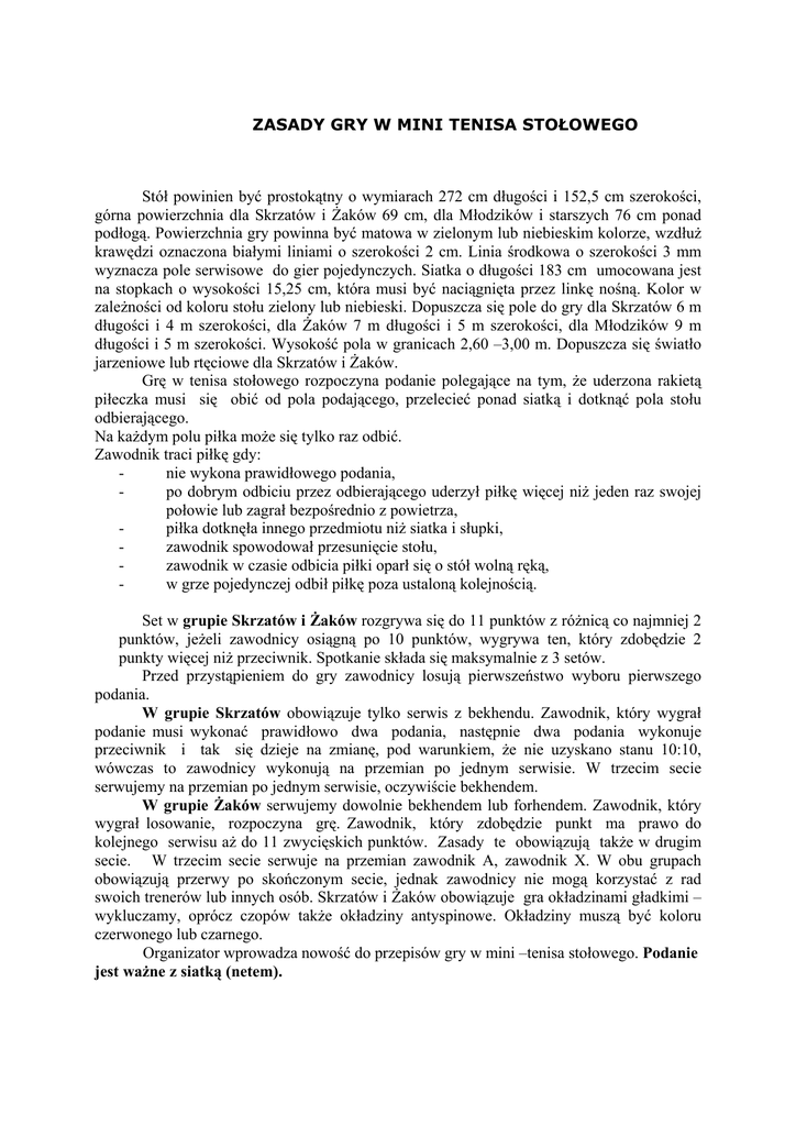 ZASADY GRY W MINI TENISA STOŁOWEGO Stół powinien być prostokątny o wymiarach 272 cm długości i 152,5 cm szerokości, górna powierzchnia dla Skrzatów i Żaków 69 cm, dla Młodzików i starszych 76 cm ponad podłogą. Powierzchnia gry powinna być matowa w zielonym lub niebieskim kolorze, wzdłuż krawędzi oznaczona białymi liniami o szerokości 2 cm. Linia środkowa o szerokości 3 mm wyznacza pole serwisowe do gier pojedynczych. Siatka o długości 183 cm umocowana jest na stopkach o wysokości 15,25 cm, która musi być naciągnięta przez linkę nośną. Kolor w zależności od koloru stołu zielony lub niebieski. Dopuszcza się pole do gry dla Skrzatów 6 m długości i 4 m szerokości, dla Żaków 7 m długości i 5 m szerokości, dla Młodzików 9 m długości i 5 m szerokości. Wysokość pola w granicach 2,60 –3,00 m. Dopuszcza się światło jarzeniowe lub rtęciowe dla Skrzatów i Żaków. Grę w tenisa stołowego rozpoczyna podanie polegające na tym, że uderzona rakietą piłeczka musi się obić od pola podającego, przelecieć ponad siatką i dotknąć pola stołu odbierającego. Na każdym polu piłka może się tylko raz odbić. Zawodnik traci piłkę gdy: nie wykona prawidłowego podania, po dobrym odbiciu przez odbierającego uderzył piłkę więcej niż jeden raz swojej połowie lub zagrał bezpośrednio z powietrza, piłka dotknęła innego przedmiotu niż siatka i słupki, zawodnik spowodował przesunięcie stołu, zawodnik w czasie odbicia piłki oparł się o stół wolną ręką, w grze pojedynczej odbił piłkę poza ustaloną kolejnością. Set w grupie Skrzatów i Żaków rozgrywa się do 11 punktów z różnicą co najmniej 2 punktów, jeżeli zawodnicy osiągną po 10 punktów, wygrywa ten, który zdobędzie 2 punkty więcej niż przeciwnik. Spotkanie składa się maksymalnie z 3 setów. Przed przystąpieniem do gry zawodnicy losują pierwszeństwo wyboru pierwszego podania. W grupie Skrzatów obowiązuje tylko serwis z bekhendu. Zawodnik, który wygrał podanie musi wykonać prawidłowo dwa podania, następnie dwa podania wykonuje przeciwnik i tak się dzieje na zmianę, pod warunkiem, że nie uzyskano stanu 10:10, wówczas to zawodnicy wykonują na przemian po jednym serwisie. W trzecim secie serwujemy na przemian po jednym serwisie, oczywiście bekhendem. W grupie Żaków serwujemy dowolnie bekhendem lub forhendem. Zawodnik, który wygrał losowanie, rozpoczyna grę. Zawodnik, który zdobędzie punkt ma prawo do kolejnego serwisu aż do 11 zwycięskich punktów. Zasady te obowiązują także w drugim secie. W trzecim secie serwuje na przemian zawodnik A, zawodnik X. W obu grupach obowiązują przerwy po skończonym secie, jednak zawodnicy nie mogą korzystać z rad swoich trenerów lub innych osób. Skrzatów i Żaków obowiązuje gra okładzinami gładkimi – wykluczamy, oprócz czopów także okładziny antyspinowe. Okładziny muszą być koloru czerwonego lub czarnego. Organizator wprowadza nowość do przepisów gry w mini –tenisa stołowego. Podanie jest ważne z siatką (netem).