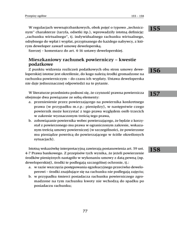 Przepisy ogólne 155 – 158 W regulacjach wewnątrzbankowych, obok pojęć o typowo „technicznym” charakterze (taryfa, odsetki itp.), wprowadziły istotną definicję: „rachunku wirtualnego”, tj. indywidualnego rachunku wirtualnego, odrębnego do wpłat i wypłat, przypisanego do każdego nabywcy, z którym deweloper zawarł umowę deweloperską. Szerzej – komentarz do art. 4-16 ustawy deweloperskiej. Mieszkaniowy rachunek powierniczy – kwestie podatkowe 155 Z punktu widzenia rozliczeń podatkowych obu stron umowy deweloperskiej istotne jest określenie, do kogo należą środki gromadzone na rachunku powierniczym – do czasu ich wypłaty. Ustawa deweloperska nie daje jednoznacznej odpowiedzi na to pytanie. 156 W literaturze przedmiotu podnosi się, że czynność prawna powiernicza obejmuje dwa powiązane ze sobą elementy: a. przeniesienie przez powierzającego na powiernika konkretnego prawa (w przypadku m.r.p.: pieniędzy), w następstwie czego powiernik może korzystać z tego prawa względem osób trzecich w zakresie wyznaczonym treścią tego prawa, b. zobowiązanie powiernika wobec powierzającego, że będzie z korzystał z powierzonego mu prawa w ograniczonym zakresie, wskazanym treścią umowy powierniczej (w szczególności, że powierzone mu pieniądze powrócą do powierzającego w ściśle określonych sytuacjach). 157 Istotną wskazówkę interpretacyjną zawierają postanowienia art. 59 ust. 4-7 Prawa bankowego. Z przepisów tych wynika, że jeżeli powierzenie środków pieniężnych nastąpiło w wykonaniu umowy z datą pewną (np. deweloperskiej), środki te podlegają szczególnej ochronie, tj.: a. w razie wszczęcia postępowania egzekucyjnego przeciwko deweloperowi – środki znajdujące się na rachunku nie podlegają zajęciu; b. w przypadku śmierci posiadacza rachunku powierniczego zgromadzone na tym rachunku kwoty nie wchodzą do spadku po posiadaczu rachunku; 158 77 159 – 162 Rozdział I c. w razie ogłoszenia upadłości posiadacza rachunku powierniczego – środki pieniężne znajdujące się na tym rachunku podlegają wyłączeniu z masy upadłości. 159 Ostatni z ww. warunków został istotnie zmodyfikowany w ustawie deweloperskiej w przypadku upadłości dewelopera (zob. art. 36). Zgodnie bowiem z art. 425 (2) PUiN, w przypadku ogłoszenia upadłości dewelopera środki zgromadzone na m.r.p. stanowią osobną masę upadłości, która służy zaspokojeniu w pierwszej kolejności nabywców lokali mieszkalnych lub domów jednorodzinnych, objętych tym przedsięwzięciem. 160 Powierzenie pieniędzy deweloperowi w ramach umowy deweloperskiej rachunku jest praktycznie tożsame z instytucją warunkowego przeniesienia własności. Powierzenie środków pieniężnych deweloperowi oznacza, że z chwilą wpłaty środków pieniężnych na m.r.p. deweloper nie staje się ich nieograniczonym właścicielem. Aby uzyskać status właściciela środków wpłaconych na m.r.p deweloper musi wypełnić warunki precyzyjnie określone w zapisach umowy deweloperskiej oraz umowy m.r.p. Jednocześnie, zawarcie umowy powierniczej powoduje, że nabywca powierzający deweloperowi środki finansowe nie może zażądać ich wypłaty poza przypadkami warunkującymi ich zwrot również precyzyjnie określonymi w umowie deweloperskiej. 161 Deweloper włada powierzonymi mu środkami jak powiernik, przy czym władanie to jest ograniczone wyłącznie do przechowywania wpłaconych środków na m.r.p. dewelopera. Do momentu wyrażenia przez bank prowadzący m.r.p. zgody na przekazanie zdeponowanych środków deweloperowi (która w praktyce uzależniona od prawidłowego zakończenia każdego z etapów przedsięwzięcia deweloperskiego) deweloper nie może swobodnie dysponować tymi środkami. 162 W przypadku m.r.p. otwartego wypłata zdeponowanych środków deweloperowi następuje zgodnie z harmonogramem przedsięwzięcia deweloperskiego określonego w umowie deweloperskiej. Zgodnie z zapisem art. 12 ustawy deweloperskiej bank sprawuje kontrolę nad inwestycją i w efekcie arbitralnie decyduje, czy warunek wypłaty został spełniony. W dacie wypłaty środków (albo w dacie spełnienia się warun- 78 Przepisy ogólne 163 – 166 ku tej wypłaty) deweloper przestaje władać wpłaconymi pieniędzmi jak powiernik i staje się ich bezwarunkowym właścicielem. W przypadku m.r.p. zamkniętego wypłata deweloperowi zdeponowanych środków następuje jednorazowo po przeniesieniu na nabywcę prawa do lokalu lub domu jednorodzinnego. W tym przypadku, w ramach sprawowanej kontroli, bank wypłaca deweloperowi zgromadzone środki dopiero po otrzymaniu odpisu aktu notarialnego umowy przenoszącej na nabywcę prawo własności. W dacie ustanowienia odrębnej własności lokalu (zbycia domu jednorodzinnego) deweloper przestaje występować w roli powiernika i staje się bezwarunkowym właścicielem wpłaconych środków. 163 Z istoty charakteru m.r.p. wynika więc, że moment wpłaty przez nabywcę środków finansowych na rachunek bankowy dewelopera jest neutralny; nie powstaje przychód z tego tytułu. 164 Niezależnie jednak od ustalenia dnia, w którym wpłacone środki są przekazywane „na własność” dewelopera, podkreślić należy, że samo otrzymanie pieniędzy nie wiąże się z powstaniem przychodu u dewelopera. Zgodnie bowiem z art. 12 ust. 4 pkt 1 ustawy o CIT, przychody związane ze sprzedażą towarów handlowych powstają nie wcześniej niż w dacie ich sprzedaży. Zgodnie natomiast z art. 12 ust. 3a ustawy o CIT, datą powstania przychodu jest dzień wydania rzeczy, nie później niż dzień wystawienia faktury albo uregulowania należności. „Wydanie rzeczy” wiąże się tutaj z wydaniem nabywcy lokalu. Istotne jest jednak to, że lokal stanie się rzeczą dopiero w dacie ustanowienia odrębnej własności. Dlatego przychody dewelopera powstają dopiero w dacie ustanowienia odrębnej własności (aktu notarialnego, w którym deweloper ustanawia to prawo na rz