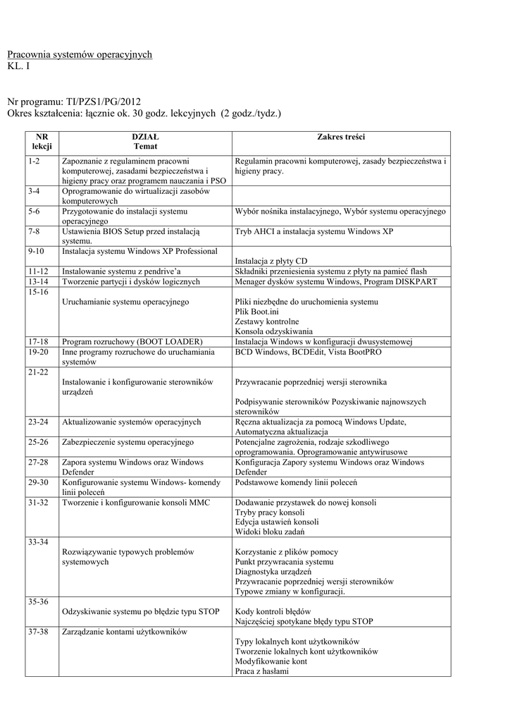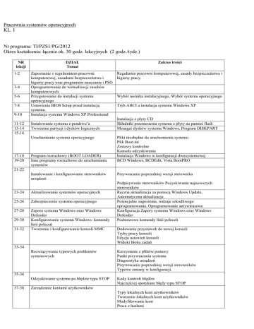 Pracownia systemów operacyjnych KL. I Nr programu: TI/PZS1/PG/2012 Okres kształcenia: łącznie ok. 30 godz. lekcyjnych (2 godz./tydz.) NR lekcji 1-2 3-4 5-6 7-8 9-10 11-12 13-14 15-16 DZIAŁ Temat Zakres treści Zapoznanie z regulaminem pracowni komputerowej, zasadami bezpieczeństwa i higieny pracy oraz programem nauczania i PSO Oprogramowanie do wirtualizacji zasobów komputerowych Przygotowanie do instalacji systemu operacyjnego Ustawienia BIOS Setup przed instalacją systemu. Instalacja systemu Windows XP Professional Regulamin pracowni komputerowej, zasady bezpieczeństwa i higieny pracy. Instalowanie systemu z pendrive’a Tworzenie partycji i dysków logicznych Uruchamianie systemu operacyjnego 17-18 19-20 Program rozruchowy (BOOT LOADER) Inne programy rozruchowe do uruchamiania systemów Wybór nośnika instalacyjnego, Wybór systemu operacyjnego Tryb AHCI a instalacja systemu Windows XP Instalacja z płyty CD Składniki przeniesienia systemu z płyty na pamieć flash Menager dysków systemu Windows, Program DISKPART Pliki niezbędne do uruchomienia systemu Plik Boot.ini Zestawy kontrolne Konsola odzyskiwania Instalacja Windows w konfiguracji dwusystemowej BCD Windows, BCDEdit, Vista BootPRO 21-22 Instalowanie i konfigurowanie sterowników urządzeń 23-24 Aktualizowanie systemów operacyjnych 25-26 Zabezpieczenie systemu operacyjnego 27-28 Zapora systemu Windows oraz Windows Defender Konfigurowanie systemu Windows- komendy linii poleceń Tworzenie i konfigurowanie konsoli MMC 29-30 31-32 Przywracanie poprzedniej wersji sterownika Podpisywanie sterowników Pozyskiwanie najnowszych sterowników Ręczna aktualizacja za pomocą Windows Update, Automatyczna aktualizacja Potencjalne zagrożenia, rodzaje szkodliwego oprogramowania. Oprogramowanie antywirusowe Konfiguracja Zapory systemu Windows oraz Windows Defender Podstawowe komendy linii poleceń Dodawanie przystawek do nowej konsoli Tryby pracy konsoli Edycja ustawień konsoli Widoki bloku zadań 33-34 Rozwiązywanie typowych problemów systemowych Korzystanie z plików pomocy Punkt przywracania systemu Diagnostyka urządzeń Przywracanie poprzedniej wersji sterowników Typowe zmiany w konfiguracji. Odzyskiwanie systemu po błędzie typu STOP Kody kontroli błędów Najczęściej spotykane błędy typu STOP 35-36 37-38 Zarządzanie kontami użytkowników Typy lokalnych kont użytkowników Tworzenie lokalnych kont użytkowników Modyfikowanie kont Praca z hasłami 39-40 Uprawnienia NTFS do folderów i plików, lista kontroli dostępu ACL. Uprawnienia NTFS do folderów i plików, lista kontroli dostępu ACL Konfigurowanie i wykorzystywanie grup Informacje ogólne Lokalne grupy wbudowane Praca z grupami 41-42 43-44 Zasady grupy. Zasady zabezpieczeń lokalnych 45-46 47-48 49-50 51 52 53 54 55 56 57 58 59 60 Zasady zabezpieczeń lokalnych Szablony zabezpieczeń Konfiguracja i analiza zabezpieczeń Inspekcja dostępu do zasobów Konfiguracja opcji logowania Narzędzia do Narzędzia do zarządzania partycjami. Błędy na dysku zarządzania partycjami. Błędy na dysku Zjawisko Zjawisko fragmentacji dysku, defragmentacja. fragmentacji dysku, defragmentacja. Zdalna administracja Konfiguracja Pulpitu zdalnego Podłączanie do komputera zdalnego Wydajność i konserwacja systemu operacyjnego Dostosuj efekty wizualne Zwolnij miejsce na dysku twardym Rozmieść elementy na dysku twardym tak, aby programy uruchamiały się szybciej Zarządzanie usługami systemowymi Zmiana sposobu uruchamiania usług Zależności pomiędzy usługami Optymalizowanie systemu Windows Przyśpieszanie inicjowania systemu. wyłączenie niepotrzebnych usług. Optymalizacja pamięci wirtualnej Zwiększenie wydajności komputerów za Windows ReadyBoost konfiguracja z pamięcią Flash pomocą pamięci flash Optymalizacja efektów wizualnych i wyglądu Optymalizacja pulpitu, ikon, okien i przycisków interfejsu graficznego Optymalizacja pracy pamięci masowych Indeksowanie plików, buforowanie zapisu, oczyszczanie dysku Wykonywanie kopii bezpieczeństwa danych Metody wykonywania kopii bezpieczeństwa danych, wybrane rodzaje kopii bezpieczeństwa danych; Odzyskiwanie danych Metody odzyskiwania danych Odzyskiwanie rejestru systemu Windows Programy do odzyskiwania danych użytkownika z komputera osobistego Odzyskiwanie systemu z obrazów dysków i Programy do odzyskiwania danych, partycji Pozostałe godziny będą przeznaczone na powtórki trudniejszego materiału i sprawdziany 2