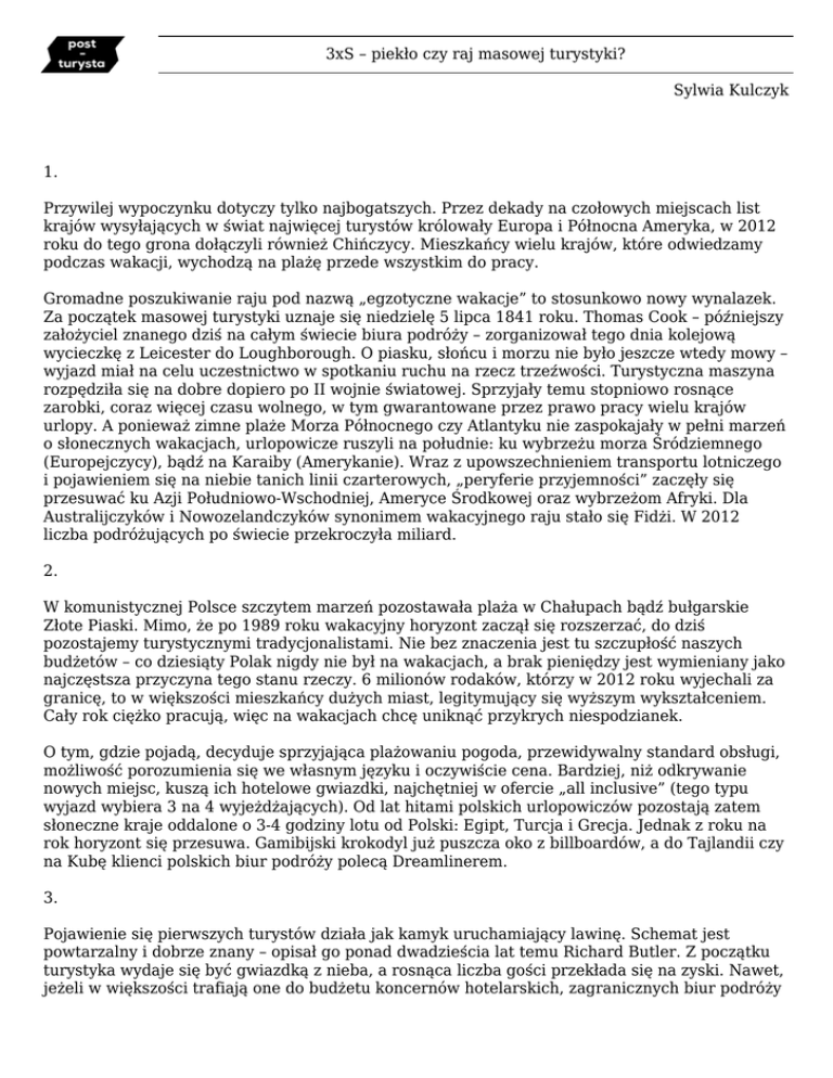 3xS – piekło czy raj masowej turystyki? Sylwia Kulczyk 1. Przywilej wypoczynku dotyczy tylko najbogatszych. Przez dekady na czołowych miejscach list krajów wysyłających w świat najwięcej turystów królowały Europa i Północna Ameryka, w 2012 roku do tego grona dołączyli również Chińczycy. Mieszkańcy wielu krajów, które odwiedzamy podczas wakacji, wychodzą na plażę przede wszystkim do pracy. Gromadne poszukiwanie raju pod nazwą „egzotyczne wakacje” to stosunkowo nowy wynalazek. Za początek masowej turystyki uznaje się niedzielę 5 lipca 1841 roku. Thomas Cook – późniejszy założyciel znanego dziś na całym świecie biura podróży – zorganizował tego dnia kolejową wycieczkę z Leicester do Loughborough. O piasku, słońcu i morzu nie było jeszcze wtedy mowy – wyjazd miał na celu uczestnictwo w spotkaniu ruchu na rzecz trzeźwości. Turystyczna maszyna rozpędziła się na dobre dopiero po II wojnie światowej. Sprzyjały temu stopniowo rosnące zarobki, coraz więcej czasu wolnego, w tym gwarantowane przez prawo pracy wielu krajów urlopy. A ponieważ zimne plaże Morza Północnego czy Atlantyku nie zaspokajały w pełni marzeń o słonecznych wakacjach, urlopowicze ruszyli na południe: ku wybrzeżu morza Śródziemnego (Europejczycy), bądź na Karaiby (Amerykanie). Wraz z upowszechnieniem transportu lotniczego i pojawieniem się na niebie tanich linii czarterowych, „peryferie przyjemności” zaczęły się przesuwać ku Azji Południowo-Wschodniej, Ameryce Środkowej oraz wybrzeżom Afryki. Dla Australijczyków i Nowozelandczyków synonimem wakacyjnego raju stało się Fidżi. W 2012 liczba podróżujących po świecie przekroczyła miliard. 2. W komunistycznej Polsce szczytem marzeń pozostawała plaża w Chałupach bądź bułgarskie Złote Piaski. Mimo, że po 1989 roku wakacyjny horyzont zaczął się rozszerzać, do dziś pozostajemy turystycznymi tradycjonalistami. Nie bez znaczenia jest tu szczupłość naszych budżetów – co dziesiąty Polak nigdy nie był na wakacjach, a brak pieniędzy jest wymieniany jako najczęstsza przyczyna tego stanu rzeczy. 6 milionów rodaków, którzy w 2012 roku wyjechali za granicę, to w większości mieszkańcy dużych miast, legitymujący się wyższym wykształceniem. Cały rok ciężko pracują, więc na wakacjach chcę uniknąć przykrych niespodzianek. O tym, gdzie pojadą, decyduje sprzyjająca plażowaniu pogoda, przewidywalny standard obsługi, możliwość porozumienia się we własnym języku i oczywiście cena. Bardziej, niż odkrywanie nowych miejsc, kuszą ich hotelowe gwiazdki, najchętniej w ofercie „all inclusive” (tego typu wyjazd wybiera 3 na 4 wyjeżdżających). Od lat hitami polskich urlopowiczów pozostają zatem słoneczne kraje oddalone o 3-4 godziny lotu od Polski: Egipt, Turcja i Grecja. Jednak z roku na rok horyzont się przesuwa. Gamibijski krokodyl już puszcza oko z billboardów, a do Tajlandii czy na Kubę klienci polskich biur podróży polecą Dreamlinerem. 3. Pojawienie się pierwszych turystów działa jak kamyk uruchamiający lawinę. Schemat jest powtarzalny i dobrze znany – opisał go ponad dwadzieścia lat temu Richard Butler. Z początku turystyka wydaje się być gwiazdką z nieba, a rosnąca liczba gości przekłada się na zyski. Nawet, jeżeli w większości trafiają one do budżetu koncernów hotelarskich, zagranicznych biur podróży i międzynarodowych przewoźników, to co zostaje i tak stanowi niewyobrażalne dla wielu bogactwo. Nic dziwnego, że każdy chce pracować dla turystów. Tradycyjne zajęcia tracą na atrakcyjności, a w hierarchii społecznej przestają liczyć się bardziej doświadczeni, a zaczynają bogatsi. Cel uświęca środki – prostytucja, drobna przestępczość i zakazane używki to nieodłączni towarzysze miejsc, gdzie czas ma płynąć przyjemnie. Goście muszą gdzieś mieszkać, więc zieleń znika pod betonem hoteli. Piasek z placów budowy zasypuje rafy koralowe, a zanieczyszczona ściekami woda traci swój błękitny kolor. Umiejętny marketing potrafi jednak zdziałać cuda, więc klienci jeszcze przez jakiś czas wierzą, że trafili do egzotycznego raju. Jednak Richard Butler nie pozostawia nadziei – wszystko jest kwestią skali. Na dłuższą metę negatywnych zmian nie da się ukryć, więc strumień gości zaczyna odpływać gdzie indziej. Czy to już koniec? Nie. Niższe ceny czy oryginalna oferta często pozwalają zaistnieć na nowo. Ale to już zawsze będzie miejsce „po przejściach”. 4. Tocząca się od lat dyskusja wokół stosunku człowieka do Matki Ziemi i jej zasobów znalazła odbicie również w turystyce. W 1987 roku Jost Krippendorf jako pierwszy opisał „turystykę alternatywną” – indywidualną, przyjazną środowisku i ludziom. Obok „3S” (sun, sea, sand) wyrosło „3E” (excitment, entertainment, education). Światowa Organizacja Turystyczna ocenia, że ekoturystyka, turystyka etniczna i podobne im, do niedawna absolutnie niszowe formy spędzania wolnego czasu, rozwijają się obecnie o wiele szybciej, niż typowa turystyka wypoczynkowa. „Nowi” turyści chętnie nazywają się „podróżnikami” i często z obrzydzeniem spoglądają na „masowych”, ale różnice są mniejsze, niż z pozoru mogłoby się wydawać. W gruncie rzeczy wszyscy marzą o tym samym – wspaniałych wakacjach w wyjątkowym otoczeniu. Kto traciłby czas na samodzielną eksplorację i z godnością przyjął ewentualne rozczarowanie? Kto chciałby wypoczywać w najwspanialszym nawet miejscu, którego nazwa nic nie powie kolegom z pracy? Dlatego prawie każdy „podróżnik” kurczowo dzierży w dłoni przewodnik z serii „Lonely Planet”. Pierwszy powstał w latach siedemdziesiątych przy kuchennym stole i pomagał odnaleźć się w Azji Południowo-Wschodniej. Dziś Lonely Planet to medialny gigant i turystyczny trendsetter. Na Ziemi nie ma zakądku, którego nie obejmowałby któryś