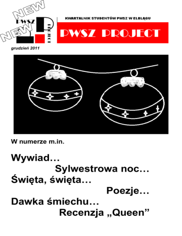 grudzień 2011 W numerze m.in. Wywiad… Sylwestrowa noc… Święta, święta… Poezje… Dawka śmiechu… Recenzja „Queen” Spis treści Tytułem wstępu, czyli nowa edycja… 3 Co ciekawego dzieje się w PWSZ? 3 Tradycje Bożego Narodzenia 4 Do stajenki 6 Anty-magia świąt 6 Sylwestrowa noc, czyli pomysłów kilka na niebanalną imprezę 7 Podziemie 8 PWSZ okiem licealisty 9 Demot, czyli „życie nie pieści” 11 Kącik poetycki 12 Z cyklu „Recenzje”. Reedycja „Queen” 13 Kącik kulinarny 15 Dawka śmiechu 17 Świąteczne rymowanki 19 Na zakończenie 20 Redaktorzy numeru______________ REDAKTOR NUMERU: Grzegorz Krajnik Redaktor naczelny: Grzegorz Krajnik Zastępca redaktora naczelnego: Agnieszka Sabeł, Wojciech Detko Sekretarz redakcji: Agata Nowak Współpraca: Michał Libuda, Mariola Jachimczyk, Agnieszka Sabeł, Sandra Kotlewska, Piotr Leszczyński, Daniel Synowiec Szata graficzna: Redakcja Opieka językowo-stylistyczna: pani Katarzyna Jarosińska-Buriak 2 Odpowiadając na zapotrzebowanie studenckiego pisma w PWSZ w Elblągu, z inicjatywy sekcji dziennikarskiej Koła Naukowego „Humanitas” reaktywowano kwartalnik studencki. Wstępem do jego stworzenia były warsztaty dziennikarskie, podczas których studenci mieli możliwość poznania pracy dziennikarza „od kuchni”. Gośćmi i prowadzącymi warsztaty były osoby związane z elbląskim środowiskiem dziennikarskim. Wymiana doświadczeń i praktyczne wskazówki, jak pisać, i redagować teksty, i co zrobić by były wartościowe, były istotnym elementem spotkania roboczego, którego wynikiem – prócz deklaracji studentów do współtworzenia tego czasopisma – jest ten pierwszy numer nowej edycji gazety studenckiej. Kolejnym krokiem zbliżającym do wydania pierwszego numeru „PWSZ NEW PROJECT” było spotkanie nowego zespołu sekcji dziennikarskiej Koła Naukowego „Humanitas”. Podczas tego spotkania dokonano wyboru zespołu redakcyjnego oraz podzielono odpowiedzialność za przygotowanie pierwszego numeru. Forma i treści tego wydania to propozycje studentów, bo jest to pismo studenckie. Prosimy o wyrozumiałość, jeśli zauważycie jakieś błędy. Będziemy również wdzięczni za przesyłanie swoich opinii i propozycji na e-mail, bądź zgłaszanie uwag osobiście do członków redakcji tego wydania. g.k. Co ciekawego dzieje się w PWSZ ? Hmm… dużo się tego dzieje. Ostatnio byliśmy świadkami wielu konferencji, projektów i innych przedsięwzięć, które zasługują na szczególną uwagę. Nie sposób opisać wszystkie, jednakże nie omieszkamy wspomnieć o niektórych z nich i przybliżyć ich przebieg. Ponadto ciekawskich odsyłamy do strony www.pwsz.elblag.pl , gdzie można znaleźć wiele informacji o bieżących wydarzeniach, choć zapewne studentów szczególnie interesują te w stylu „zajęcia odwołane” Mimo wszystko gorąco zachęcamy do zapoznawania się z wszystkimi informacjami dotyczącymi Uczelni, gdyż Uczelnia to My. Redakcja 3 TRADYCJE BOŻEGO NARODZENIA Boże Narodzenie obchodzone jest od IV w. n. e. To czas niezwykły, magiczny, pełen cudów, czas, z którym wiążą się nasze refleksje na temat jedności z rodziną. Już w dawnych czasach świętom towarzyszyły różne symbole i obrzędy, które przetrwały do dzisiaj. W tę jedyną noc w roku zwierzęta mówią ludzkim głosem, a wszyscy ludzie radują się gronem rodzinnym. Zanim przełamiemy się opłatkiem i zasiądziemy do wigilijnej wieczerzy – przypomnijmy sobie znaczenie podstawowych świątecznych znaków i symboli. Wigilia – dawniej określana także kolacją wigilijną, postnikiem, kutią. Wigilijna tradycja nakazywała zakończenie wszystkich prac domowych, zanim pojawi się pierwsza gwiazda na wieczornym niebie. Zasiadający przy suto zastawionym stole, bez trosk i obaw, są sobie równi i we wspólnocie cieszą się z narodzin Chrystusa. Zawsze znajduje się jedno wolne miejsce przy stole dla nieznajomego przybysza. Choinka – to najczęściej dziś spotykana, choć historycznie najmłodsza, ozdoba domów w czasie Bożego Narodzenia. W Polsce zwyczaj strojenia choinki przyjął się dopiero w latach dwudziestych. Ozdabiano ją jabłkami, orzechami, piernikami i kolorowym papierem. Współczesne ozdoby choinkowe to przede wszystkim kolorowe bombki o różnych kształtach, błyszczące łańcuchy i elektryczne lampki. Opłatek – jest jednym z najważniejszych elementów świąt. Łamiąc opłatek życzymy swoim najbliższym wszystkiego, co najlepsze. Dla wielu z nas jest to wzruszająca chwila podczas tej cudownej nocy. 4 Kolęda – jest nierozłącznym elementem Świąt Bożego Narodzenia. Najdawniejsze kolędy, które znamy, pochodzą z wieku XV, a najpopularniejsza z nich to kolęda "Anioł pasterzom mówił". Tradycja śpiewania kolęd nigdy nie została zapomniana. Do dziś, śpiewają je (lub słuchają) wszyscy: i starsi, i młodsi. Przekazywano je z pokolenia na pokolenie, z czasem zaczęto je drukować w zbiorach kolęd i pastorałek –tzw. „kantyczkach”. Najintensywniejszy rozwój tradycji kolędowej przypada na wiek XVII i XVIII. Wówczas powstały znane do dziś kolędy: „Wśród nocnej ciszy”, „Lulajże Jezuniu”, „Bóg się rodzi” i inne. Święty Mikołaj – miły, starszy pan z siwą brodą, na którego czekają wszystkie dzieci. Legenda głosi, że ukończył seminarium duchowne i przez wiele lat był biskupem Miry, portowego miasteczka w Azji Mniejszej. Był człowiekiem wielkiego serca, pomagał biednym i potrzebującym. Rozdał cały swój majątek ubogim. Prawdopodobnie czynił też cuda. Prezenty – to ta część świąt, która jest uwielbiana przez wszystkie dzieci. Kiedy na niebie zaświeci pierwsza gwiazdka (zwana też Gwiazdą Betlejemską) rozpakowywane są pakunki, znajdujące się pod choinką. W każdym domu święta są podobnie spędzane. Jednak prawie wszyscy cieszą się na pobyt w gronie rodzinnym. Nie zapominajmy o ludziach, którzy w ten
