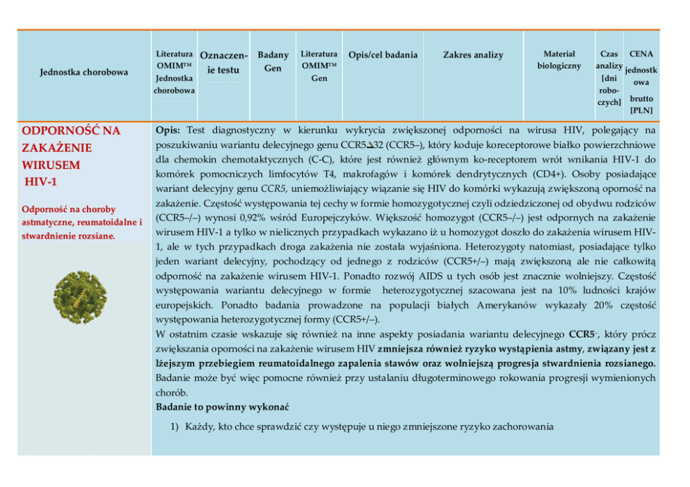 Jednostka chorobowa ODPORNOŚĆ NA ZAKAŻENIE WIRUSEM HIV-1 Odporność na choroby astmatyczne, reumatoida lne i stwardnienie rozsiane. Literatura OznaczenOMIMTM ie testu Jednostka chorobowa Badany Gen Literatura OMIMTM Gen Opis/cel badania Zakres analizy Materiał biologiczny Czas CENA analizy jednostk [dni owa roboczych] brutto [PLN] Opis: Test diagnostyczny w kierunku wykrycia zwiększonej odporności na wirusa HIV, polegający na poszukiwaniu wariantu delecyjnego genu CCR5 32 (CCR5–), który koduje koreceptorowe białko powierzchniowe dla chemokin chemotaktycznych (C-C), które jest również głównym ko-receptorem wrót wnikania HIV-1 do komórek pomocniczych limfocytów T4, makrofagów i komórek dendrytycznych (CD4+). Osoby posiadające wariant delecyjny genu CCR5, uniemożliwiający wiązanie się HIV do komórki wykazują zwiększoną oporność na zakażenie. Częstość występowania tej cechy w formie homozygotycznej czyli odziedziczonej od obydwu rodziców (CCR5–/–) wynosi 0,92% wśród Europejczyków. Większość homozygot (CCR5–/–) jest odpornych na zakażenie wirusem HIV-1 a tylko w nielicznych przypadkach wykazano iż u homozygot doszło do zakażenia wirusem HIV1, ale w tych przypadkach droga zakażenia nie została wyjaśniona. Heterozygoty natomiast, posiadające tylko jeden wariant delecyjny, pochodzący od jednego z rodziców (CCR5+/–) mają zwiększoną ale nie całkowitą odporność na zakażenie wirusem HIV-1. Ponadto rozwój AIDS u tych osób jest znacznie wolniejszy. Częstość występowania wariantu delecyjnego w formie heterozygotycznej szacowana jest na 10% ludności krajów europejskich. Ponadto badania prowadzone na populacji białych Amerykanów wykazały 20% częstość występowania heterozygotycznej formy (CCR5+/–). W ostatnim czasie wskazuje się również na inne aspekty posiadania wariantu delecyjnego CCR5–, który prócz zwiększania oporności na zakażenie wirusem HIV zmniejsza również ryzyko wystąpienia astmy, związany jest z lżejszym przebiegiem reumatoidalnego zapalenia stawów oraz wolniejszą progresja stwardnienia rozsianego. Badanie może być więc pomocne również przy ustalaniu długoterminowego rokowania progresji wymienionych chorób. Badanie to powinny wykonać 1) Każdy, kto chce sprawdzić czy występuje u niego zmniejszone ryzyko zachorowania ODPORNOŚĆ NA ZAKAŻENIE WIRUSEM HIV-1 Odporność na choroby astmatyczne, reumatoida lne i stwardnienie rozsiane. 60423 CCR5 CCR5 601373 Wykrycie mutacji polegającej na delecji fragmentu genu CCR5, zwiększającej odporność na wnikanie wirusa HIV do komórek limfocytów. Analiza delecji fragmentu genu metodą podwójnej selekcji (PCR-SNP sekwenator). Wymaz z jamy ustnej 5 340 CHLAMYDIA TRACHOMATIS Opis: Chlamydia trachomatis wywołuje nietypowe i trudne do wyleczenia zakażenia układu moczowo-płciowego. Częste jest także nosicielstwo lub bezobjawowe zakażenia. Bakteria ta najczęściej rozprzestrzenia się drogą płciową i w większym stopniu dotyka kobiet. U kobiet zakażenie może wywoływać stany zapalne szyjki macicy i cewki moczowej, niepłodność, a w czasie ciąży nawet poronienia lub wady rozwojowe płodu, a w czasie porodu może dochodzić do przeniesienia infekcji na dziecko. U zakażonych noworodków może wywoływać groźne w skutkach zapalenie spojówek lub nietypowe zapalenie płuc. U mężczyzn Chlamydia trachomatis może wywoływać zapalenie jąder, najądrzy, gruczołu krokowego i odbytnicy. Bakteria ta może być również przyczyną zapalenia stawów. Badanie to powinny wykonać 1) każda osoba aktywna seksualnie 2) osoby z przewlekłymi i powtarzającymi się zakażeniami układu moczowo – płciowego 3) osoby borykające się z niepłodnością 4) osoby cierpiące na zapalenia stawów 5) osoby, u których stwierdzono infekcję spojówek, odbytu 6) osoby w przypadku monitorowania antybiotykoterapii CHLAMYDIA TRACHOMATIS CHL/TRA Diagnostyka mikroorganizmów metodą RealTime PCR Wymaz 25 160 UREAPLASMA sp. Opis: Bakterie z rodzaju Ureaplasma powodują zakażenia układu moczowo-płciowego zarówno u kobiet, jak i u mężczyzn. Przenoszą się głównie drogą kontaktów seksualnych. Obok infekcji zbliżonych pod względem objawów do innych zakażeń bakteryjnych częste jest także nosicielstwo. Najczęstsze dolegliwości związane są z oddawaniem moczu. Przewlekłe zakażenie może prowadzić u mężczyzn do zapalenia gruczołu krokowego, natomiast u kobiet może wywołać zapalenie jajników. Obecność bakterii w układzie moczowo-płciowym może być przyczyną spontanicznych poronień, przedwczesnego pęknięcia pęcherza płodowego czy porodu, a także może prowadzić do hipotrofii płodu, zakażenia noworodka podczas porodu czy wielu innych powikłań. Badanie to powinny wykonać 1) każda osoba aktywna seksualnie 2) osoby z przewlekłymi i powtarzającymi się zakażeniami układu moczowo – płciowego 3) kobiety świadome konsekwencji zakażenia płodu w trakcie ciąży i porodu 4) kobiety ciężarne ze względu na ryzyko powikłań ciąży UREAPLASMA sp. URE/sp Diagnostyka mikroorganizmów metodą RealTime PCR Wymaz 25 160 MYCOPLASMA GENITALIUM Opis: Mycoplasma genitalium powoduje nieswoiste zapalenie cewki moczowej, a przenoszona jest drogą płciową. U kobiet zarażonych tym patogenem występuje zapalenie śluzówki macicy, zapalenie jajowodów, zapalenie szyjki macicy, zapalenie miednicy mniejszej. Badanie to powinny wykonać 1) kobiety z przewlekłymi stanami zapalnymi dróg rodnych 2) kobiety obserwujące plamienie bądź krwawienie pomiędzy miesiączkami 3) mężczyźni objawami swędzenia, zaczerwienienia lub opuchlizny cewki moczowej, żołędzi lub napletka 4) osoby obserwujące nietypowe, białawe lub żółtawe upławy z cewki moczowej lub pochwy 5) osoby odczuwające ból lub pieczenie podczas uprawiania stosunku płciowego 6) osoby, które nie stosują prezerwatyw podczas stosunków seksualnych 7) osoby