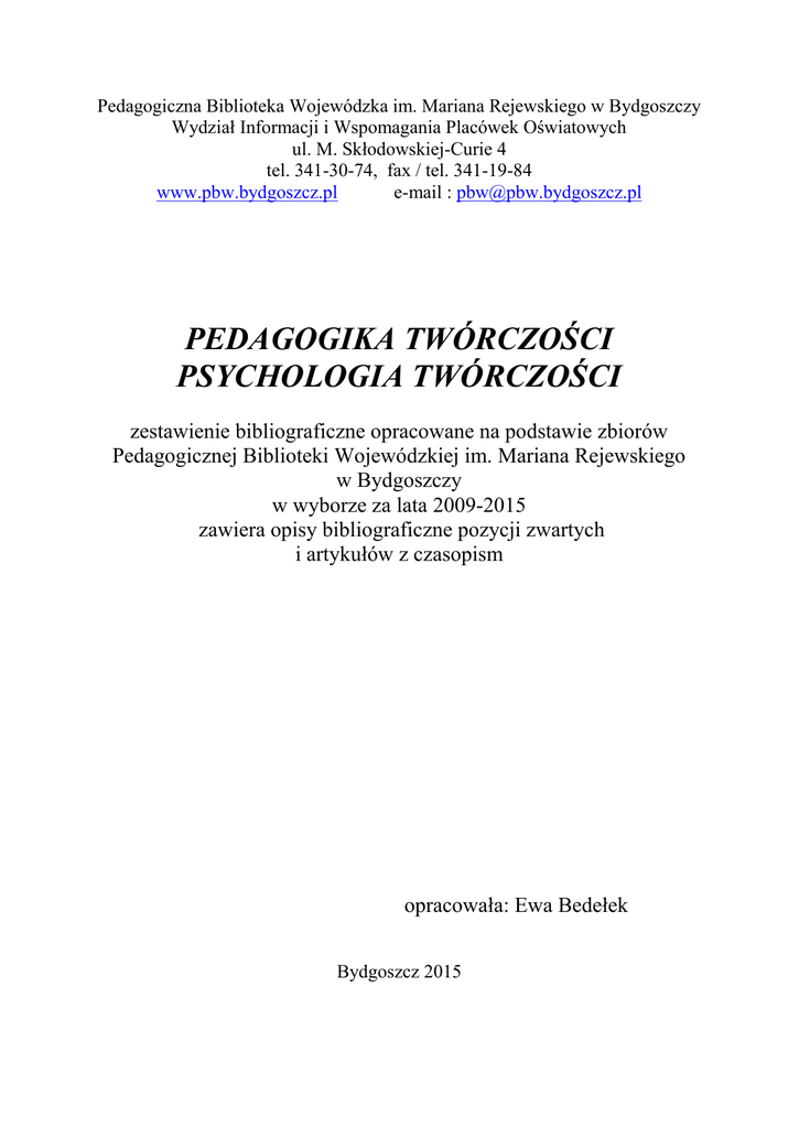 Pedagogiczna Biblioteka Wojewódzka im. Mariana Rejewskiego w Bydgoszczy Wydział Informacji i Wspomagania Placówek Oświatowych ul. M. Skłodowskiej-Curie 4 tel. 341-30-74, fax / tel. 341-19-84 www.pbw.bydgoszcz.pl e-mail : [email protected] PEDAGOGIKA TWÓRCZOŚCI PSYCHOLOGIA TWÓRCZOŚCI zestawienie bibliograficzne opracowane na podstawie zbiorów Pedagogicznej Biblioteki Wojewódzkiej im. Mariana Rejewskiego w Bydgoszczy w wyborze za lata 2009-2015 zawiera opisy bibliograficzne pozycji zwartych i artykułów z czasopism opracowała: Ewa Bedełek Bydgoszcz 2015 1. ABC kreatywności / Krzysztof J. Szmidt. - Warszawa : Difin, 2010. - 246, [1] s. - (Engram) sygnatura 156936, 156937 p Zawiera rozdziały: A jak asocjacje. B jak bariery. C jak cierpliwość. D jak dywergencyjność. E jak elaboracja. F jak fiksacje. G jak grupa. H jak heurystyki. I jak inkubacja – iluminacja. J jak jakość (wartość) wytworu. K jak krytyka. L jak lateralne myślenie. M jak metaforyzowanie. N jak niecierpliwe dążenie do wyniku. O jak oryginalność. P jak płynność myślenia. R jak rozwój kreatywności. S jak stymulatory. T jak talent. U jak uczenie się kreatywności. W jak wyobraźnia. Z jak zdziwienie. Ż jak życie twórcze. 2. Aktywność twórcza a pracoholizm : jak utrzymać kapitał kreatywności pracowników? / Anna Lipka, Stanisław Waszczak, Alicja Winnicka-Wejs. Warszawa : Difin, 2013. - 212 s. sygnatura 156087 Zawiera rozdziały: Interpretacje twórczości przez pryzmat pracoholizmu. Cechy aktywności twórczej w objaśnieniach etiologicznych pracoholizmu. Zastosowanie analizy danych biograficznych do badania przebiegu twórczości w aspekcie pracoholizmu. Wypowiedzi twórców jako źródło informacji o ich pracoholizmie. Pracoholizm i aktywność twórcza jako przedmiot zainteresowania zarzadzania kapitałem ludzkim. 3. Efektywne i atrakcyjne metody pracy z dziećmi / Mariola Jąder. - Wyd. 3. Kraków : Oficyna Wydawnicza Impuls, 2013. - 131 s. sygnatura 156768p, 156769 Zawiera rozdziały: Efektywność – warunki efektywnego uczenia się. Efektywne metody pracy z dziećmi. Techniki pracy jako narzędzia efektywnych działań z dziećmi. Efektywne formy organizacyjne w pracy z dziećmi. 4. Jak kreatywnie wspierać rozwój dziecka? : wspólne gry i twórcze zabawy, dzięki którym rozwiniesz jego zdolności / Natalia Minge, Krzysztof Minge. - Warszawa : Edgard, 2011. - 219 s. (Samo Sedno) sygnatura 157244 – 157245 Zawiera rozdziały: Po co wspomagać rozwój intelektualny niemowlaka i małego dziecka? Rozwój zmysłów. Aktywność fizyczna. Rozwijamy mózg dziecka, czyli… sprawiamy jemu i sobie przyjemność. Mowa i głośne czytanie dziecku. Nauka czytania. Matematyka. Wiedza. Języki obce. Wychodzimy z domu. Rozwój pamięci i wspomnienia. Koncentracja. Emocje. Zagrożenia dla rozwoju małego dziecka. 5. Nauczyciel-uczeń : w poszukiwaniu kreatywności w szkole / Aldona Małyska ; Uniwersytet Warmińsko-Mazurski w Olsztynie. Centrum Badań Społecznych. - Olsztyn : Uniwersytet Warmińsko-Mazurski. Centrum Badań Europy Wschodniej, 2010. - 183 s. sygnatura 153864 Zawiera rozdziały: Twórczość jako przedmiot zainteresowań pedagogiki. Szkolne stymulatory/inhibitory aktywności twórczej. Podstawowe założenia metodologiczne badań własnych. Postawa pedagogiczna badanych nauczycieli. Aktywność (kulturowo)twórcza badanych nauczycieli. Obraz idealnego ucznia – preferencje badanych nauczycieli. Poziom zachowań twórczych i odtwórczych badanych uczniów. Postawa pedagogiczna i twórcze działania nauczyciela w opinii badanych uczniów. 6. Nikifory - artyści niepełnosprawni w życiu społecznym i zawodowym : materiały pokonferencyjne. Cz. 1 / pod red. Barbary Sochal. - Warszawa : Fundacja Wspólna Droga - United Way Polska, 2009. - 208 s. sygnatura 151760 Zawiera rozdziały: Artysta z niepełnosprawnością w przestrzeni społecznej i w sztuce. Twórczość osób z niepełnosprawnością w edukacji i w arteterapii. Miedzy teoria a praktyką. Opisy i scenariusze warsztatów przeprowadzonych w ramach konferencji. Targi Warsztatów Terapii Zajęciowej. Ewaluacja konferencji. 7. Pedagogika twórczości / Krzysztof J. Szmidt. - Wyd. 2 poszerz. - Sopot : Gdańskie Wydawnictwo Psychologiczne, 2013. - 734 s. sygnatura 156126, 157389, 156125 p Zawiera rozdziały: Cele i dziedziny pedagogiki twórczości. Pojęcie twórczości – jego dzieje i aspekty. Teorie twórczości. Twórczość dzieci i młodzieży. Wychowanie do twórczości. Rodzina a rozwój twórczości dzieci. Środowisko społeczno-kulturowe a twórczość. Zasady i metody dydaktyki twórczości. Wybrane programy wychowania do twórczości. Metody badań pedagogiki twórczości. 8. Psychologia twórczości / Edward Nęcka. - Wyd. 2. - Gdańsk : Gdańskie Wydawnictwo Psychologiczne, 2012. - 269 s. sygnatura 156617 - 156618 Zawiera rozdziały: Pojęcia i kryteria twórczości. Struktura procesu twórczego. Poznawcze składniki procesu twórczego. Emocje i motywacje w twórczości. Wgląd. Indywidualne cechy twórców. Społeczny kontekst twórczości. Systemowe koncepcje twórczości. Stosowana psychologia twórczości. Próba syntezy. 9. Psychologia twórczości plastycznej / Stanisław Leon Popek. - Kraków : Oficyna Wydawnicza "Impuls", 2010. - 489 s. sygnatura 154869, 154480 p Zawiera : Cz. I: Teoretyczne podstawy mechanizmów twórczości plastycznej. Rozdziały: Plastyka jako dziedzina twórczości. Osobowościowe uwarunkowania twórczości plastycznej. Cz. II: Rozwój twórczości plastycznej dzieci i młodzieży. Rozdziały Rys historyczny badań nad twórczością plastyczną dzieci i młodzieży. Plastyka dzieci młodzieży jako twórczość artystyczna. Okresy i fazy w twórczości plastycznej dzieci i młodzieży. Dotychczasowe metody analizy wytworów plastycznych. Problemy, hipotezy i metody własnych badań. Psychologiczna analiza i charakterystyka formy i treści wypowiedzi plastycznych dzieci i młod