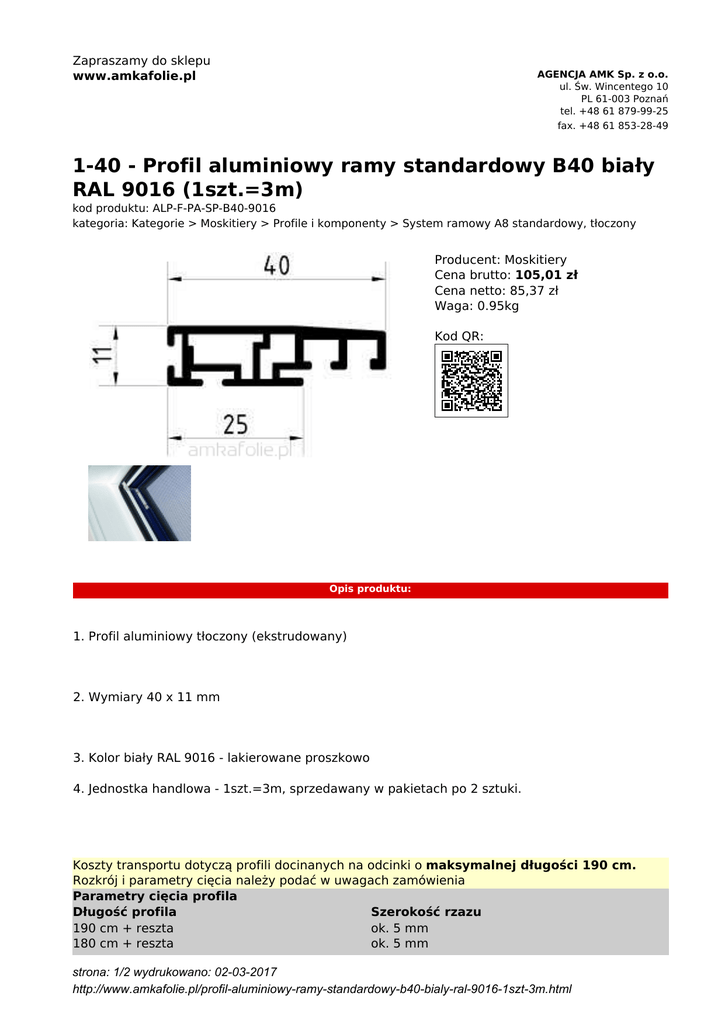 Zapraszamy do sklepu www.amkafolie.pl AGENCJA AMK Sp. z o.o. ul. Św. Wincentego 10 PL 61-003 Poznań tel. +48 61 879-99-25 fax. +48 61 853-28-49 1-40 - Profil aluminiowy ramy standardowy B40 biały RAL 9016 (1szt.=3m) kod produktu: ALP-F-PA-SP-B40-9016 kategoria: Kategorie > Moskitiery > Profile i komponenty > System ramowy A8 standardowy, tłoczony Producent: Moskitiery Cena brutto: 105,01 zł Cena netto: 85,37 zł Waga: 0.95kg Kod QR: Opis produktu: 1. Profil aluminiowy tłoczony (ekstrudowany) 2. Wymiary 40 x 11 mm 3. Kolor biały RAL 9016 - lakierowane proszkowo 4. Jednostka handlowa - 1szt.=3m, sprzedawany w pakietach po 2 sztuki. Koszty transportu dotyczą profili docinanych na odcinki o maksymalnej długości 190 cm. Rozkrój i parametry cięcia należy podać w uwagach zamówienia Parametry cięcia profila Długość profila Szerokość rzazu 190 cm + reszta ok. 5 mm 180 cm + reszta ok. 5 mm strona: 1/2 wydrukowano: 02-03-2017 http://www.amkafolie.pl/profil-aluminiowy-ramy-standardowy-b40-bialy-ral-9016-1szt-3m.html 170 cm + reszta ok. 5 mm 160 cm + reszta ok. 5 mm 150 cm + reszta ok. 5 mm Jeżeli jesteś zainteresowany dostawą profili w całych odcinkach skontaktuj się z obsługą sklepu amkafolie.pl w celu wyceny kosztów transportu dla dłużyc. GODZINY OTWARCIA: T: +48 61 879 99 25 w dniach od poniedziałku do piątku F: +48 61 853 28 49 w godzinach od 8:00 do 16:00 e-mail: [email protected] Przygotujemy ofertę i wycenimy transport indywidualnie strona: 2/2 wydrukowano: 02-03-2017 http://www.amkafolie.pl/profil-aluminiowy-ramy-standardowy-b40-bialy-ral-9016-1szt-3m.html