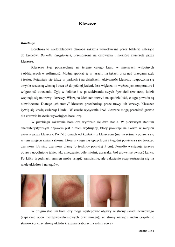 Kleszcze Borelioza Borelioza to wieloukładowa choroba zakaźna wywoływana przez bakterie należące do krętków: Borrelia burgdorferi, przenoszona na człowieka i niektóre zwierzęta przez kleszcze. Kleszcze żyją powszechnie na terenie całego kraju w miejscach wilgotnych i obfitujących w roślinność. Można spotkać je w lasach, na łąkach oraz nad brzegami rzek i jezior. Pojawiają się także w parkach i na działkach. Aktywność kleszczy rozpoczyna się zwykle wczesną wiosną i trwa aż do późnej jesieni. Jest większa im wyższa jest temperatura i wilgotność otoczenia. Żyją w ściółce i w poszukiwaniu swych żywicieli (zwierząt, ludzi) wspinają się na trawy i krzewy. Wiszą na źdźbłach trawy i na spodzie liści, z tego powodu są niewidoczne. Dlatego „zbieramy” kleszcze przechodząc przez trawy lub krzewy. Kleszcze żywią się krwią zwierząt i ludzi. W czasie wysysania krwi kleszcze mogą przenieść groźne dla zdrowia bakterie wywołujące boreliozę. W przebiegu zakażenia boreliozą wyróżnia się dwa stadia. W pierwszym stadium charakterystycznym objawem jest rumień wędrujący, który powstaje na skórze w miejscu ukłucia przez kleszcza. Po 7-10 dniach od kontaktu z kleszczem (nie wcześniej) pojawia się w tym miejscu zmiana skórna, która w ciągu następnych dni i tygodni powiększa się tworząc czerwoną lub sino czerwoną plamę (o średnicy powyżej 5 cm). Ponadto występują jeszcze objawy uogólnione takie, jak: zmęczenie, bóle mięśni, gorączka, ból głowy, sztywność karku. Po kilku tygodniach rumień może ustąpić samoistnie, ale zakażenie rozprzestrzenia się na wiele układów i narządów. W drugim stadium boreliozy mogą występować objawy ze strony układu nerwowego (zapalenie opon mózgowo-rdzeniowych oraz mózgu); ze strony narządu ruchu (zapalenie stawów) oraz ze strony układu krążenia (zaburzenia rytmu serca). Strona 1 z 4 Jak się chronić przed ukąszeniem przez kleszcza: ― nosić odpowiednią odzież w lesie zakrywającą jak najwięcej części ciała, ― stosować środki odstraszające kleszcze, ― gotować mleko pochodzące od krów, kóz i owiec, ― po wizycie w lesie lub innym miejscu bytowania kleszczy dokładnie obejrzeć całe ciało. Po zauważeniu kleszcza, należy natychmiast delikatnie go usunąć. W tym celu należy pensetą ująć kleszcza tuż przy skórze i pociągnąć ku górze zdecydowanym ruchem. Miejsce ukłucia należy zdezynfekować. Gdyby usunięcie kleszcza sprawiało trudności, należy zwrócić się o pomoc do lekarza. Nie należy smarować kleszcza żadną substancją, aby nie zwiększać ryzyka zakażenia. Stosowanie wymienionych zasad zmniejsza prawdopodobieństwo ukąszenia i zakażenia. Kleszczowe zapalenie mózgu (KZM) Kleszczowe zapalenie mózgu to ostra wirusowa choroba zakaźna przenoszona przez kleszcze. Zachorowania notuje się głównie latem i jesienią, na skutek ukłucia przez zakażonego kleszcza. Wirus KZM atakuje mózg lub rdzeń kręgowy wywołując zapalenie mózgu, opon mózgowo rdzeniowych lub rdzenia kręgowego. Leczenie szpitalne trwa zazwyczaj kilka tygodni. Wielu chorych cierpi na długotrwałe lub trwałe powikłania neurologiczne, takie jak porażenia nerwów lub niedowłady kończyn oraz zmiany psychiczne i emocjonalne, które znacznie pogarszają jakość dalszego życia. U około 1-2% pacjentów choroba kończy się zgonem. Zapobieganie ukąszeniom kleszczy przez stosowanie preparatów odstraszających kleszcze i/lub noszenie specjalnej odzieży ochronnej nie okazały się wystarczająco skuteczne. Najpewniejszym sposobem zabezpieczenia się przed kleszczowym zapaleniem mózgu jest szczepienie ochronne. Kto i kiedy powinien zostać zaszczepiony przeciwko kleszczowemu zapaleniu mózgu? Szczepienie przeciwko kleszczowemu zapaleniu mózgu powinno być wykonywane w określonych grupach: ― pracowników leśnych, ― wojskowych na poligonach, ― turystów (przede wszystkim pieszych), ― kolonistów (dzieci i młodzieży poniżej 18 roku życia stanowiącej ¼ chorujących), ― przebywających na obszarach endemicznych. Strona 2 z 4 W Polsce szczepienia przeciwko kleszczowemu zapaleniu mózgu mają charakter zalecany. Schemat szczepień obejmuje: ― szczepienie podstawowe (pierwsza dawka, po 1-3 miesiącach druga dawka, po 5-12 miesiącach trzecia dawka) ― szczepienie przypominające: pierwsze po 3 latach, następnie co 3-5 lat. Zaszczepienie zimą lub wczesną wiosną zapewnia ochronę już od początku aktywności kleszczy (od kwietnia do października). Przygotowała: Roma Sędecka, Starszy Asystent Oddziału Epidemiologii WSE w Poznaniu Sytuacja epidemiologiczna w zakresie boreliozy województwo wielkopolskie Polska Borelioza liczba zachorowań zapadalność liczba zachorowań zapadalność 2003 190 5,7 3575 9,4 2004 178 5,3 3822 10 2005 212 6,3 4409 11,6 2006 273 8,1 6694 17,5 2007 344 10,2 7731 20,3 2008 264 7,8 8255 21,7 2009 349 10,2 10332 27,1 2010 256 7,5 9005 23,6 2011 183 5,3 9170 23,8 2012 215 6,2 8786 22,8 2013 241 7,0 12760 33,1 2014 311 9 13866 36 Strona 3 z 4 Sytuacja epidemiologiczna w zakresie kleszczowego zapalenia mózgu Kleszczowe województwo wielkopolskie Polska zapalenie mózgu liczba zachorowań zapadalność liczba zachorowań zapadalność 2011 0 0 221 0,57 2012 4 0,12 189 0,49 2013 0 0 227 0,59 2014 2 0,06 196 0,51 Opracowała: Roma Sędecka, Starszy Asystent Oddziału Epidemiologii WSSE w Poznaniu Strona 4 z 4