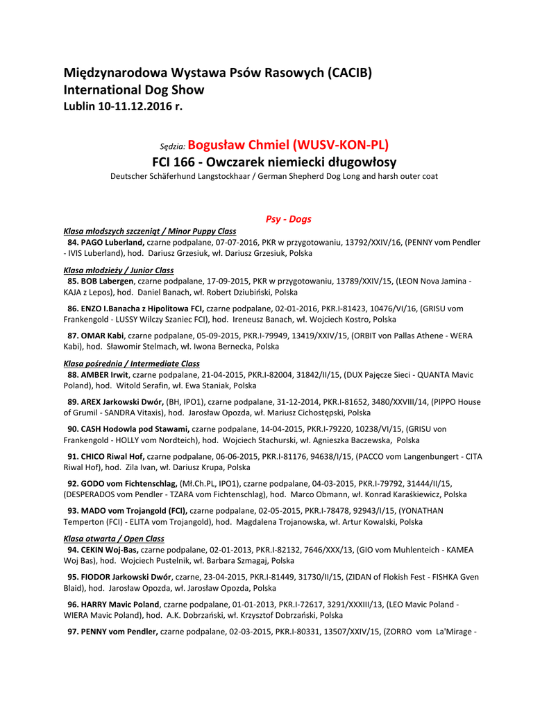 Międzynarodowa Wystawa Psów Rasowych (CACIB) International Dog Show Lublin 10-11.12.2016 r. Bogusław Chmiel (WUSV-KON-PL) FCI 166 - Owczarek niemiecki długowłosy Sędzia: Deutscher Schäferhund Langstockhaar / German Shepherd Dog Long and harsh outer coat Psy - Dogs Klasa młodszych szczeniąt / Minor Puppy Class 84. PAGO Luberland, czarne podpalane, 07-07-2016, PKR w przygotowaniu, 13792/XXIV/16, (PENNY vom Pendler - IVIS Luberland), hod. Dariusz Grzesiuk, wł. Dariusz Grzesiuk, Polska Klasa młodzieży / Junior Class 85. BOB Labergen, czarne podpalane, 17-09-2015, PKR w przygotowaniu, 13789/XXIV/15, (LEON Nova Jamina KAJA z Lepos), hod. Daniel Banach, wł. Robert Dziubiński, Polska 86. ENZO I.Banacha z Hipolitowa FCI, czarne podpalane, 02-01-2016, PKR.I-81423, 10476/VI/16, (GRISU vom Frankengold - LUSSY Wilczy Szaniec FCI), hod. Ireneusz Banach, wł. Wojciech Kostro, Polska 87. OMAR Kabi, czarne podpalane, 05-09-2015, PKR.I-79949, 13419/XXIV/15, (ORBIT von Pallas Athene - WERA Kabi), hod. Sławomir Stelmach, wł. Iwona Bernecka, Polska Klasa pośrednia / Intermediate Class 88. AMBER Irwit, czarne podpalane, 21-04-2015, PKR.I-82004, 31842/II/15, (DUX Pajęcze Sieci - QUANTA Mavic Poland), hod. Witold Serafin, wł. Ewa Staniak, Polska 89. AREX Jarkowski Dwór, (BH, IPO1), czarne podpalane, 31-12-2014, PKR.I-81652, 3480/XXVIII/14, (PIPPO House of Grumil - SANDRA Vitaxis), hod. Jarosław Opozda, wł. Mariusz Cichostępski, Polska 90. CASH Hodowla pod Stawami, czarne podpalane, 14-04-2015, PKR.I-79220, 10238/VI/15, (GRISU von Frankengold - HOLLY vom Nordteich), hod. Wojciech Stachurski, wł. Agnieszka Baczewska, Polska 91. CHICO Riwal Hof, czarne podpalane, 06-06-2015, PKR.I-81176, 94638/I/15, (PACCO vom Langenbungert - CITA Riwal Hof), hod. Zila Ivan, wł. Dariusz Krupa, Polska 92. GODO vom Fichtenschlag, (Mł.Ch.PL, IPO1), czarne podpalane, 04-03-2015, PKR.I-79792, 31444/II/15, (DESPERADOS vom Pendler - TZARA vom Fichtenschlag), hod. Marco Obmann, wł. Konrad Karaśkiewicz, Polska 93. MADO vom Trojangold (FCI), czarne podpalane, 02-05-2015, PKR.I-78478, 92943/I/15, (YONATHAN Temperton (FCI) - ELITA vom Trojangold), hod. Magdalena Trojanowska, wł. Artur Kowalski, Polska Klasa otwarta / Open Class 94. CEKIN Woj-Bas, czarne podpalane, 02-01-2013, PKR.I-82132, 7646/XXX/13, (GIO vom Muhlenteich - KAMEA Woj Bas), hod. Wojciech Pustelnik, wł. Barbara Szmagaj, Polska 95. FIODOR Jarkowski Dwór, czarne, 23-04-2015, PKR.I-81449, 31730/II/15, (ZIDAN of Flokish Fest - FISHKA Gven Blaid), hod. Jarosław Opozda, wł. Jarosław Opozda, Polska 96. HARRY Mavic Poland, czarne podpalane, 01-01-2013, PKR.I-72617, 3291/XXXIII/13, (LEO Mavic Poland WIERA Mavic Poland), hod. A.K. Dobrzański, wł. Krzysztof Dobrzański, Polska 97. PENNY vom Pendler, czarne podpalane, 02-03-2015, PKR.I-80331, 13507/XXIV/15, (ZORRO vom La'Mirage - ZARA vom Pendler), hod. Wolfgang Meinen, wł. Dariusz Grzesiuk, Polska 98. STRUPPI vom Fichtenschlag, czarne podpalane, 07-07-2013, PKR.I-74949, 35888/XXII/13, (ILLIANO vom Fichtenschlag - TZARA vom Fichtenschlag), hod. Marco Osmann, wł. Krzysztof Kowalczyk, Polska 99. SZOGUN Mavic Poland (FCI), czarne podpalane, 07-02-2015, PKR.I-77768, 3476/XXVIII/15, (GRISU vom Frankengold - FRIDDA v. Haus Galli), hod. Adrian Krzysztof Dobrzański, wł. Małgorzata Jokiel, Polska 100. TILL Asarko Lordana, czarne podpalane, 05-04-2015, PKR.I-79715, 3758/XLVIII/15, (LABO vom Schollweiher TANITA Askaro Lordana), hod. G.Okrasa, I. Paradziński, wł. Piotr Kowalczyk, Polska 101. ULK-UNTOX z Piaszczystej Górki, czarne podpalane, 17-01-2015, PKR.I-77347, 15305/XV/15, (GECK z Kojca Elbikame - CRISS-CONTESSA z Piaszczystej Górki), hod. Bogusław Szabat, wł. Katarzyna Michałowska, Polska Klasa użytkowa / Working Class 102. BLACKJACK vom Leirbagland, (IPO-I), czarne podpalane, 15-08-2014, PKR.I-76055, 33214/X/14, (YANNICK vom Butjenter Land - SUNSHINE vom Frankengold), hod. Ewa Justyna Śmigielska, wł. Iwona Demby, Polska 103. FEDON von Babylon, (IPO-I), czarne podpalane, 30-08-2012, PKR.I-78572, 13229/XXIV/12, (PACCO vom Langenbungert - ZAMBI von Babylon), hod. Dieter Grahl, wł. Dariusz Grzesiuk, Polska 104. HUNTER Andomi Poland, (Mł.Ch.PL, IPO-I, IPO2, Kkl1), czarne podpalane, 18-11-2014, PKR.I-76954, 36454/XXII/14, (GRISU vom Frankengold - NIKITA Equus), hod. Dorota Pikulska, wł. Jolanta Klimek, Polska Suki - Bitches Klasa młodszych szczeniąt / Minor Puppy Class 105. ASHLEY Kildeman, czarne podpalane, 29-07-2016, PKR w przygotowaniu, 9499/XIV/16, (PASCHO von Eichenplatz - JASMINE Luberland), hod. Robert Borek, wł. Robert Borek, Polska Klasa szczeniąt / Puppy Class 106. AURA vom Arkanzass, czarne podpalane, 11-04-2016, PKR.I-81970, 13710/XXIV/16, (GRISU vom Frankengold - JUDITH z Lintichu), hod. Angelika Sudowska, wł. Aldona Głowniak, Polska Klasa młodzieży / Junior Class 107. ALASKA Wolf Lake, czarne podpalane, 25-09-2015, PKR.I-81049, 10432/VI/15, (COLLORADO Jarkowski Dwór GIZELLA vom Haus Tchorz), hod. Alicja Żak, wł. Stanisław Ciborowski, Polska 108. ALISA Zdziko, czarne podpalane, 12-09-2015, PKR.I-79397, 13331/XXIV/15, (ABARIS Mar-Jul - QUANDA), hod. Zdzisław Kolbus, wł. Rafał Hubala, Polska 109. BLANKA U Ciborowskich, czarne podpalane, 12-09-2015, PKR w przygotowaniu, 10364/VI/15, (COLLORADO Jarkowski Dwór - BAJKA z Krainy Tura), hod. Stanisław Ciborowski, wł. Stanisław Ciborowski, Polska 110. BRI de Tierratoni, czarne podpalane, 19-06-2015, PKR.I-79022, 1928/XXXIX/15, (PEDRO vom Langenbungert ESPRIT von Tronje), hod. Cezary Kubicki, wł. Aleksandra Dębska-Dudek, Polska 111. DRAENEI vom Leirbagland, czarne podpalane, 02-09-2015, PKR.I-79742, 93523/I/15, (COLLORADO Jarkowski Dwór - SUNSHINE vom Frankengold), hod. Ewa Śmigielska, wł. Ewa Śmigielska, Iwona Demby, Polska 112. ELLIS Danaos, czarne podpalane, 20-07-2015, PKR w przygotowaniu, 10589/VI/15, (COLLORADO Jarkowski Dwór - FIANA dlha Roven), hod. Alicja Żak, wł. Alicja Żak, Elżbieta Żak, Polska 113. GE