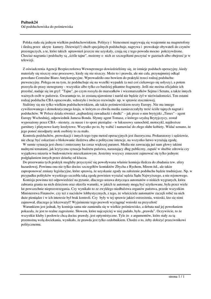 Pultusk24 Od podsłuchowiska do pośmiewiska Polska stała się jednym wielkim podsłuchowiskiem. Politycy i biznesmeni nagrywają się wzajemnie na magnetofony i śledzą przez ukryte kamery. Dziewięć(!) służb specjalnych podsłuchuje, nagrywa i prowokuje obywateli do czynów przestępczych, a te, które takich uprawnień jeszcze nie uzyskały, czują się z tego powodu mocno pokrzywdzone. Chociaż nagrania i podsłuchy są „ściśle tajne”, możemy o nich ze szczegółami poczytać w gazetach albo obejrzeć je w telewizji. Z oświadczenia Agencji Bezpieczeństwa Wewnętrznego dowiedzieliśmy się, że istnieje podsłuch operacyjny, kiedy materiały się niszczy oraz procesowy, kiedy się nie niszczy. Może to i prawda, ale nie cała, przynajmniej odkąd powołano Centralne Biuro Antykorupcyjne. Wprowadziło ono bowiem do praktyki trzeci rodzaj podsłuchu: prewencyjny. Polega on na tym, że podsłuchuje się na wszelki wypadek (a nuż coś ciekawego się usłyszy), a potem przesyła do prasy stenogramy - wszystkie albo tylko co bardziej pikantne fragmenty. Jeśli nie można oficjalnie ich przesłać, nadaje się im gryf: "Tajne", po czym rozsyła do marszałków i wicemarszałków Sejmu i Senatu, a także innych ważnych osób w państwie. Gwarantuje to, że zostaną ujawnione i naród nie będzie żył w nieświadomości. Ten ostatni rodzaj podsłuchu CBA opracowało, wdrożyło i twórczo rozwinęło np. w sprawie stoczniowej. Staliśmy się nie tylko wielkim podsłuchowiskiem, ale także pośmiewiskiem reszty Europy. Nie ma innego cywilizowanego i demokratycznego kraju, w którym co chwila media zamieszczałyby treść ściśle tajnych nagrań i podsłuchów. W Polsce działa również „najbardziej zawadiacki i słodki” – jak pisze o nim brytyjski „Times” - agent Europy Wschodniej, odpowiednik Jamesa Bonda. Słynny agent Tomasz, z którego szydzą Brytyjczycy, został wyposażony przez CBA - niestety, za nasze i to spore pieniądze - w luksusowy samochód, motocykl, najdroższe garnitury i platynowe karty kredytowe. Wszystko po to, by wabić i namawiać do złego słabe kobiety. Widać uznano, że jego ponoć nieodparty urok osobisty to za mało. Kontrola podsłuchów, prowokacji i innych tego typu metod operacyjnych jest iluzoryczna. Prokuratorzy i sędziowie, nie chcąc być oskarżani o blokowanie śledztwa albo o polityczne intencje, na wszystko łatwo wyrażają zgodę. W sumie sytuacja jest chora i zmierzamy ku coraz większej paranoi. Media nie zawracają już nam głowy takimi nudnymi tematami, jak krytyczna sytuacja budżetu państwa, narastający dług publiczny, zapaść w służbie zdrowia czy wyjątkowa mizeria w budownictwie mieszkaniowym. Jesteśmy wszyscy zmuszeni zajmować się tylko jednym: podglądaniem innych przez dziurkę od klucza. Do przerwania tych praktyk mogłaby przyczynić się powoływana właśnie komisja śledcza do zbadania tzw. afery hazardowej. Powinna ona nie tylko dociec szczegółów kontaktów Zbycha z Rychem, Mirem itd., ale także zaproponować zmiany legislacyjne, które sprawią, że uzyskanie zgody na założenie podsłuchu będzie trudniejsze. Np. w przypadku polityków wysokiego szczebla taką zgodę powinien wyrażać sędzia Sądu Najwyższego, a nie rejonowego. Komisja powinna też odpowiedzieć na pytanie, dlaczego ustawa dotycząca automatów o niskich wygranych, która zabrania grania na nich dzieciom oraz określa warunki, w jakich te automaty mogą być użytkowane, była przez wiele lat powszechnie nieprzestrzegania. Czy wynikało to ze zwykłego niedbalstwa organów państwa, przede wszystkim Ministerstwa Finansów, czy też z nacisków lobbystycznych, z tego, że właściciele automatów zaczęli robić na nich duże pieniądze i w ich interesie był brak kontroli. Czy były w tej sprawie jakieś ostrzeżenia, wnioski, kto się nimi zajmował, dlaczego je lekceważył? Wyjaśnienie tego pozwoli wyciągnąć wnioski na przyszłość Warunkiem jest jednak, by komisja sama nie zamieniła się w wielkie pośmiewisko, a debata nad jej powołaniem pokazała, że jest to realne zagrożenie. Słowem, które najczęściej w niej padało, była „prawda”. Oczywiście, to że wszystkie kluby i posłowie chcą dociec prawdy, jest optymistyczne. Tyle że z argumentów, które stały za tą przemożną wolą dociekania, wynikało, że prawda jest tylko ozdobnikiem. Chodzi o to, żeby dołożyć przeciwnikowi politycznemu. strona 1 / 1
