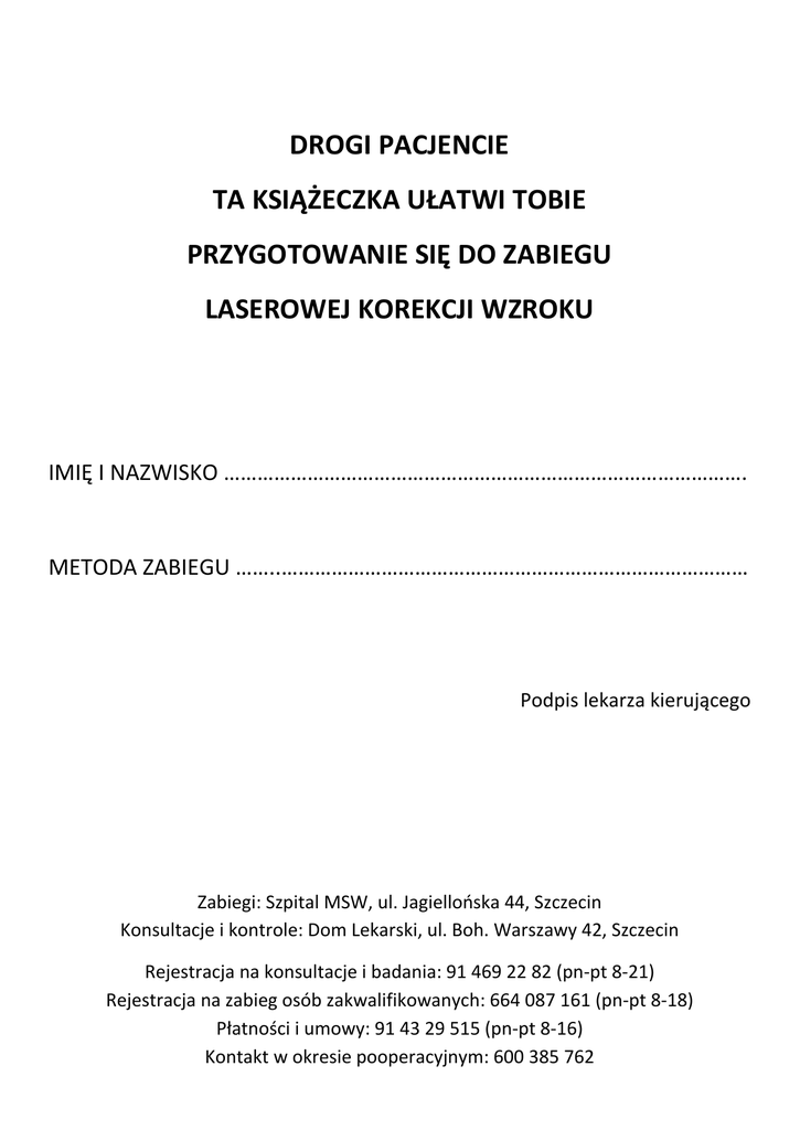 DROGI PACJENCIE TA KSIĄŻECZKA UŁATWI TOBIE PRZYGOTOWANIE SIĘ DO ZABIEGU LASEROWEJ KOREKCJI WZROKU IMIĘ I NAZWISKO …………………………………………………………………………………. METODA ZABIEGU ……..………………………………………………………………………… Podpis lekarza kierującego Zabiegi: Szpital MSW, ul. Jagiellońska 44, Szczecin Konsultacje i kontrole: Dom Lekarski, ul. Boh. Warszawy 42, Szczecin Rejestracja na konsultacje i badania: 91 469 22 82 (pn-pt 8-21) Rejestracja na zabieg osób zakwalifikowanych: 664 087 161 (pn-pt 8-18) Płatności i umowy: 91 43 29 515 (pn-pt 8-16) Kontakt w okresie pooperacyjnym: 600 385 762 Jeżeli zostanie Pan/Pani zakwalifikowany/a do zabiegu laserowej korekcji wzroku prosimy o postępowanie wg następujących kroków: Krok 1 – Termin zabiegu lub konsultacji Pod nr tel. 664 087 161 pracownik Domu Lekarskiego ustali z Państwem termin zabiegu oraz udzieli informacji. Telefon czynny pon. – pt. 8:00 – 18:00. Krok 2 – Podpisanie umowy i płatność za zabieg Przed zabiegiem należy podpisać umowę oraz wpłacić pełną kwotę za zabieg. Można to zrobić w budynku administracji szpitala MSW przy ul. Jagiellońskiej 44 w Szczecinie (jasnoróżowy parterowy budynek idąc prosto od głównego wejścia, po lewej stronie). Umowę należy podpisać w dziale marketingu, płatność dokonać w kasie (gotówką lub kartą). Osoby spoza Szczecina mogą wpłacić uzgodnioną kwotę za zabieg na konto szpitala MSW: BGK 32 1130 1176 0022 2137 2520 0006, a umowę podpisać w dniu zabiegu, przed zabiegiem (nie dotyczy okresów promocji). Przy podpisaniu umowy proszę mieć ze sobą niniejszą książeczkę z wpisaną metodą zabiegu. Szczegóły: administracja szpitala MSW - nr tel. 91 43 29 515 (pon. – pt. 8:00 – 16:00). Krok 3 – Organizacja w dniu zabiegu Zabiegi odbywają się na Oddziale Okulistycznym w szpitalu MSW przy ul. Jagiellońskiej 44 w Szczecinie. Po wejściu na teren szpitala proszę kierować się w lewo. Oddział Okulistyczny znajduje się nad Izbą Przyjęć na I piętrze. Proszę dzwonić domofonem, by wejść na oddział. Należy mieć ze sobą potwierdzenie płatności. Jeżeli umowa na zabieg nie została podpisana wcześniej, należy udać się do budynku administracji (opis punkt wyżej). Zalecenia medyczne znajdują się na kolejnych stronach książeczki. Krok 4 – Kontrole po zabiegu Kontrole odbywają się w Domu Lekarskim w Galerii Handlowej Turzyn, tam gdzie kwalifikacja do zabiegu. Pierwsza kontrola jest na następny dzień po zabiegu, kolejna po 5 lub 7 dniach. Kontrole umawia lekarz operujący po zabiegu. Poniżej przedstawiamy ogólne zalecenia przed, w dniu, jak i po zabiegu. Proszę pamiętać, że jedynie ścisłe przestrzeganie zaleceń gwarantuje Państwa bezpieczeństwo podczas zabiegu oraz zadowalające efekty operacyjne! O czym trzeba pamiętać przed zabiegiem? Prosimy nie zakładać miękkich soczewek kontaktowych przez 2-3 tygodnie przed zabiegiem, a twardych - 4 tygodnie przed zabiegiem. Długo noszone szkła kontaktowe mogą czasowo zmienić kształt rogówki. Przerwa w noszeniu pozwala rogówce wrócić do naturalnego kształtu. Stale stosowane leki prosimy zażywać zgodnie z zaleceniami lekarza prowadzącego. Jeśli stosujesz doustne środki antykoncepcyjne, nie odstawiaj ich w okresie 3 miesięcy przed i po zabiegu. Przełóż termin zabiegu, jeśli jesteś chory, masz opryszczkę lub menstruację. 48h przed zabiegiem nie wolno pić alkoholu, kawy czy innych napojów z kofeiną. Wpływa to na uwodnienie rogówki, a w rezultacie na efekt pooperacyjny. Zaplanuj minimum tygodniową przerwę w pracy po zabiegu. Jeżeli pracujesz fizycznie, w trudnych warunkach, w klimatyzowanym pomieszczeniu lub 8h dziennie przed komputerem, zalecamy dłuższą przerwę w pracy. Na prośbę, lekarz może wystawić zwolnienie L4. O czym trzeba pamiętać w dniu zabiegu? Zaplanuj środek transportu i opiekę (nie można po zabiegu prowadzić samochodu). Zabierz ze sobą okulary przeciwsłoneczne z filtrem UV (Twoje oczy po zabiegu będą niezmiernie wrażliwe na światło). Nie wykonuj makijażu. Dokładnie umyj głowę, twarz i oczy, nie używaj żadnych perfum ani dezodorantów. Ubierz się wygodnie. Zalecamy zaopatrzenie się w środki przeciwbólowe. Przebieg zabiegu Po przybyciu na oddział obejrzy Cię lekarz operujący. Jeżeli nie zdecyduje o powtórzeniu któregoś z badań, zostaniesz odpowiednio ubrany oraz zaprowadzony na salę zabiegową. Tam poproszony zostaniesz o położenie się na specjalnie zaprojektowanym stole/łóżku operacyjnym. Pielęgniarka przygotuje oko do zabiegu: przemyje skórę środkiem dezynfekującym oraz wpuści krople znieczulające. Następnie lekarz zabezpieczy oko przed zamknięciem, zakładając specjalną rozwórkę. Możesz odczuwać niewielki dyskomfort. Ramię lasera zostanie przesunięte dokładnie nad Twoje oko. Lekarz poprosi Cię o skupienie na krótką chwilę wzroku na światełku, podczas gdy laser wysyła impulsy światła, które bezboleśnie kształtują rogówkę. Cały zabieg trwa parę minut, a sama praca lasera jedynie kilkadziesiąt sekund. Ważne jest byś podczas zabiegu był zrelaksowany i dobrze współpracował z lekarzem. Jeżeli lekarz nie stwierdzi żadnych przeciwwskazań, godzinę po zabiegu będziesz mógł zostać wypisany do domu. O czym trzeba pamiętać po zabiegu? W pierwszej dobie po zabiegu z reguły występują różnego typu dolegliwości subiektywne, takie jak: zaczerwienienie oczu, łzawienie, uczucie ciała obcego pod powiekami, czy nadwrażliwość na światło. Nasilenie dolegliwości zależy m.in. od indywidualnych predyspozycji pacjenta, ale u niektórych pacjentów czasem niezbędne jest zastosowanie środka przeciwbólowego. Rogówka jest zabezpieczona soczewką nagałkową, lekarz zdejmuje ją po około 5 dobach od operacji - wtedy gdy rogówka pokryta jest już w całoś