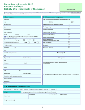 Formularz zgłoszenia 2015 Kursy dla dorosłych Szkoły DiD ▪ Niemiecki w Niemczech Pieczątka szkoły Przed wypełnieniem formularza, prosimy o zapoznanie się z naszymi “Warunkami uczestnictwa”. Prosimy o wyraźne wypełnienie formularza WIELKIMI LITERAMI. Formularz należy przesłać pocztą lub elektronicznie. 1. Dane osobowe 2. Zakwaterowanie i wyżywienie Nazwisko Czy wybierasz zakwaterowanie oferowane przez DID Tak Imię Nie Język ojczysty Zakwaterowanie na kwaterze prywatnej Języki obce Pokój prywatny Obywatelstwo Studio/Apartament Data urodzenia Hotel (wyższy standard) Dzień Miesiąc Rok Hotel (niskobudżetowy) UWAGA: Słuchacz musi mieć ukończone przynajmniej 17 lat w dniu rozpoczęcia kursu! Pokój jednoosobowy Płeć Pokój dwuosobowy Mężczyzna Kobieta Tak Czy jesteś na coś uczulony/a? rezerwacja jednoczesna dla 2 osób Nie Bez wyżywienia Podaj szczegóły: śniadania Niepalący śniadania i kolacje Ulica Adres do korespondencji Data przyjazdu Ulica Miejscowość Kod pocztowy Data wyjazdu Kraj Tel. kom. Inne uwagi dotyczące wyboru zakwaterowania i wyżywienia: Email Nazwa NIP Kraj Miejscowość Kod pocztowy Prosimy o wpisanie poniżej adresu zakwaterowania w Niemczech: Kontakt w razie nagłego wypadku Imię i nazwisko Nr telefonu E-mail 3. Jak dowiedziałeś/aś się o szkołach DiD? Szkoła Bell w Polsce Szkoła Adler w Polsce 4. Kurs Nauczyciel Znajomi Reklama w prasie Strona www Inaczej, jak? Prosimy o uzupełnienie informacji o wybranym kursie (kursach) Termin przyjazdu Lokalizacja Nazwa kursu Uwagi, inne informacje 1 Liczba tygodni 5. Poziom znajomości języka niemieckiego A1 A2 B1 B2 6. Ubezpieczenie DiD C1 Jak długo uczysz się niemieckiego? Składka ubezpieczeniowa nie podlega zwrotowi. O warunki ubezpieczenia pytaj w szkole. Proszę zaznaczyć, jeżeli chcesz skorzystać z ubezpieczenia. 7. Transfer z/na lotniska/o Jeżeli chcesz zamówić transfer z/na lotniska/o, prosimy z zaznaczenie kwadratu oraz podanie poniżej lotniska i terminu: 8. Kosztorys 9. Płatność Czesne za tydzień ____€ x __ tygodni = ______€ + Koszt zakwaterowania za tydzień ____€ x __ tygodni = ______€ + Lekcje indywidualne (opcja) ____€ x __ tygodni = ______€+ Składka ubezpieczeniowa (opcja) Transfer z/na lotniska/o (opcja) Razem Wpłacam 1000 zł - depozyt rejestracyjny. Resztę wpłacę na 6 tygodni przed rozpoczęciem kursu. Koszt kursu przeliczany jest według kursu sprzedaży EUR BNP Paribas Bank Polska SA w dniu dokonywania opłaty. ______€ + Za kurs mogą Państwo zapłacić w jednej ze szkół Bell: w Bydgoszczy, Gdańsku, Gdyni, Szczecinie lub przelewem na konto: ______€ + Business Education & Language Training sp. z o.o. 27 1600 1462 1849 3383 9000 0001 W tytule wpłaty prosimy podać: nazwisko uczestnika oraz lokalizację kursu. ________€ 10. Autoryzacja Oświadczam, że po zapoznaniu się z treścią oferty akceptuję warunki uczestnictwa w kursie językowym (str. 3). Niniejszym wyrażam również zgodę na wprowadzenie do bazy danych i przetwarzanie moich danych osobowych wyłącznie w celu obsługi administracyjnej i dydaktycznej kursu przez Belt sp. z o.o. zgodnie z Ustawą z dn. 29.08.1997 O ochronie danych osobowych, Dz. U. nr 133 poz. 883. W przypadku osób niepełnoletnich, wymagany jest podpis rodzica lub opiekuna. Podpis Data Jeżeli chcesz otrzymywać materiały informacyjne, prosimy o zaznaczenie kwadratu: BELT Gdańsk ul. Targ Drzewny 3/7, 80-886 Gdańsk ▪ [email protected] BELT Gdynia ul. Władysława IV 53/10, 81-384 Gdynia ▪ [email protected] BELT Szczecin al. Wojska Polskiego 42, 70-475 Szczecin ▪ [email protected] 2 Dzień Miesiąc Rok