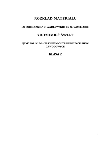 ROZKŁAD MATERIAŁU DO PODRĘCZNIKA U. SZYDŁOWSKIEJ I E. NOWOSIELSKIEJ ZROZUMIEĆ ŚWIAT JĘZYK POLSKI DLA TRZYLETNICH ZASADNICZYCH SZKÓŁ ZAWODOWYCH KLASA 2 1 Koncepcja podręcznika Zrozumieć świat dla klasy II Podręcznik Zrozumieć świat dla klasy II zasadniczej szkoły zawodowej jest kontynuacją założeń przyjętych przez autorki w klasie I. Założenia te wynikają przede wszystkim z nowej podstawy programowej i z programu Zrozumieć świat. Po zetknięciu się przez młodzież w klasie I z niezwykle ważnymi problemami oraz rozważaniami dotyczącymi dziwności świata i różnych postaw wobec życia, w klasie II uczniowie rozstrzygać będą istotne zagadnienia egzystencjalne. Pierwszy rozdział, pod pięknie brzmiącym tytułem, Kocham cię życie zapowiada szereg sytuacji lekcyjnych prowokujących do dyskusji na tematy codzienne, które zajmują niesłychanie ważne miejsce w życiu ludzkim. Staranny dobór tekstów kultury gwarantuje zainteresowanie uczniów, a tym samym osiąganie zamierzonych efektów dydaktycznowychowawczych. Duże nadzieje pokładają autorki w tekstach kultury, składających się na rozdział II. Zawiera on rozważania dotyczące niezwykle ważnego problemu życiowego. Uczniowie stają przed pytaniem Być czy mieć? Zgodnie z koncepcją każdy rozdział inspirowany jest tekstem muzycznym. Kolejne rozdziały podręcznika składają się na ważne treści kształcenia polonistycznego. Uwrażliwiają uczniów na to, co dzieje się wokół nich, w świecie nie zawsze przez nich pod tym kątem postrzeganym i docenianym. Uczyć mają się przede wszystkim empatii, szacunku do siebie i do innych. Rozdział III, Historie warte poznania, w sposób ciekawy wprowadza uczniów w świat twórców, marzycieli, ludzi z pasją. Znajdują się tam pozytywne przykłady na to, że każdy ma szansę odnieść w życiu sukces. Każdy ma prawo i może realizować swoje marzenia! Podręcznik Zrozumieć świat, zarówno w klasie pierwszej, jak i w drugiej, pomaga uczniom ten świat zrozumieć, określić świat wartości uniwersalnych i zinterpretować je jako własne. Ma również służyć pomocą uczniowi, gdy ten boryka się ze swoimi codziennymi problemami egzystencjalnymi. Proponowany podręcznik dla kl. II jest wartościową propozycją zarówno pod względem dydaktycznym, jak i wychowawczym. Pozwala właściwie motywować uczniów nie tylko do poznawania literatury i rozwijania umiejętności jej analizowania, ale jest także doskonałym przykładem oddziaływania wychowawczego poprzez literaturę, kulturę i sztukę. Młodzi ludzie, korzystający z tego podręcznika, mają szansę pełnego rozwoju, a nauczyciele — doskonałą pomoc w kształtowaniu gustów literackich oraz plastycznych swych uczniów, w rozwijaniu i kształtowaniu ich osobowości. Podręcznik uwzględnia podmiotowość ucznia, motywuje do samodzielnego uczenia się. Cechuje go oryginalność w ujęciu treści programowych, obudowie metodycznej i językowej. Jest nowatorski pod względem dydaktycznym, merytorycznym, wychowawczym oraz językowym. Daje uczniom rzetelną wiedzę o kulturze polskiej i światowej. Przygotuje ucznia do życia we współczesnej Polsce, Europie i świecie. Niezwykle interesujący dobór tekstów literackich i innych tekstów kultury ma zachęcać uczniów do lektury, zaś trafnie dobrane fragmenty motywują niezbyt chętnie czytających uczniów do poznania całego utworu. 2 Dobór tekstów kultury zamieszczonych w podręczniku dla klasy II jest wyrazem szacunku dla młodych ludzi. Uwzględnia ich potrzeby emocjonalne, dotyczy codziennych problemów moralnych. Treści kształcące zbliżają odbiorcę do sytuacji rodzinnych i zawodowych, z którymi uczeń spotyka się codziennie. Głównym zadaniem IV rozdziału, Wyrazić słowem, jest doskonalenie umiejętności skutecznego, celowego i funkcjonalnego posługiwania się językiem w mowie i piśmie. Podręcznik w pełni pozwala na realizację treści zawartych w podstawie programowej kształcenia ogólnego dla szkół zawodowych oraz w programie nauczania języka polskiego w zasadniczej szkole zawodowej autorstwa Jadwigi Pakulskiej. Rozdział ten jest ściśle zintegrowany z treściami do kształcenia literackiego i kulturowego. Podobnie, jak w klasie I dużo uwagi poświęca się zagadnieniom kultury języka w zawodzie. Treści zawarte, zarówno w klasie I, jak i w klasie II umożliwiają uczniom zdobycie takiej wiedzy i umiejętności, które pozwalają na kontynuowanie nauki w liceum i uzyskanie świadectwa dojrzałości. 3 Rozkład materiału do podręcznika Zrozumieć świat dla kl. 2 zasadniczej szkoły zawodowej Tematyka Materiał Organizacja roku, poznanie podręcznika Kochać życie — w słowach, muzyce i grafice Marzenia i pasje — sposób na afirmację życia Przepis na życie Kingi Baranowskiej Cele Uczeń: - świadomie uczestniczy w wyborze lektur - poznaje pakiet podręczników - zna tematykę tekstów kultury w kl. II Uczeń: - wypowiada się na temat rozkładówki, tekstów kultury do rozdziału - poznaje utwór Wojciecha Młynarskiego Kocham cię życie (wersja wokalna Edyta Gepert) Uczeń: - poznaje ludzi z pasją życia - poznaje postać himalaistki Kingi Baranowskiej Wiedza i umiejętności Uczeń: - zna wymagania programowe - sporządza opis bibliograficzny książek i czasopism - omawia budowę podręcznika - dzieli się opinią i wrażeniami Uczeń: - wyjaśnia pojęcie kolażu, teksty kultury - wypowiada się na temat tekstu Wojciecha Młynarskiego - interpretuje słowa tekstu - wyjaśnia metafory Uczeń: - czyta ze zrozumieniem - ocenia postać - formułuje sądy - redaguje przesłanie Notes nauczyciela Uwagi o realizacji 1 godzina lekcyjna 1 godzina lekcyjna 4 Wisława Szymborska o życiu… Allegro ma non troppo Uczeń: - poznaje utwór noblistki - poznaje lirykę bezpośrednią - poznaje biogram autorki tekstu Uczeń: - czyta ze zrozumieniem - wskazuje środki artystyczne i ocenia ich rol