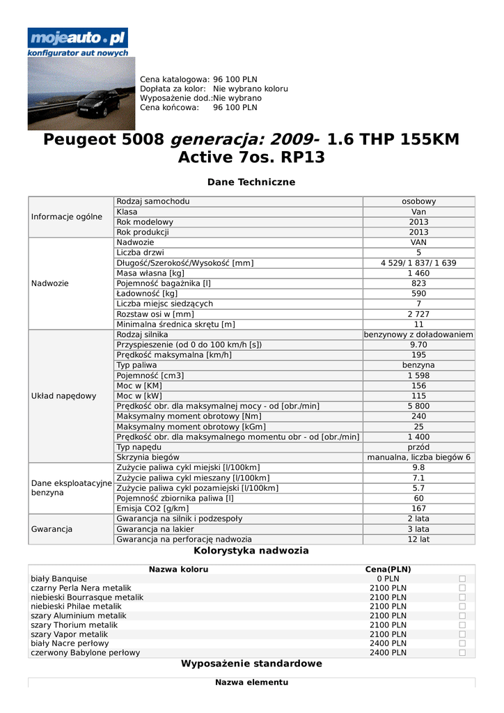 Cena katalogowa: 96 100 PLN Dopłata za kolor: Nie wybrano koloru Wyposażenie dod.:Nie wybrano Cena końcowa: 96 100 PLN Peugeot 5008 generacja: 2009- 1.6 THP 155KM Active 7os. RP13 Dane Techniczne Rodzaj samochodu osobowy Klasa Van Informacje ogólne Rok modelowy 2013 Rok produkcji 2013 Nadwozie VAN Liczba drzwi 5 Długość/Szerokość/Wysokość [mm] 4 529/ 1 837/ 1 639 Masa własna [kg] 1 460 Nadwozie Pojemność bagażnika [l] 823 Ładowność [kg] 590 Liczba miejsc siedzących 7 Rozstaw osi w [mm] 2 727 Minimalna średnica skrętu [m] 11 Rodzaj silnika benzynowy z doładowaniem Przyspieszenie (od 0 do 100 km/h [s]) 9.70 Prędkość maksymalna [km/h] 195 Typ paliwa benzyna Pojemność [cm3] 1 598 Moc w [KM] 156 Układ napędowy Moc w [kW] 115 Prędkość obr. dla maksymalnej mocy - od [obr./min] 5 800 Maksymalny moment obrotowy [Nm] 240 Maksymalny moment obrotowy [kGm] 25 Prędkość obr. dla maksymalnego momentu obr - od [obr./min] 1 400 Typ napędu przód Skrzynia biegów manualna, liczba biegów 6 Zużycie paliwa cykl miejski [l/100km] 9.8 Zużycie paliwa cykl mieszany [l/100km] 7.1 Dane eksploatacyjne Zużycie paliwa cykl pozamiejski [l/100km] 5.7 benzyna Pojemność zbiornika paliwa [l] 60 Emisja CO2 [g/km] 167 Gwarancja na silnik i podzespoły 2 lata Gwarancja Gwarancja na lakier 3 lata Gwarancja na perforację nadwozia 12 lat Kolorystyka nadwozia Nazwa koloru Cena(PLN) 0 PLN 2100 PLN 2100 PLN 2100 PLN 2100 PLN 2100 PLN 2100 PLN 2400 PLN 2400 PLN biały Banquise czarny Perla Nera metalik niebieski Bourrasque metalik niebieski Philae metalik szary Aluminium metalik szary Thorium metalik szary Vapor metalik biały Nacre perłowy czerwony Babylone perłowy Wyposażenie standardowe Nazwa elementu 3 mocowania fotelika dziecięcego Isofix w drugim rzędzie siedzeń 6 uchwytów do mocowania bagażu w bagażniku ABS ze wspomaganiem hamowania awaryjnego ASR - system kontroli trakcji automatyczne włączanie świateł do jazdy dziennej boczne listwy ochronne w kolorze nadwozia centralny zamek sterowany pilotem (2 piloty zdalnego sterowania; blokowanie drzwi podczas ruszania) chromowane listwy podokienne deska rozdzielcza z konsolą w kolorze czarnym Nacre dodatkowe lusterko wewnętrzne do obserwacji osób w drugim i trzecim rzędzie siedzeń elektroniczny układ stabilizacji toru jazdy ESP elektrycznie sterowane szyby boczne przednie (sterowanie sekwencyjne z blokadą przycięcia; domykanie okien przy zamykaniu samochodu) elektrycznie sterowane szyby boczne tylne (sterowanie sekwencyjne z blokadą przycięcia; domykanie okien przy zamykaniu samochodu; elektryczna blokada otwarcia tylnych drzwi i okien przez dzieci) felgi aluminiowe 16" Eris i opony 215/55 R16 fotel kierowcy (manualna regulacja wzdłużna fotela; manualna regulacja pochylenia oparcia; manualna regulacja wysokości fotela; składany regulowany podłokietnik po prawej stronie fotela; składany stolik w oparciu fotela; kieszeń na mapę w oparciu fotela) fotel pasażera (manualna regulacja wzdłużna fotela; manualna regulacja pochylenia oparcia; manualna regulacja wysokości fotela; składany regulowany podłokietnik po lewej stronie fotela; składany stolik w oparciu fotela; kieszeń na mapę w oparciu fotela; oparcie fotela pasażera składane do postaci stolika) fotele w drugim rzędzie (trzy niezależne fotele [po złożeniu tworzą płaską podłogę z poziomem bagażnika]; manualna regulacja wzdłużna foteli; manualna regulacja pochylenia oparć; 3 zagłówki z regulacją wysokości) gałka dźwigni zmiany biegów skórzana gniazda 12V (w konsoli środkowej przy dźwigni zmiany biegów; w tylnej części konsoli środkowej poniżej schowka otwartego) gniazdo 12V w bagażniku haczyki (x2) na torby w bocznych ściankach bagażnika hamulec postojowy elektryczny (FSE) z funkcją Hill Assist immobiliser kierownica 3-ramienna skórzana kieszenie w drzwiach bocznych z przodu i z tyłu klamki wewnętrzne chromowane klamki zewnętrzne w kolorze nadwozia klimatyzacja automatyczna dwustrefowa + filtr przeciwpyłkowy z węglem aktywnym komputer pokładowy kontrolki niezapiętych pasów w drugim rzędzie z funkcją ostrzegania o wypięciu pasów kontrolki niezapiętych pasów z przodu z funkcją ostrzegania o wypięciu pasów lusterka boczne sterowane i podgrzewane elektrycznie ze zintegrowanymi kierunkowskazami lusterka boczne w kolorze nadwozia manualna regulacja kolumny kierownicy w dwóch płaszczyznach monochromatyczny wyświetlacz graficzny C- na desce rozdzielczej (brak przy wyborze WIP Nav lub VIP Com 3D) nawiewy i regulator mocy przepływu powietrza dla drugiego rzędu siedzeń w słupkach bocznych osłony przeciwsłoneczne z lusterkami dla kierowcy i pasażera oświetlenie wnętrza (1 lampka centralna z 2 lampkami do czytania w konsoli sufitowej z przodu; 1 lampka centralna w drugim rzędzie foteli; 1 lampka centralna w trzecim rzędzie foteli/bagażniku; oświetlenie progów z przodu; oświetlenie bagażnika) Pakiet Widoczność (automatyczny włącznik reflektorów; automatycznie włączane zewnętrzne oświetlenie przy otwieraniu i zamykaniu pojazdu - follow me home; wycieraczki z czujnikiem deszczu) pasy bezpieczeństwa w drugim rzędzie 3-punktowe poduszki boczne w pierwszym rzędzie foteli poduszki czołowe dla kierowcy i pasażera (pasażera z możliwością dezaktywacji) poduszki kurtynowe dla pierwszego i drugiego rzędu foteli przedni zderzak z wlotami powietrza wykończonymi chromem przednia szyba akustyczna przednie pasy bezpieczeństwa z regulacją wysokości położenia i napinaczami oraz ogranicznikami siły napięcia przenośna latarka dodatkowo oświetlająca bagażnik REF - elektroniczny rozdzielacz siły hamowania oś przednia/tylna reflektory przednie halogenowe reflektory przednie przeciwmgielne regulator i ogranicznik prędkości ze sterowaniem z kolumny kierownicy roleta przestrzeni bagażowej schowek pod podłogą bagażnika schowki (x2) w bocznych ściankach bagażnika (brak przy wyborze opcji