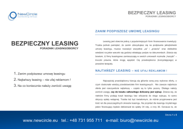 BEZPIECZNY LEASING PORADNIK LESINGOBIORCY ZANIM PODPISZESZ UMOWĘ LEASINGU Leasing jest obecnie jedną z popularniejszych form finansowania inwestycji. BEZPIECZNY LEASING Trzeba jednak pamiętać, że zanim zdecydujesz się na podpisanie jakiejkolwiek PORADNIK LEASINGOBIORCY umowy leasingu, musisz rozważyć wszystkie „za” i „przeciw” oraz dokładnie wiedzieć na jakie warunki się godzisz składając podpis na dokumentach. Zdarza się bowiem, iż firmy leasingowe zamieszczają w swoich umowach rozmaite „haczyki” – kruczki prawne, które mogą wpędzić Cię przedsiębiorco (korzystającego) w poważne tarapaty. 1. Zanim podpiszesz umowę leasingu 2. Najtańszy leasing – nie ufaj reklamom ! 3. Na co koniecznie należy zwrócić uwagę NAJTAŃSZY LEASING – NIE UFAJ REKLAMOM ! Najczęściej przedsiębiorcy kierują się głównie ceną przy wyborze oferty, o czym doskonale wiedzą przedstawiciele firm leasingowych. Nie zawsze najtańsza oferta jest rzeczywiście najtańszą – często są to tylko pozory. Dlatego należy zwrócić uwagę, czy do kosztu całkowitego doliczony jest wykup. Zdarza się, że niektóre firmy podają koszt leasingu bez wliczania do niego wykupu, to samo dotyczy opłaty wstępnej. Trzeba też być świadomym, że różnie przyjmowana jest ilość rat dla poszczególnych okresów leasingu. Na przykład dla leasingu trzyletniego jeden finansujący będzie deklarował do spłaty 34 raty, a inny 36. Oznacza to, że Strona 1 z 5 www.newcircle.eu tel.: +48 731 955 711 e-mail: [email protected] BEZPIECZNY LEASING PORADNIK LESINGOBIORCY koszt całkowity w jednej ofercie będzie mniejszy, podczas gdy wysokość raty będzie Również bardzo ważnym elementem umowy leasingu jest tabela opłat i prowizji, większa i odwrotnie. która informuje o kosztach dodatkowych, na jakie może być narażony przedsiębiorca lub jakie będzie zmuszony ponieść w trakcie realizowania umowy Obowiązkowo przed zawarciem umowy leasingu należy zapoznać się z ogólnymi warunkami leasingu (OWUL) które regulują m. in. sposób ustalania opłat leasingowych - w jakich okolicznościach mogą ulec zmianie (szczególnie w umowach dewizowych), na kiedy są wymagalne (harmonogram spłat), w jaki sposób następuje rozliczenie zaistniałej szkody całkowitej lub częściowej, jak postąpić w przypadku kradzieży przedmiotu leasingu, w jaki sposób jest zagospodarowywany wrak, co się dzieje z nadwyżką z odszkodowania, jeżeli taka powstanie. Zawierają również informacje na jakich zasadach można zakończyć umowę leasingu i w jaki sposób przeprowadzić cesje lub wcześniejszy wykup. Ogólne warunki leasingu zawierają regulację dotyczącą nabycia i odbioru przedmiotu od dostawcy oraz leasingu. Do takich dodatkowych kosztów (w zależności od firmy leasingowej), którymi może zostać obciążony przedsiębiorca można zaliczyć m. in. zgodę na wyjazd za granicę (np. 200PLN), zgodę na używanie (podnajem) przedmiotu leasingu osobie trzeciej (np. 500PLN), refakturę kosztów mandatu (np. kwota mandatu + 200PN), wezwanie do zapłaty (np. 200PLN), zgodę na zewnętrze ubezpieczenie (np. 1.000PLN), koszty rejestracji (np. 500PLN). Niejednokrotnie koszty dodatkowe są niemałe i dlatego też należy zapoznawać się obowiązkowo z tabelą opłat i prowizji, szczególnie że niektóre tabele zawierają ponad 80 pozycji – sytuacji, w których przedsiębiorca może zostać obciążony dodatkowymi kosztami, z których często nawet nie zdaje sobie sprawy. zasady i obowiązki związane z używaniem przedmiotu leasingu, informacje o zabezpieczeniach w umowach leasingu np. weksle, poręczyciele, depozyty Kolejnym elementem umowy leasingu, nad którym należy się zastanowić, jest gwarancyjne. Trzeba także zwrócić uwagę, w szczególności przy umowach ubezpieczenie przedmiotu leasingu. Przedsiębiorca musi podjąć decyzję czy walutowych, jakie będą zastosowane kursy do przeliczeń i których banków. ubezpieczyć się samemu czy skorzystać z oferty ubezpieczenia proponowanego przez firmy leasingowe. Niektórzy finansujący za zgodę na ubezpieczenie Niewątpliwie problemem dla przedsiębiorców jest fakt, że każda firma leasingowa ma swoje własne ogólne warunki umów leasingowych, które systematycznie ulegają zmianom i trzeba się z nimi zapoznawać niezależnie i indywidualnie. indywidualne mogą zażądać opłaty od przedsiębiorcy nawet w wysokości tysiąca złotych, a w skrajnych przypadkach mogą nawet odmówić zawarcia umowy leasingu jeżeli przedmiot nie będzie ubezpieczany przez nich. Strona 2 z 5 www.newcircle.eu tel.: +48 731 955 711 e-mail: [email protected] BEZPIECZNY LEASING PORADNIK LESINGOBIORCY Niezależnie od tego, kto będzie ubezpieczał przedmiot umowy należy zastanowić warunki, a w tym na dodatkowe opłaty, na które na pewno nie wyrazili by zgody, się nad zakresem i dodatkowymi rozszerzeniami które będą proponowane jeżeli byli by świadomi tego, co podpisują. przedsiębiorcy, takimi jak ochrona prawna, straty finansowe (GAP), polisa na Po fakcie często korzystający wzywany jest do zapłaty za coś, o czym przy wypadek śmierci, wszelkiego rodzaju NWW, assistance. podpisaniu umowy w ogóle nie wspomniano. Wtedy na wycofanie się z umowy i jej Koszty, jakie musi ponieś przedsiębiorca związane z ubezpieczeniami nie są małe, renegocjowanie jest już za późno. Na to wszystko jest czas przed podpasaniem dlatego należy dokładnie umowy. przeanalizować oferowane polisy i ich zakresy. Ubezpieczyciele, szczególnie firmy leasingowe, muszą dbać o swoje wyniki, więc nie będą chętnie informować o takich zapisach w umowie, które mogą odwieść przedsiębiorcę od ich oferty. Warto zastanowić się nad skorzystaniem z usług Przedsiębiorca przed podpisaniem umowy może zażądać dostarczenia wcześniej wszystkich dokumentów związanych z umową leasingu. Powinien mieć czas na zapoznanie się z nimi. Trzeba to robić ab