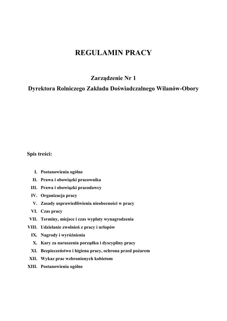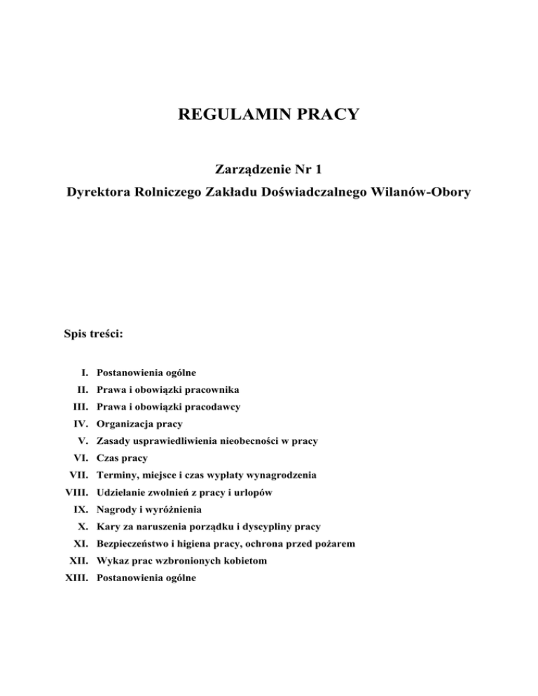 REGULAMIN PRACY Zarządzenie Nr 1 Dyrektora Rolniczego Zakładu Doświadczalnego Wilanów-Obory Spis treści: I. Postanowienia ogólne II. Prawa i obowiązki pracownika III. Prawa i obowiązki pracodawcy IV. Organizacja pracy V. Zasady usprawiedliwienia nieobecności w pracy VI. Czas pracy VII. Terminy, miejsce i czas wypłaty wynagrodzenia VIII. Udzielanie zwolnień z pracy i urlopów IX. Nagrody i wyróżnienia X. Kary za naruszenia porządku i dyscypliny pracy XI. Bezpieczeństwo i higiena pracy, ochrona przed pożarem XII. Wykaz prac wzbronionych kobietom XIII. Postanowienia ogólne I Postanowienia ogólne Niniejszy regulamin pracy opracowano i przyjęto na podstawie: §1. 1. Ustawa z dnia 26 czerwca 1974r. – Kodeks pracy (tj. Dz. U. z 1998r. Nr 21, poz. 94 z późn. zmianami) 2. Ustawa z dnia 27 lipca 2005r. – Prawo o szkolnictwie wyższym ( Dz. U. 164 z dnia 30 sierpnia 2005r., poz. 1365 z poźń. zmianami) 3. Rozporządzenia MPiPS z 26 września 1997r. w sprawie ogólnych przepisów bezpieczeństwa i higieny pracy (Dz. U. z 2003r. nr 169, poz. 1650 ze zm.) 4. Ustawa z dnia 08.04.2010r. o ochronie zdrowia przed następstwami używania tytoniu i wyrobów tytoniowych (Dz. U. 2010, Nr.8 , poz. 520) 5. Rozporządzenie MIPS z dnia 15 maja 1996r. w sprawie sposobu usprawiedliwienia nieobecności w pracy oraz udzielania pracownikom zwolnień od pracy (Dz. U. Nr 60,poz. 281) 6. Ustawa z dnia 26 października 1982r. o wychowaniu w trzeźwości i przeciwdziałaniu alkoholizmowi ( Dz. U. z 2012 poz. 1356) 7. Rozporządzenie RM z dnia 28 maja 1996r. w sprawie profilaktycznych posiłków i napojów ( Dz. U. 60, poz. 279) 8. Rozporządzenie RM z dnia 24 sierpnia 2004r. w sprawie wykazu prac wzbronionych młodocianym i warunków ich zatrudniania przy niektórych z tych prac ( Dz. U. 200, poz. 2047 z poźń. Zmianami) §2. 1. Regulamin pracy ustala organizację i porządek w procesie pracy oraz związane z tym prawa i obowiązki pracodawcy i pracowników. 2. W sprawach nie ujętych w regulaminie zastosowanie mają przepisy kodeksu pracy oraz obowiązujące przepisy prawa. §3. Regulamin pracy ustala Dyrektor Zakładu ponieważ w Zakładzie nie działa organizacja związkowa. §4. Ilekroć w Regulaminie Pracy jest mowa o: a. Zakładzie - należy przez to rozumieć: Szkoła Główna Gospodarstwa Wiejskiego w Warszawie Rolniczy Zakład Doświadczalny Wilanów-Obory reprezentowany przez Dyrektora Zakładu b. Dyrektor Zakładu - należy przez to rozumieć: Administratora Zakładu i innego pracownika upoważnionego do działania w określonym zakresie w imieniu Zakładu. 2 c. Pracownik – należy przez to rozumieć osoby zatrudnione na podstawie umowy o pracę (bez względu na rodzaj). d. Każdy pracownik przed dopuszczeniem do pracy podlega zaznajomieniu z Regulaminem oraz przepisami o równym traktowaniu w zatrudnieniu. Oświadczenie zapoznania się z treścią Regulaminu oraz przepisami o równym traktowaniu, w zatrudnieniu, zaopatrzone w podpis pracownika i datę zostanie dołączone do akt osobowych. §5. Przepisy niniejszego regulaminu pracy obowiązują wszystkich pracowników Zakładu o których mowa w art. 2. Kodeksu pracy, bez względu na stanowisko, rodzaj i wymiar czasu pracy oraz bez względu na okres na jaki zawarto umowę o pracę. §6. 1. Wszelkich informacji wychodzących na zewnątrz zakładu pracy udziela Dyrektor Zakładu lub pisemnie upoważnione przez niego osoby. 2. Bez zgody Dyrektora Zakładu lub osoby pisemnie przez niego upoważnionej nie można wydawać na zewnątrz ani udostępniać nieupoważnionym osobom dokumentów i ich kserokopii, zawierających tajemnice gospodarcze, służbowe i państwowe, w tym związane z ochroną dóbr osobistych. 3. Osoby upoważnione na podstawie odrębnych przepisów do przeprowadzania kontroli z działalności pracodawcy pracy mają prawo do czynności kontrolnych po uprzednim sprawdzeniu dokumentów uprawniających do kontroli i zawiadomieniu o kontroli Dyrektora Zakładu lub jego zastępcy w razie ich nieobecności kierownika kontrolowanej komórki organizacyjnej. Udostępnieniu i kopiowaniu podlegają tylko te dokumenty, które są niezbędne do wykonania kontroli. II Prawa i obowiązki pracownika §7. 1 . Pracownik jest obowiązany wykonywać pracę sumiennie i starannie oraz stosować się do poleceń przełożonych, które dotyczą pracy i nie są sprzeczne z przepisami prawa pracy lub z umową o pracę, a także jest obowiązany wykorzystywać czas pracy w pełni na pracę zawodową. 3 2.Podstawowym obowiązkiem pracownika jest: 1/ rzetelne i efektywne wykonywanie pracy, 2/ przestrzeganie obowiązującego w zakładzie pracy regulaminu pracy i ustalonego w miejscu pracy porządku, 3/ przestrzeganie ustalonego czasu pracy w Zakładzie, 4/ przestrzeganie przepisów oraz zasad bezpieczeństwa i higieny pracy, a także przepisów przeciwpożarowych, 5/ przestrzeganie zasad współżycia społecznego w zakładzie pracy , 6/ dbanie o dobro pracodawcy, ochrona jego mienia oraz zachowanie w tajemnicy informacji, których ujawnienie mogłoby narazić pracodawcę na szkody, 7/ przestrzeganie tajemnicy służbowej, gospodarczej. 3. W związku z podstawowymi obowiązkami wymienionymi w ust. 2 każdy pracownik obowiązany jest: 1/ dążyć do uzyskania w pracy jak najlepszych wyników i przejawiać w tym celu inicjatywę, 2/ wykonywać pracę i polecenia przełożonych w sposób zgodny z prawem, wykorzystując do tego dostępne mu środki pracy, wiedzę i doświadczenie zawodowe oraz zasady racjonalnego, a w szczegó1ności ekonomicznego działania, 3/ znać przepisy oraz zasady bezpieczeństwa i higieny pracy oraz przepisy dotyczące ochrony przeciwpożarowej i przestrzeganie ich w procesie pracy, brać udział w szkoleniach, instruktarzach oraz stosować się do poleceń przełożonego w tym zakresie, 4/ używać zgodnie z przeznaczeniem przydzielonej mu odzieży ochronnej i roboczej oraz ochrony osobistych wyłącznie w pracy określonej w um
