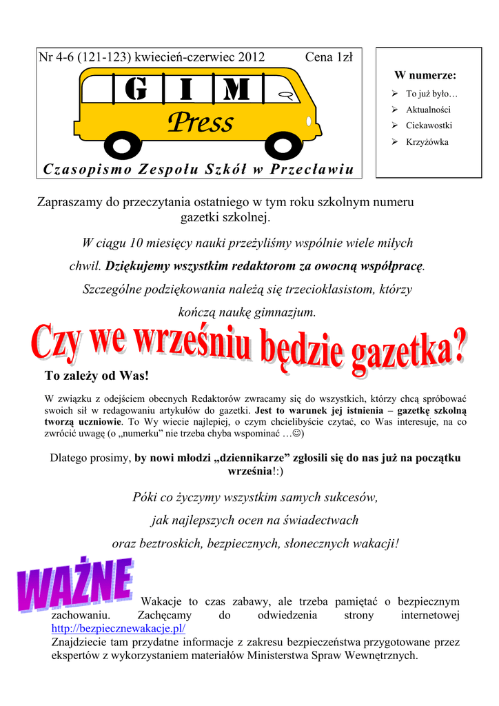 Nr 4-6 (121-123) kwiecień-czerwiec 2012 Cena 1zł W numerze: To już było… Aktualności Ciekawostki Krzyżówka Czasopismo Zespołu Szkół w Przecławiu Zapraszamy do przeczytania ostatniego w tym roku szkolnym numeru gazetki szkolnej. W ciągu 10 miesięcy nauki przeżyliśmy wspólnie wiele miłych chwil. Dziękujemy wszystkim redaktorom za owocną współpracę. Szczególne podziękowania należą się trzecioklasistom, którzy kończą naukę gimnazjum. To zależy od Was! W związku z odejściem obecnych Redaktorów zwracamy się do wszystkich, którzy chcą spróbować swoich sił w redagowaniu artykułów do gazetki. Jest to warunek jej istnienia – gazetkę szkolną tworzą uczniowie. To Wy wiecie najlepiej, o czym chcielibyście czytać, co Was interesuje, na co zwrócić uwagę (o „numerku” nie trzeba chyba wspominać …☺) Dlatego prosimy, by nowi młodzi „dziennikarze” zgłosili się do nas już na początku września!:) Póki co życzymy wszystkim samych sukcesów, jak najlepszych ocen na świadectwach oraz beztroskich, bezpiecznych, słonecznych wakacji! Wakacje to czas zabawy, ale trzeba pamiętać o bezpiecznym zachowaniu. Zachęcamy do odwiedzenia strony internetowej http://bezpiecznewakacje.pl/ Znajdziecie tam przydatne informacje z zakresu bezpieczeństwa przygotowane przez ekspertów z wykorzystaniem materiałów Ministerstwa Spraw Wewnętrznych. Str. 2 Czasopismo Zespołu Szkół w Przecławiu [email protected]ć.pl 27 marca 2012 odbył się w naszej szkole spektakl [email protected]ć.pl przygotowany przez Teatr Edukacji i Profilaktyki „Maska” w Krakowie. Był on poświęcony problemowi zagrożeń internetowych. Jego celem było uświadomienie uczniom, że wolność słowa nie oznacza braku odpowiedzialności za ich wypowiadanie, pokazanie, że anonimowość w sieci nie daje prawa do obrażania i poniżania innych. Bohaterka spektaklu, Olga założyła blog, na którym prezentowała swoje rysunki. Jej prace zostały docenione przez internautów, ale pojawiły się również zarzuty plagiatu i groźby. Zaczyna być traktowana jak oszustka. Brat Olgi jest natomiast uzależniony od gier komputerowych. Matka nie poświęca im zbyt wiele czasu i dopiero osoby z zewnątrz uświadamiają jej, że powinna pomóc swoim dzieciom. Na szczęście Oldze udaje się odzyskać wiarę w siebie, pokonać strach i dać siły do walki z przeciwnościami. Spektakl uzmysłowił nam, że mimo pozornej anonimowości policja może ustalić na podstawie IP, co zostało wysłane z danego komputera. Dowiedzieliśmy się również, ze groźby zamieszczone w Internecie są formą przemocy i podlegają karze. Jeśli sami nie umiemy poradzić sobie w trudnej sytuacji, warto zwrócić się o pomoc do dorosłych. I jeszcze jedno – czas spędzony przed komputerem często bywa czasem straconym. Watro poszukać innych form zabawy i odpoczynku. Młodzież Młodzież zapobiega pożarom W dniu 31 marca 2012r. w Rzędzianowicach odbył się XIV Powiatowy Turniej Wiedzy Pożarniczej, przeprowadzony w ramach Ogólnopolskiego Turnieju Wiedzy Pożarniczej „Młodzież Zapobiega Pożarom”. W sprawdzianie wiedzy pożarniczej brało udział 49 uczestników – laureatów eliminacji gminnych i miejskich. 20 z nich reprezentowało szkoły podstawowe, 18 – szkoły gimnazjalne i 11 – szkoły ponadgimnazjalne. Eliminacje przeprowadzone zostały w dwóch etapach: pisemnym i ustnym. Pierwszy etap Turnieju składał się z testu pisemnego, do którego przystąpiło 49 uczestników, natomiast do części ustnej zakwalifikowało się 15 osób. W trakcie oceny prac pisemnych młodzież wzięła udział w pokazie ratownictwa medycznego. Pokaz wzbudził duże zainteresowanie osób w nim uczestniczących, które pod czujnym okiem zawodowych ratowników medycznych mogły uczyć się i sprawdzić swoje umiejętności. Kolejnym etapem zmagań turniejowych był finał ustny; brało w nim udział po pięciu uczestników z trzech grup wiekowych, którzy w teście pisemnym sprawdzającym wiedzę uzyskali najlepsze wyniki. Ostateczne wyniki turnieju powiatowego przedstawiają się następująco: II grupa wiekowa – szkoły gimnazjalne 1. Oliwia Skawińska – Gimnazjum w Pławie 2. Aleksandra Bąba – OSP Tuszyma 3. Bernadeta Ciejka – Gimnazjum w Gawłuszowicach 4. Arkadiusz Krasoń – Gimnazjum w Przecławiu 5. Dominika Hyjek – Gimnazjum w Tuszowie Narodowym III grupa wiekowa – szkoły ponadgimnazjalne 1. Dawid Szałda – OSP Tuszyma 2. Alicja Kozioł – OSP Tuszyma 3. Barbara Uzar – OSP Padew Narodowa 4. Martyna Bednarz – OSP Wadowice Dolne 5. Olga Adamczyk – OSP Surowa GIMPRESS 4-6 (121-123) kwiecień-czerwiec 2012 Czasopismo Zespołu Szkół w Przecławiu Str. 3 Finał wojewódzki BRD 05.05.2012r reprezentacja naszej szkoły wygrała finał powiatowy „Ogólnopolskiego Turnieju Bezpieczeństwo w Ruchu Drogowym” w kategorii szkół gimnazjalnych. W dniu 24 maja 2012r. w Gimnazjum w Domaradzu odbył się finał wojewódzki „Ogólnopolskiego Turnieju Bezpieczeństwo w Ruchu Drogowym” w kategorii szkół gimnazjalnych, w którym drużyna z naszego gimnazjum reprezentowała powiat mielecki. W finałach wojewódzkich wzięło udział 25 drużyny. szkołę i powiat mielecki Naszą reprezentowali: Konrad Wojtaszek IIc, Rafał Ćwik Ia, Wojciech Wilk IIe. Każda uczestnik najpierw zmierzył się z testem z przepisów ruchu drogowego. Był to test wielokrotnego wyboru o dużym stopniu trudności. Po jego rozwiązaniu nasza ekipa zajmowała IX miejsce Kolejnym elementem rywalizacji była jazda po miasteczku ruchu drogowego. Jazda zgodna z zasadami ruchu drogowego nie sprawiła naszym uczniom żadnych problemów - nie popełnili żadnych błędów. Następnie jeden zawodnik wylosowany z drużyny udzielał pierwszej pomocy przedmedycznej. W naszej drużynie był nim Rafał Ćwik, który swoje zadanie wykonał, otrzymując maksymalną liczbę punktów. Ostatnim i najtrudniejszym etapem rywaliz