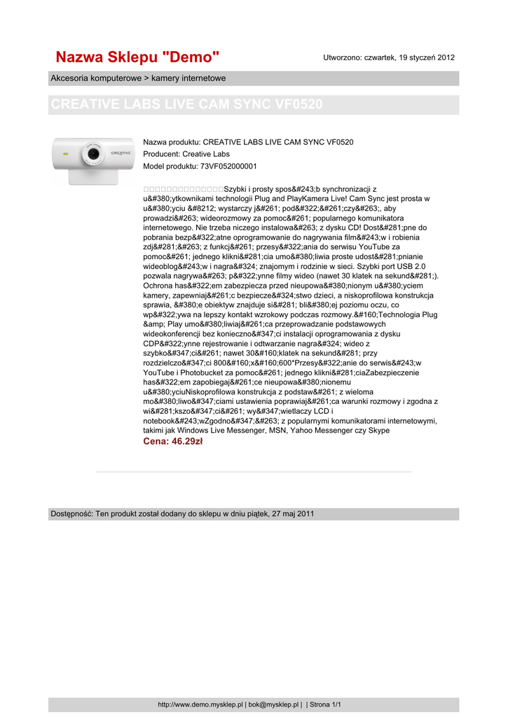 Nazwa Sklepu "Demo" Utworzono: czwartek, 19 styczeń 2012 Akcesoria komputerowe > kamery internetowe CREATIVE LABS LIVE CAM SYNC VF0520 Nazwa produktu: CREATIVE LABS LIVE CAM SYNC VF0520 Producent: Creative Labs Model produktu: 73VF052000001 Szybki i prosty sposób synchronizacji z użytkownikami technologii Plug and PlayKamera Live! Cam Sync jest prosta w użyciu — wystarczy ją podłączyć, aby prowadzić wideorozmowy za pomocą popularnego komunikatora internetowego. Nie trzeba niczego instalować z dysku CD! Dostępne do pobrania bezpłatne oprogramowanie do nagrywania filmów i robienia zdjęć z funkcją przesyłania do serwisu YouTube za pomocą jednego kliknięcia umożliwia proste udostępnianie wideoblogów i nagrań znajomym i rodzinie w sieci. Szybki port USB 2.0 pozwala nagrywać płynne filmy wideo (nawet 30 klatek na sekundę). Ochrona hasłem zabezpiecza przed nieupoważnionym użyciem kamery, zapewniając bezpieczeństwo dzieci, a niskoprofilowa konstrukcja sprawia, że obiektyw znajduje się bliżej poziomu oczu, co wpływa na lepszy kontakt wzrokowy podczas rozmowy. Technologia Plug & Play umożliwiająca przeprowadzanie podstawowych wideokonferencji bez konieczności instalacji oprogramowania z dysku CDPłynne rejestrowanie i odtwarzanie nagrań wideo z szybkością nawet 30 klatek na sekundę przy rozdzielczości 800 x 600*Przesyłanie do serwisów YouTube i Photobucket za pomocą jednego kliknięciaZabezpieczenie hasłem zapobiegające nieupoważnionemu użyciuNiskoprofilowa konstrukcja z podstawą z wieloma możliwościami ustawienia poprawiająca warunki rozmowy i zgodna z większością wyświetlaczy LCD i notebookówZgodność z popularnymi komunikatorami internetowymi, takimi jak Windows Live Messenger, MSN, Yahoo Messenger czy Skype Cena: 46.29zł Dostępność: Ten produkt został dodany do sklepu w dniu piątek, 27 maj 2011 http://www.demo.mysklep.pl | [email protected] | | Strona 1/1