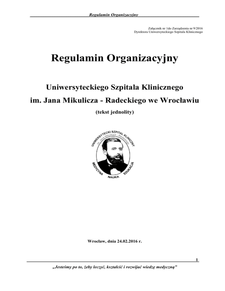 __________________________Regulamin Organizacyjny___________________________ Załącznik nr 1do Zarządzenia nr 9/2016 Dyrektora Uniwersyteckiego Szpitala Klinicznego Regulamin Organizacyjny Uniwersyteckiego Szpitala Klinicznego im. Jana Mikulicza - Radeckiego we Wrocławiu (tekst jednolity) Wrocław, dnia 24.02.2016 r. 1 „Jesteśmy po to, żeby leczyć, kształcić i rozwijać wiedzę medyczną” Regulamin Organizacyjny___________________________ SPIS TREŚCI ROZDZIAŁ I Postanowienia ogólne ......................................................................................................................................................................... 4 ROZDZIAŁ II Cele i zadania Szpitala ..................................................................................................................................................................... .... 8 ROZDZIAŁ III Przebieg procesu udzielania świadczeń ......................................................................................................................................................................... 10 ROZDZIAŁ IV Warunki współdziałania z innymi podmiotami leczniczymi w zakresie zapewnienia ciągłości leczenia pacjentów ............................................................................................................................................................... .......... 13 ROZDZIAŁ V Rodzaj działalności leczniczej oraz zakresy udzielanych świadczeń zdrowotnych ……………………………………………………………………………………......................................... 15 ROZDZIAŁ VI Porządek postępowania w ramach hospitalizacji ......................................................................................................................................................................... 22 ROZDZIAŁ VII Prawa i obowiązki pacjenta ......................................................................................................................................................................... 29 ROZDZIAŁ VIII Obowiązki Szpitala w razie śmierci pacjenta ......................................................................................................................................................................... 35 ROZDZIAŁ IX Depozyt rzeczy wartościowych ......................................................................................................................................................................... 39 ROZDZIAŁ X Dokumentacja medyczna ......................................................................................................................................................................... 41 2 „Jesteśmy po to, żeby leczyć, kształcić i rozwijać wiedzę medyczną” Regulamin Organizacyjny___________________________ ROZDZIAŁ XI Zasady kierowania Szpitalem ......................................................................................................................................................................... 46 ROZDZIAŁ XII Zakres zadań pionu Dyrektora ......................................................................................................................................................................... 50 ROZDZIAŁ XIII Zakres zadań pionu Zastępcy Dyrektora ds. Lecznictwa ......................................................................................................................................................................... 55 ROZDZIAŁ XIV Zakres zadań pionu Zastępcy Dyrektora ds. Lecznictwa Otwartego ......................................................................................................................................................................... 70 ROZDZIAŁ XV Zakres zadań pionu Zastępcy Dyrektora ds. Pielęgniarstwa ......................................................................................................................................................................... 79 ROZDZIAŁ XVI Zakres zadań pionu Zastępcy Dyrektora ds. Sprzedaży …………………………………………………………................................................................................. 85 ROZDZIAŁ XVII Zakres zadań pionu Zastępcy Dyrektora ds. Finansowych ................................................................................................................................ ......................................... 91 ROZDZIAŁ XVIII Zakres zadań pionu Zastępcy Dyrektora ds. Administracji i Logistyki ............................................................................................................................... .......................................... 106 ROZDZIAŁ XIX Wspólne uprawnienia, obowiązki i odpowiedzialność kierowników komórek organizacyjnych ......................................................................................................................................................................... 121 ROZDZIAŁ XX Postanowienia końcowe ………………………..................................................................................................................................... 3 „Jesteśmy po to, żeby leczyć, kształcić i rozwijać wiedzę medyczną” 124 Regulamin Organizacyjny___________________________ ROZDZIAŁ I Postanowienia ogólne §1 1. Zadania i funkcjonowanie Szpitala określają między innymi następujące przepisy prawne: 1) ustawa z dnia 15 kwietnia 2011 r. o działalności leczniczej (tj. Dz. U z 2015r., poz. 618 z późn. zm.) i wydanych na jej podstawie aktów wykonawczych, 2) ustawa z dnia 27 sierpnia 2004 r. o świadczeniach opieki zdrowotnej finansowanych ze środków publicznych (tj. Dz. U. z 2015 r. poz. 581 z późn. zm.) i wydanych na jej podstawie aktów wykonawczych, 3) ustawa z dnia 5 grudnia 1996 r. o zawodach lekarza i lekarza dentysty (tj. Dz. U. z 2015 r. poz. 464)